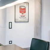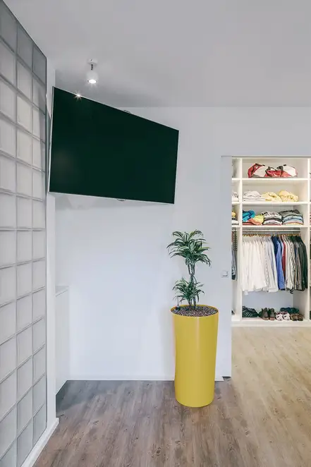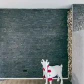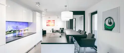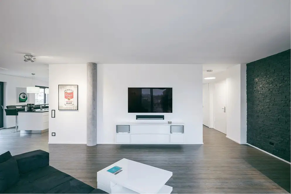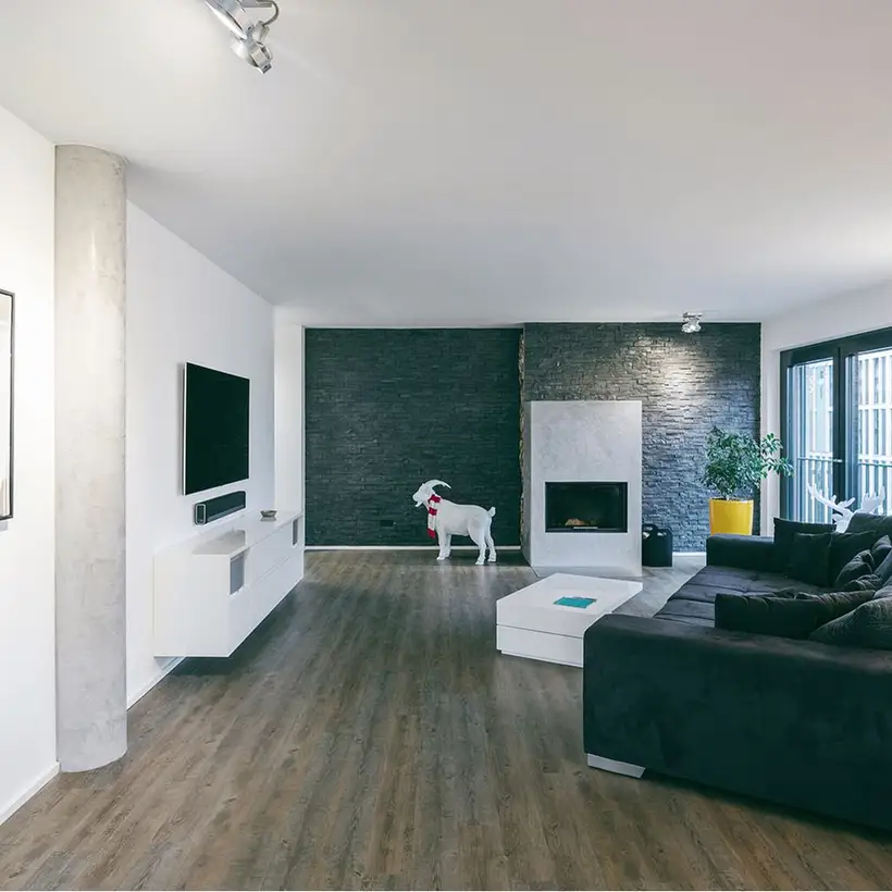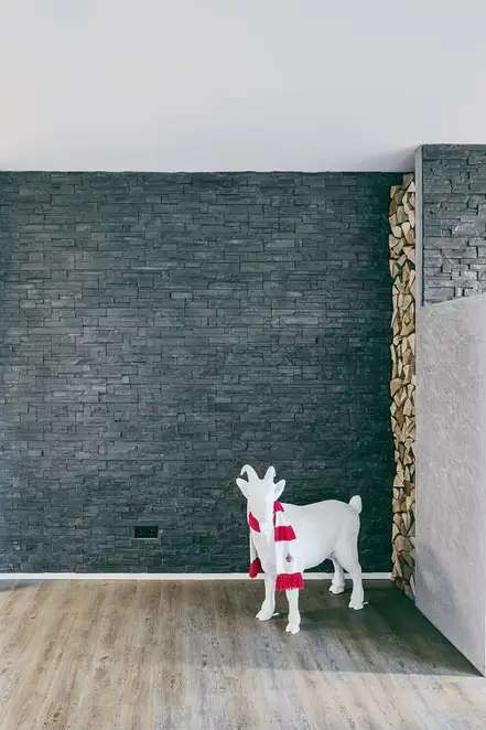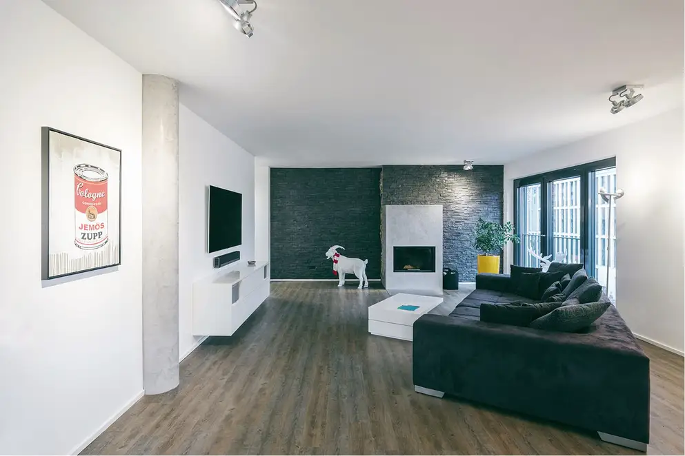 Im Innenraum eröffnen sich großzügige Räume und eine offene Wohnküche. Weiße Wände und weiße Möbel schaffen eine helle und freundliche Atmosphäre. Im Wohnzimmer beeindrucken eine Wand in anthrazitfarbener Steinoptik und ein großer Kamin. Dunkle Holzböden setzen einen Kontrast zu den hellen Wänden. Farbenfrohe Accessoires runden das Konzept des Interieurs ab. Das Highlight der Wohnung ist eine kleine aber moderne Sauna im Badezimmer.