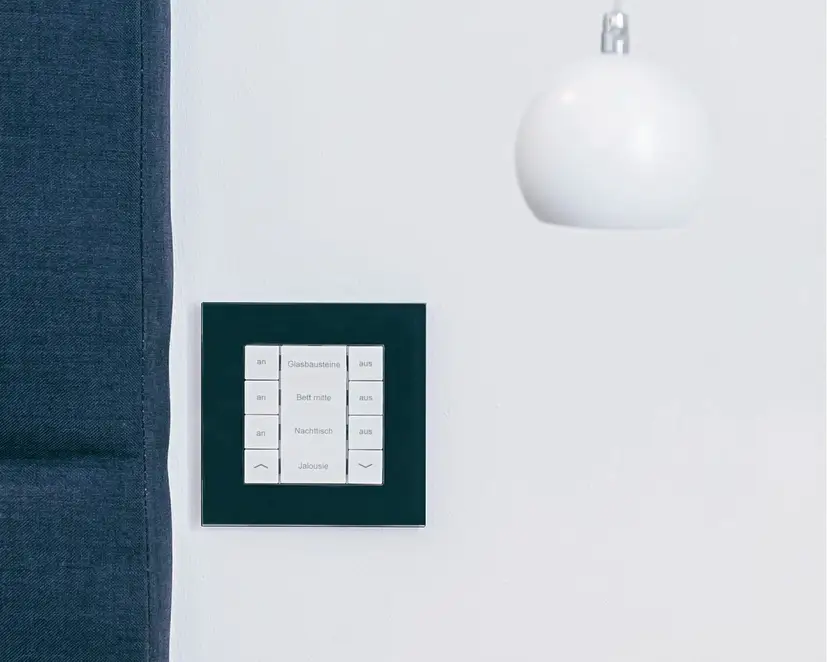 Per Funk werden Befehle zum Steuern von Licht und Jalousie übertragen, inklusive Szenenfunktionen. Die Bedienung erfolgt über großflächige Tasten; LEDs zeigen die Statusrückmeldung an. Über das GRAPHIC TOOL können die Tasten per Lasergravur oder Farbdruck individuell mit Bildern, Symbolen und Text gestaltet werden. Das unterstützt eine klare Funktionszuordnung.