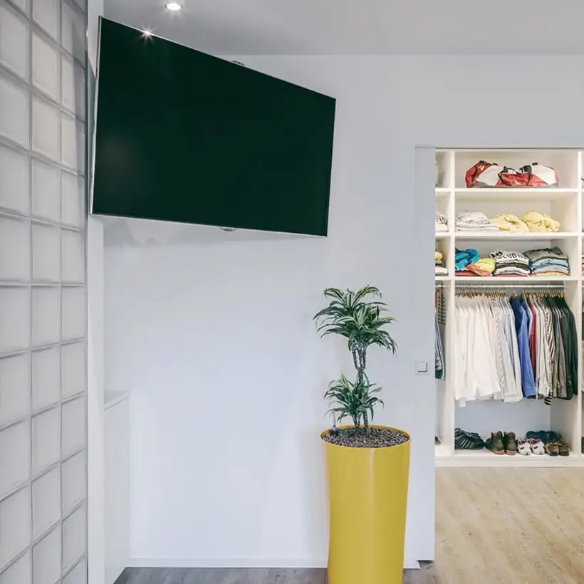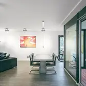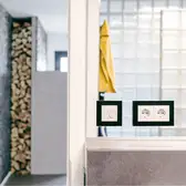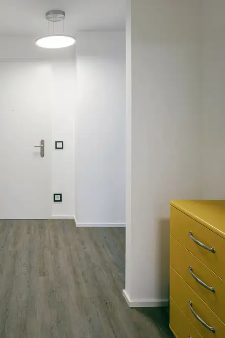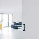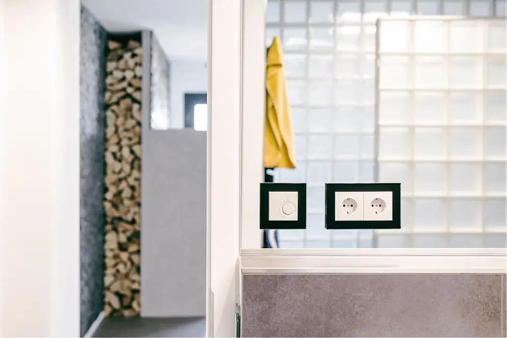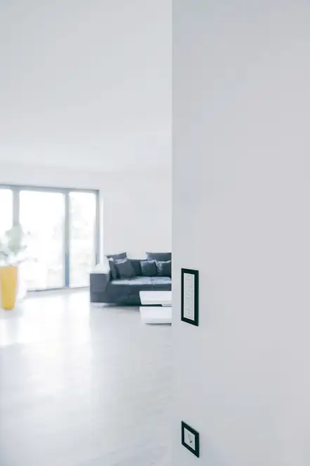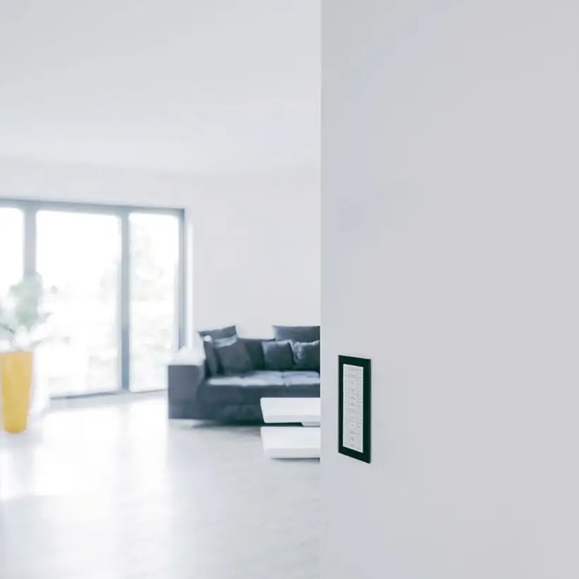 In allen Räumen wurden eNet Tastsensoren F 50 in LS 990 in Alpinweiß mit schwarzen LS Plus Glasrahmen von JUNG installiert. Die Lasergravur auf den Tastsensoren erleichtert die Bedienung und definiert die Funktionen der Tastsensoren. Durch Tastsensoren am Bett kann bequem das Licht im gesamten Schlafzimmer gesteuert werden – ohne nochmal aus dem Bett aufzustehen. Auch via Handy oder Tablet kann der Bauherr über die eNet SMART HOME App von unterwegs aus seine ganze Wohnung steuern.