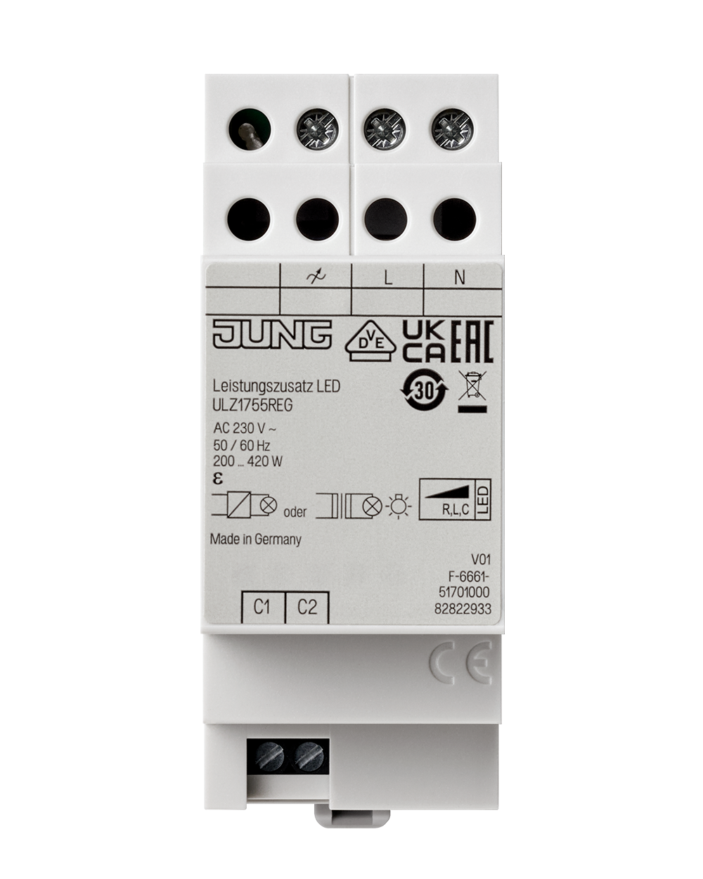 - Leistungserweiterung von den in der Referenzliste genannten Dimmern (Art.-Nrn.: UD 1755 REG, 1730 DD, 1731 DD, 1710 DE, 1711 DE, 1712 DE, FM UD 20250 UP, FM UD 5500 REG, FM UD 420250 REG, 3901 REGHE, 3902 REGHE, 39004 1S R, 39001 1S U)