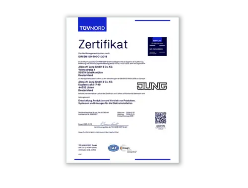 Kontinuierlich investiert JUNG in die Energieeffizienz der Fertigungsanlagen und Gebäude. Neben einem modernen Blockheizkraftwerk für die wirtschaftliche Erzeugung von Wärme und Strom, sorgt stromsparende LED-Lichttechnik mit tageslichtabhängiger Helligkeitsregulierung via DALI dafür, den Energieverbrauch zu optimieren. Ein werkseigenes Energie-Monitoring und regelmäßig von unabhängigen Experten durchgeführte Energieaudits zeigen weitere Einsparpotenziale auf, die kontinuierlich umgesetzt werden.