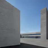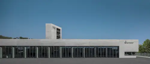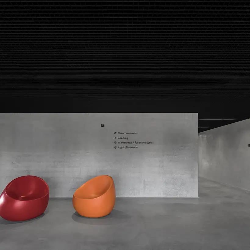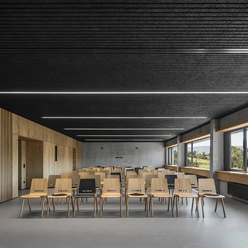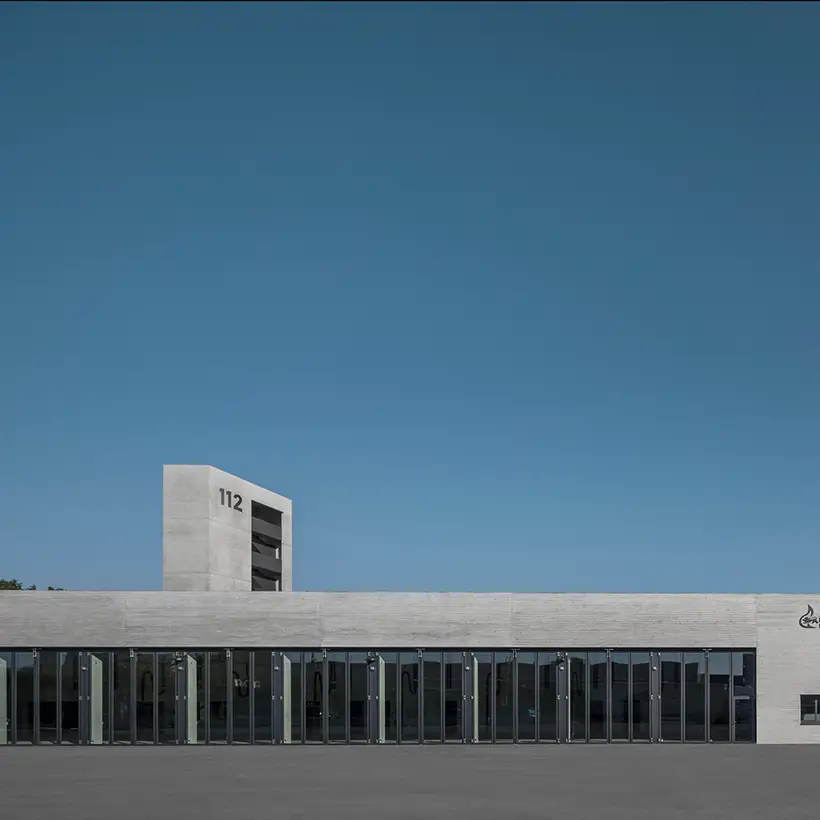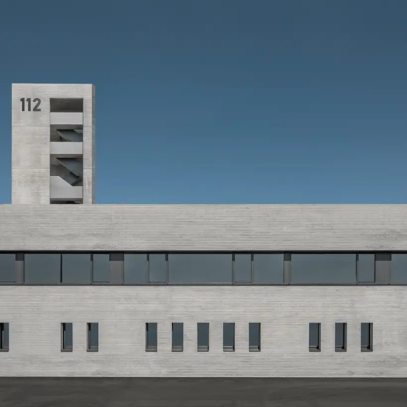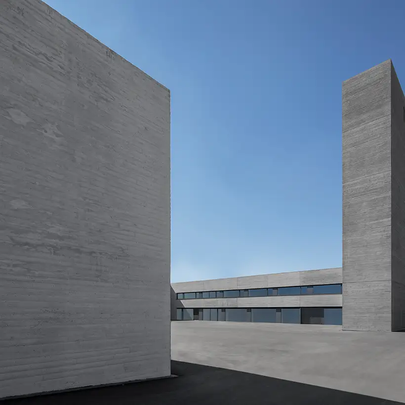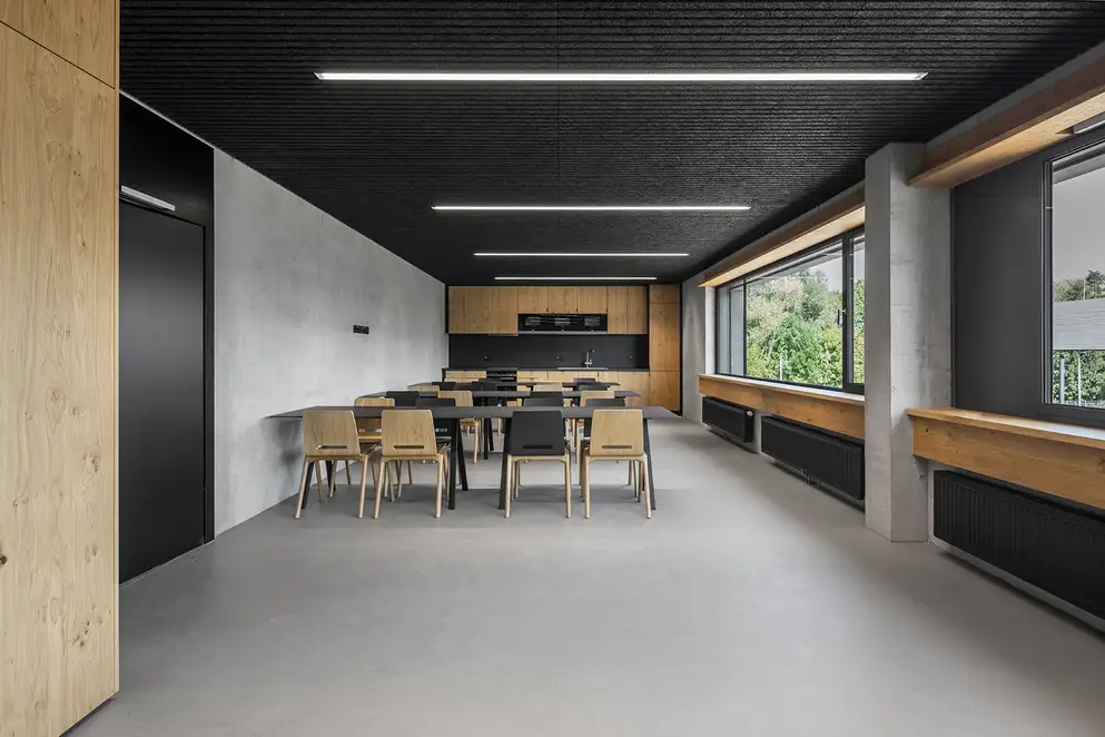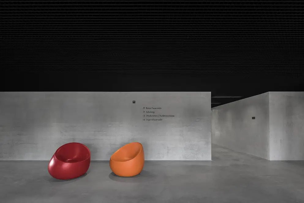Die unterschiedlichen Nutzungen sind an den Gebäuden ablesbar, werden aber gestalterisch durch die einheitliche Materialität aus Wärmedämmbeton miteinander verbunden. Bei der Konstruktion handelt es sich um eine Stahlbetonbauweise – insgesamt wurden 970 Tonnen Stahl, 1.000 Kubikmeter Normalbeton sowie 1.800 Kubikmeter Leichtbeton verbaut. Sowohl außen als auch innen haben die Gebäude durch das Zusammenspiel von Sichtbeton und schwarzem Aluminium an den Toren, Türen, Fenster- und Türprofilen eine gemeinsame gestalterische Ausprägung. Es entsteht ein Wechselspiel zwischen großflächig geschlossenen Wandflächen und den Verglasungen der Fensterbänder und Torflächen. Das innenarchitektonische Konzept setzt ganz auf die natürliche Schönheit des puren Materials. Die Musterung des Sichtbetons durch die Schalungselemente, die natürliche Maserung des Holzes an Fensterbänken und Innenwänden sowie die Grautöne des Estrichbodens werden durch die Perfektion der glatten, dunklen Metalloberflächen von Türen, Toren, Profilen, abgehängten Decken und Möbeln optisch verstärkt.