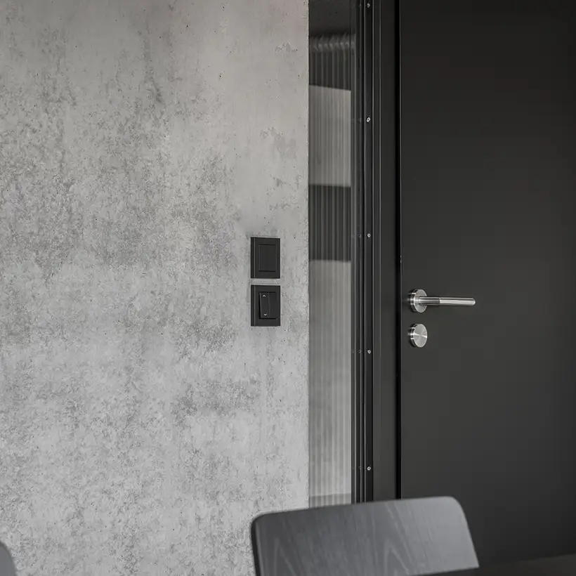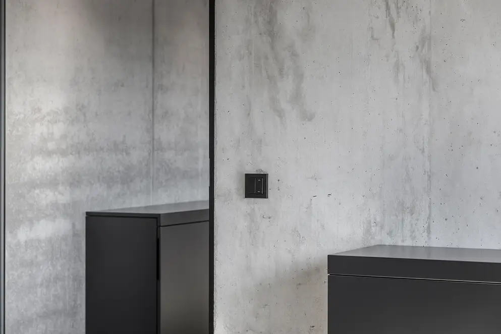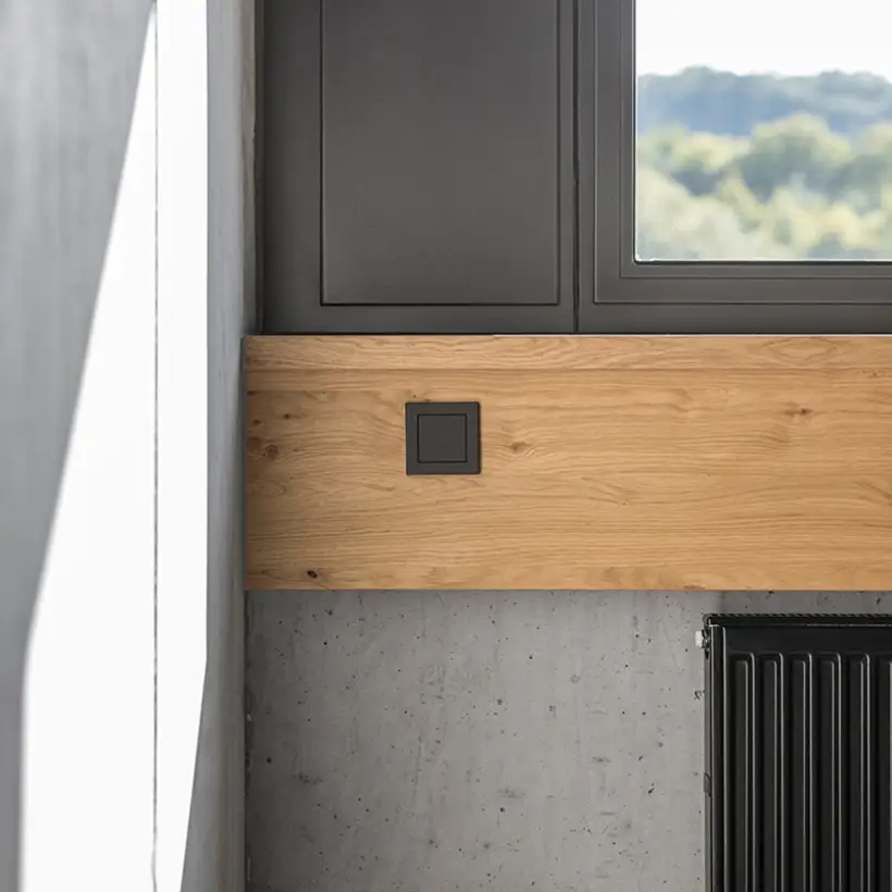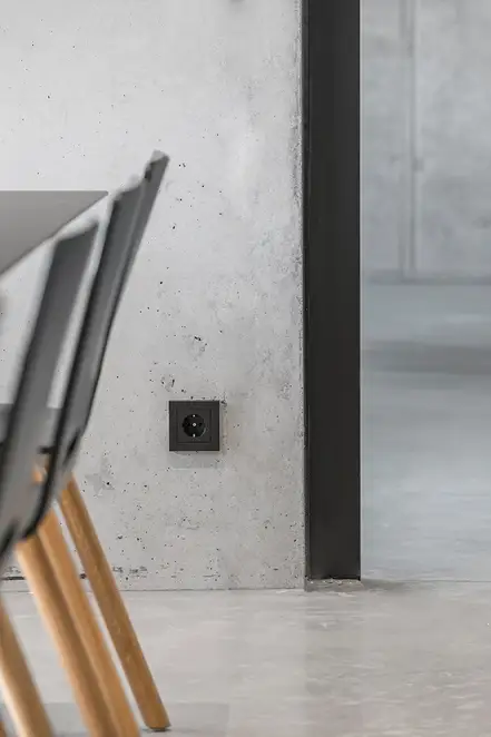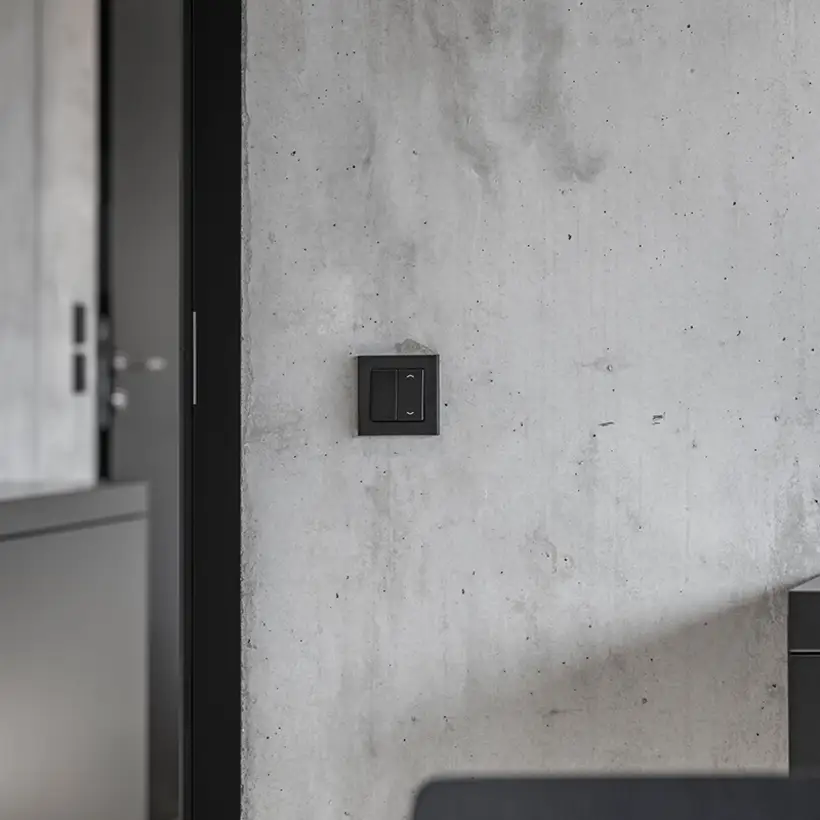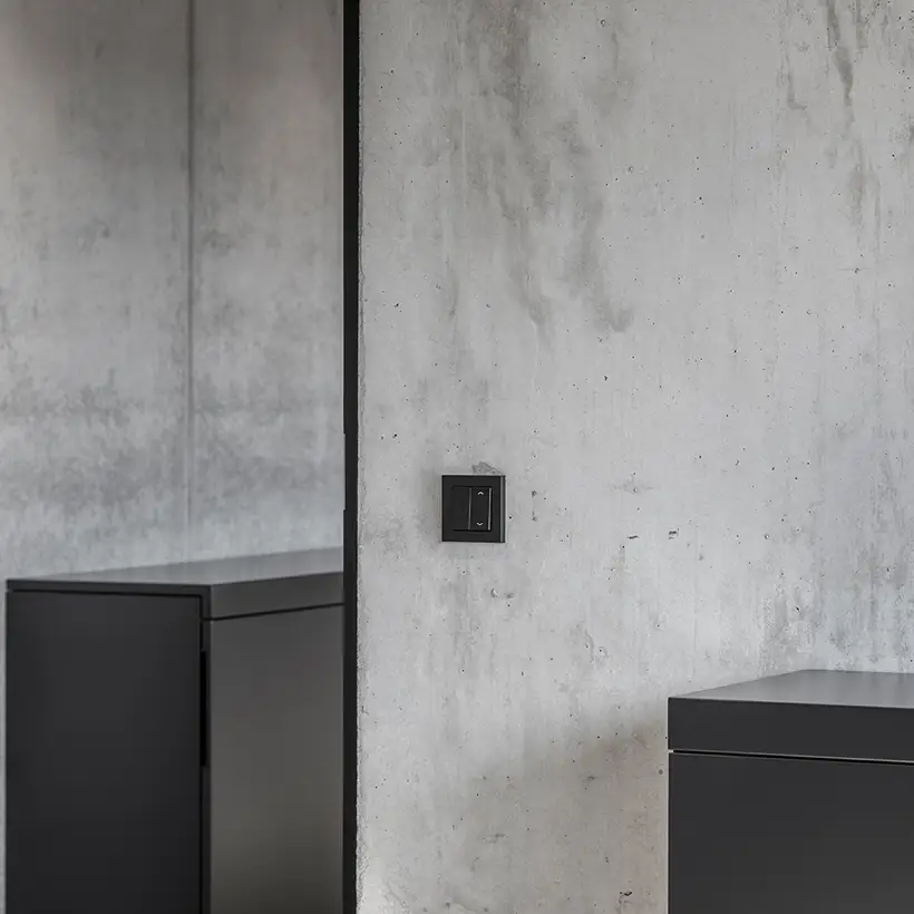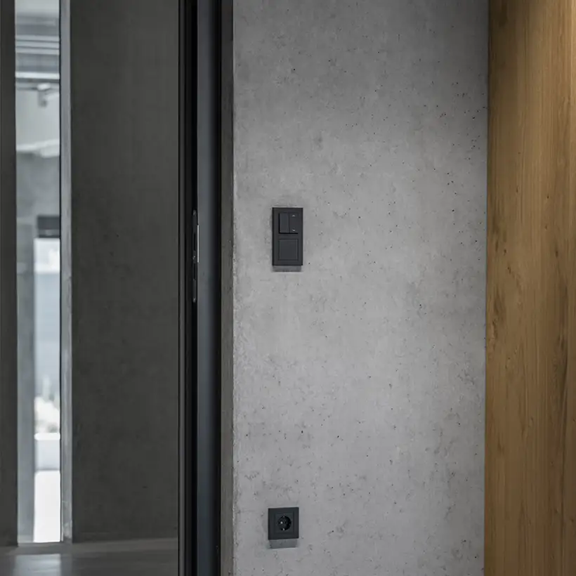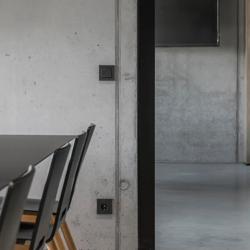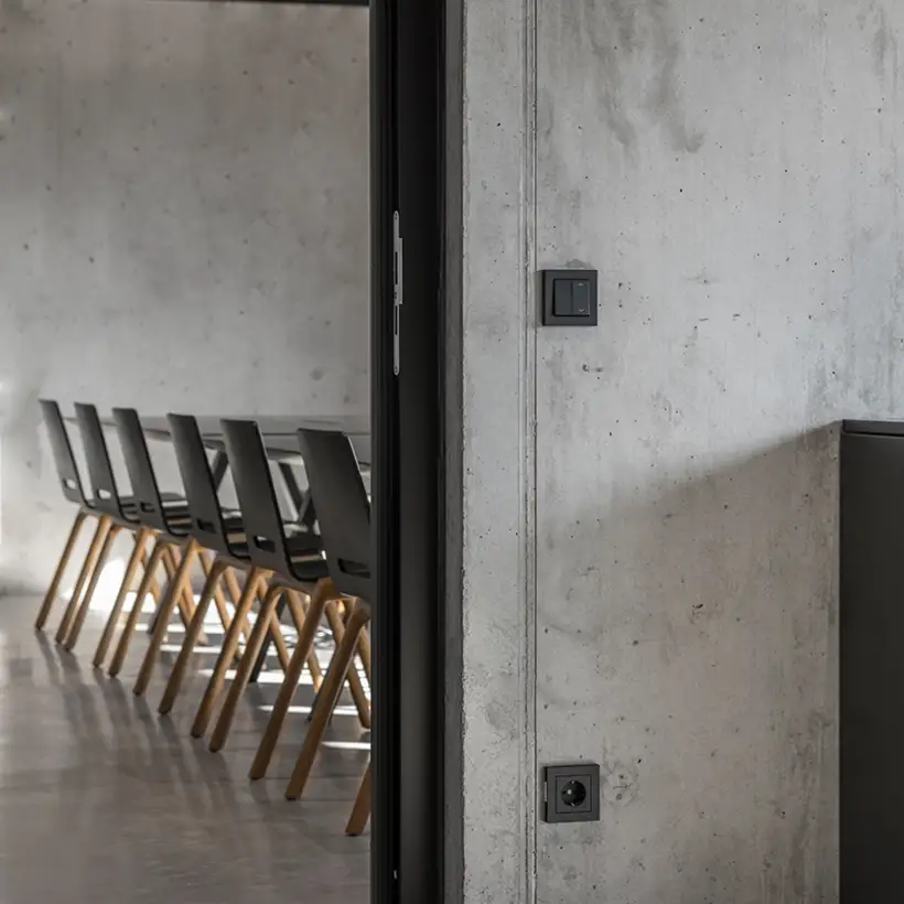 Im gesamten Gebäude wurden Elektrobedienelemente des Programms A 550 in Anthrazit matt von JUNG verwendet – direkt auf dem Sichtbeton platziert, wirkt die Unterputzvariante sehr elegant. Die Anordnung und das Design der Schalter gewinnen durch die allgemeine Reduktion der Elemente zusätzlich an Relevanz. Der Reiz der Gestaltung liegt in der auf die Spitze getriebenen Funktionalität: Nichts ist überflüssig, nichts ohne Zweck, jedes Element pragmatisch an dem Ort, wo es benötigt wird. Das Gebäude wurde von Kienle Beratende Ingenieure mit einer hochleistungsfähigen KNX Elektroinstallation smart ausgestattet. Das System integriert u.a. dimmbare LED-Leuchten, präsenzgesteuerte Beleuchtung, energieoptimierte Sonnenschutzsteuerung, Beschallungs- und Medientechnik sowie die Funktechnik. Selbstverständlich wurden auch sicherheitsrelevante Funktionen in das KNX System eingebunden, wie die Steuerung der Sicherheitsbeleuchtung, die Brandmeldeanlage oder die Zutrittskontrollanlage. Die Notstromversorgung erfolgt über eine Netzersatzanlage.