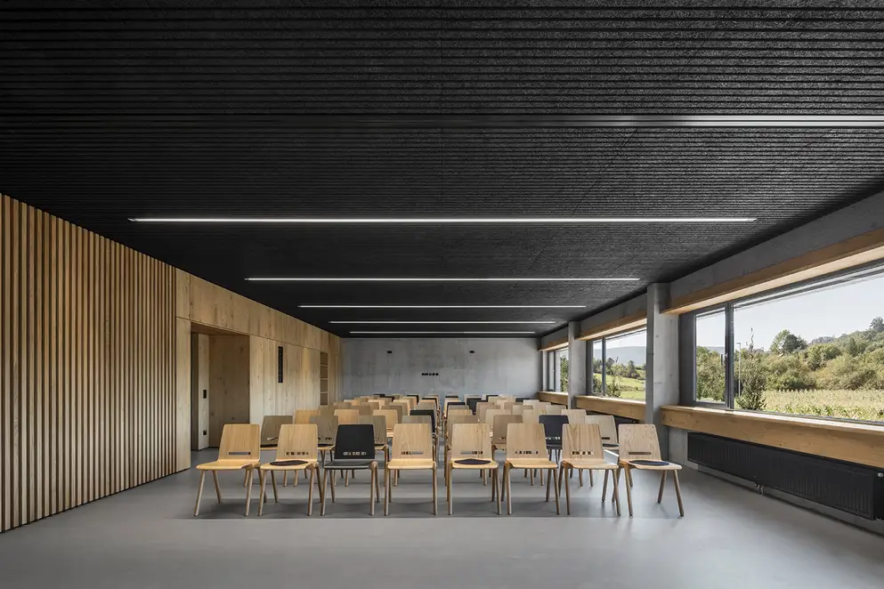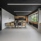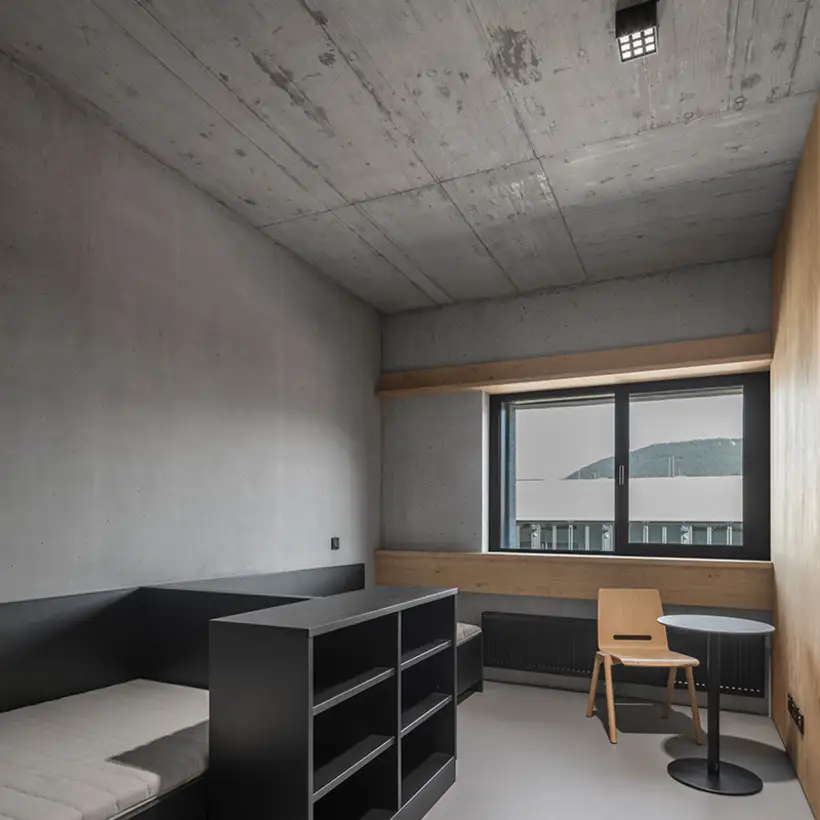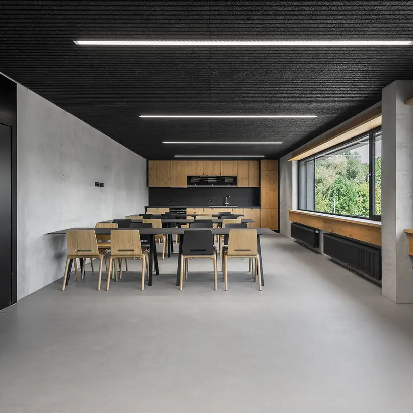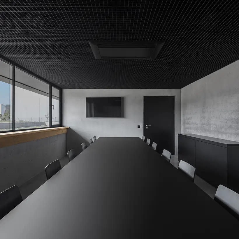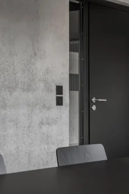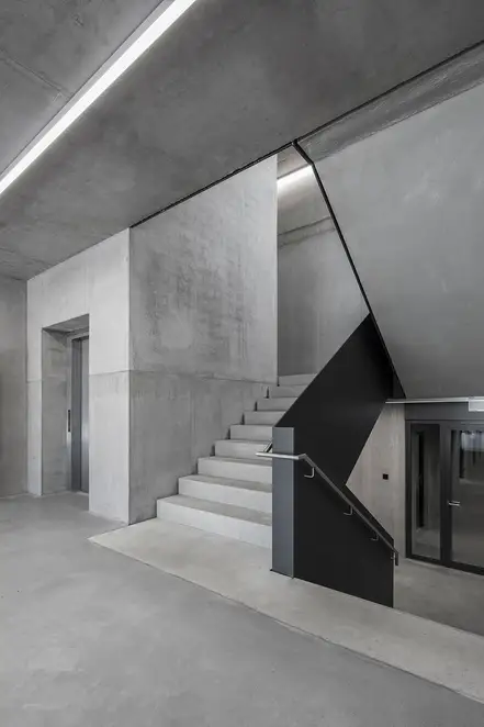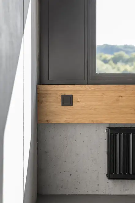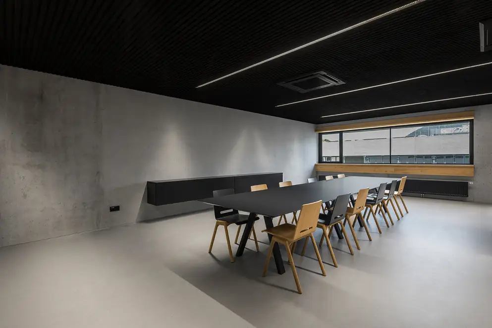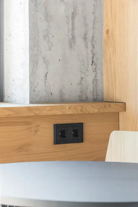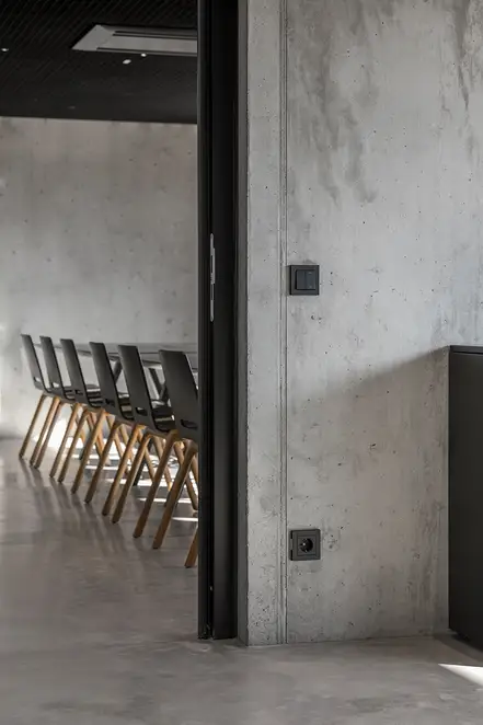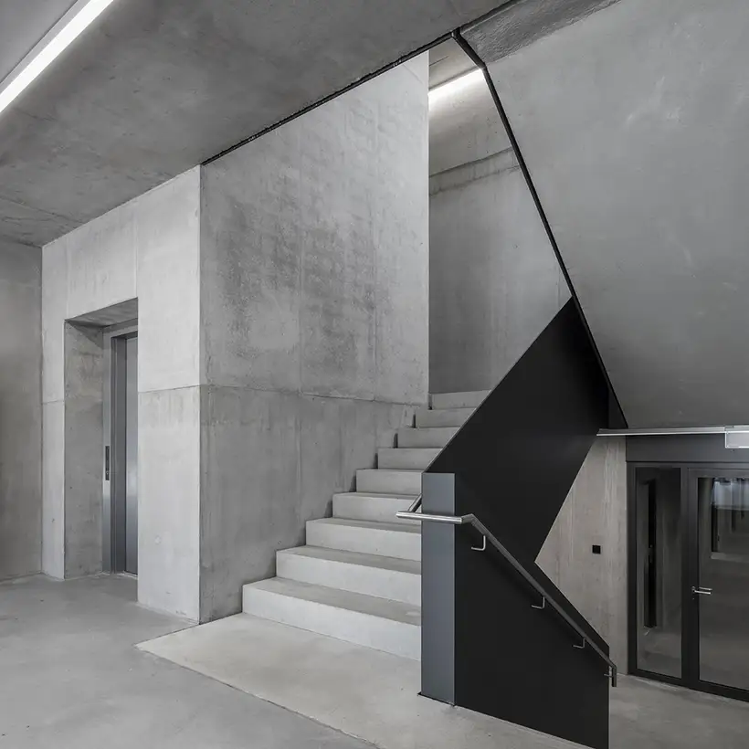Im gesamten Gebäude wurden Elektrobedienelemente des Programms A 550 in Anthrazit matt von JUNG verwendet – direkt auf dem Sichtbeton platziert, wirkt die Unterputzvariante sehr elegant. Die Anordnung und das Design der Schalter gewinnen durch die allgemeine Reduktion der Elemente zusätzlich an Relevanz. Der Reiz der Gestaltung liegt in der auf die Spitze getriebenen Funktionalität: Nichts ist überflüssig, nichts ohne Zweck, jedes Element pragmatisch an dem Ort, wo es benötigt wird. Das Gebäude wurde von Kienle Beratende Ingenieure mit einer hochleistungsfähigen KNX Elektroinstallation smart ausgestattet. Das System integriert u.a. dimmbare LED-Leuchten, präsenzgesteuerte Beleuchtung, energieoptimierte Sonnenschutzsteuerung, Beschallungs- und Medientechnik sowie die Funktechnik. Selbstverständlich wurden auch sicherheitsrelevante Funktionen in das KNX System eingebunden, wie die Steuerung der Sicherheitsbeleuchtung, die Brandmeldeanlage oder die Zutrittskontrollanlage. Die Notstromversorgung erfolgt über eine Netzersatzanlage.