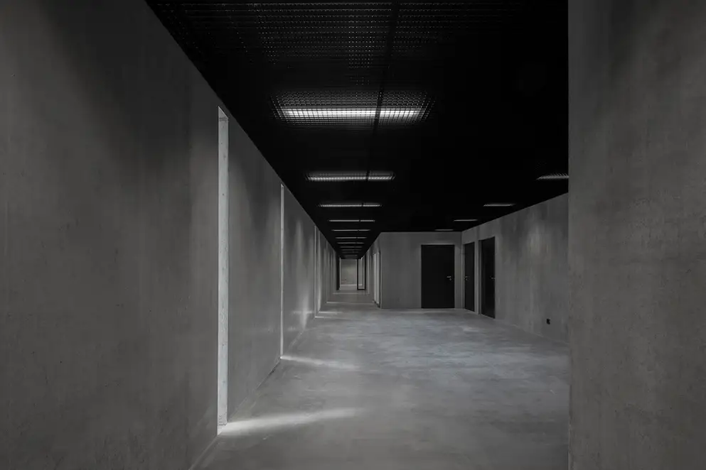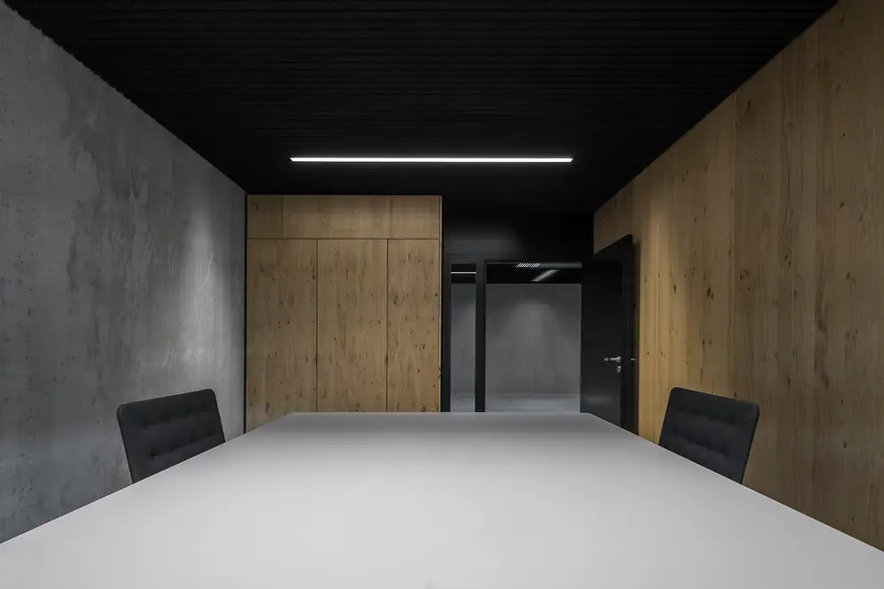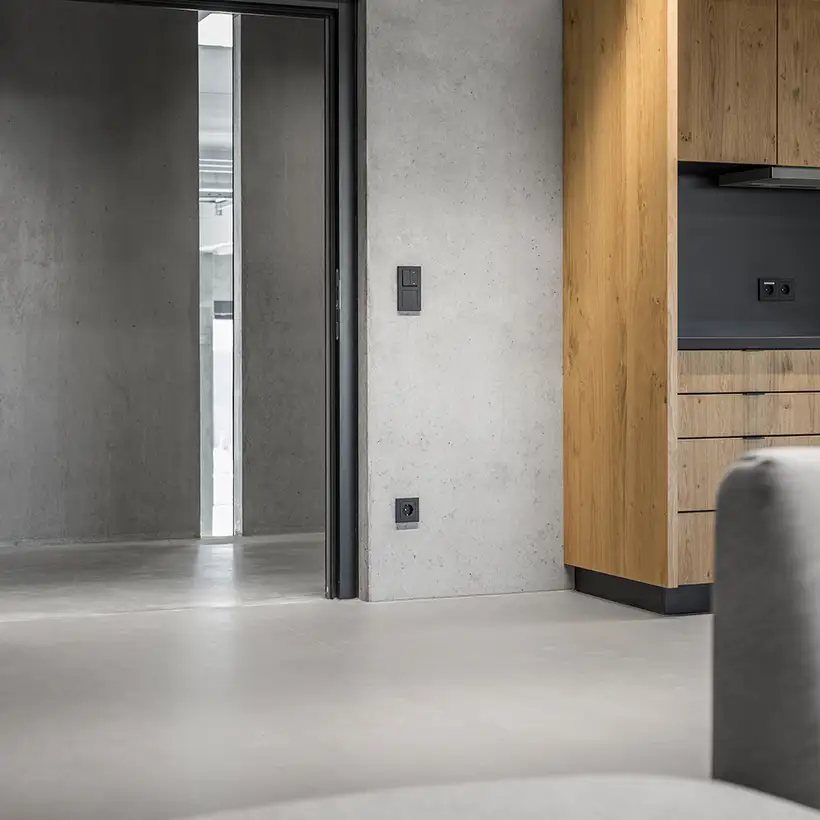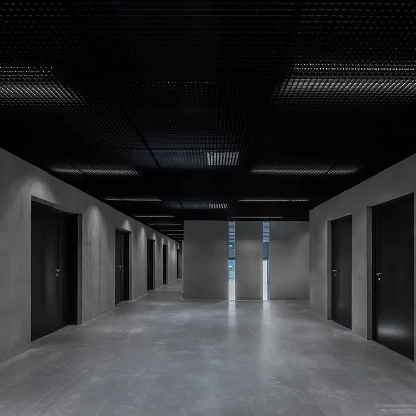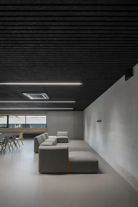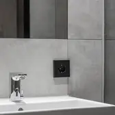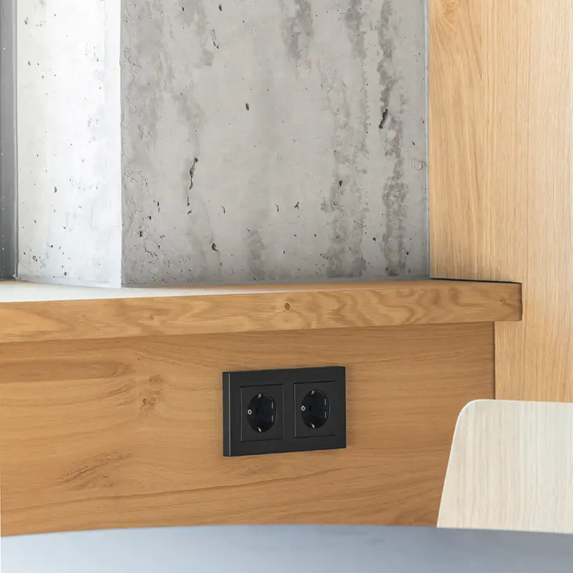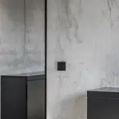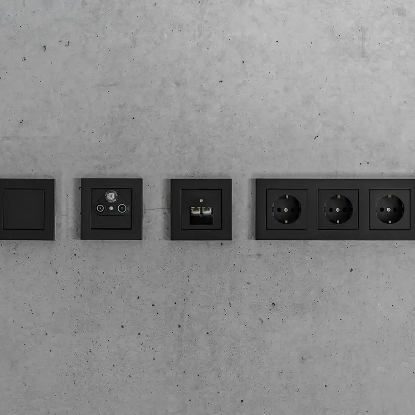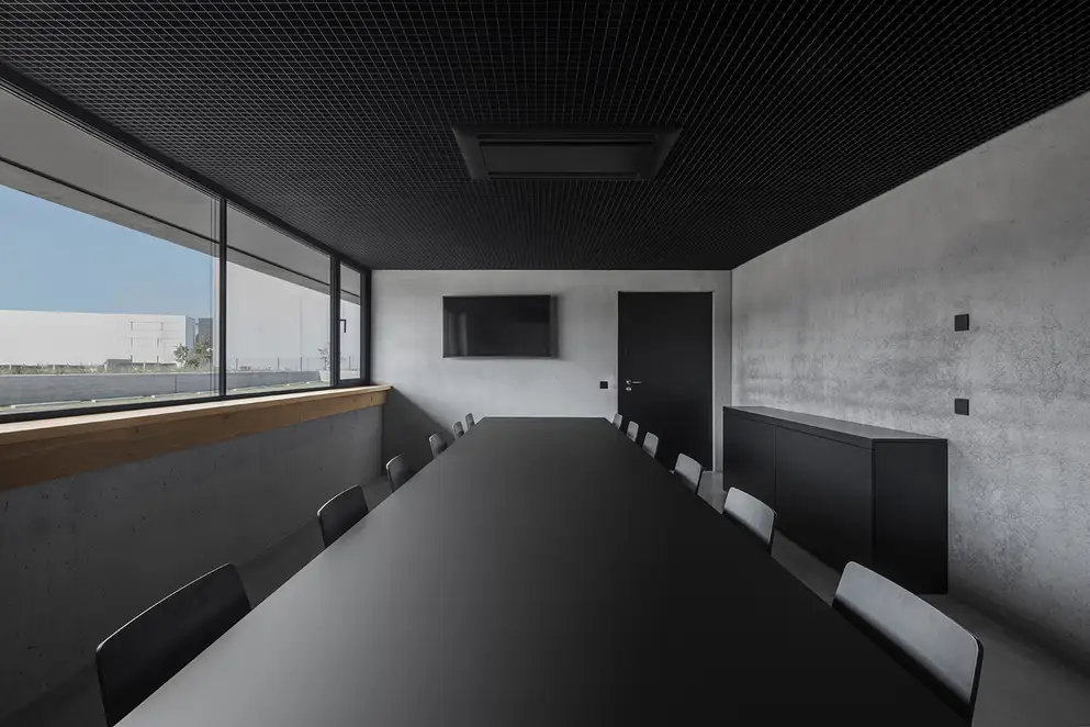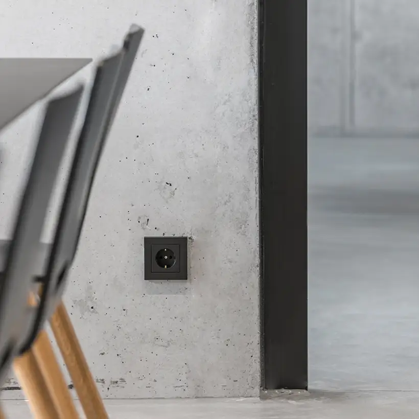 Im gesamten Gebäude wurden Elektrobedienelemente des Programms A 550 in Anthrazit matt von JUNG verwendet – direkt auf dem Sichtbeton platziert, wirkt die Unterputzvariante sehr elegant. Die Anordnung und das Design der Schalter gewinnen durch die allgemeine Reduktion der Elemente zusätzlich an Relevanz. Der Reiz der Gestaltung liegt in der auf die Spitze getriebenen Funktionalität: Nichts ist überflüssig, nichts ohne Zweck, jedes Element pragmatisch an dem Ort, wo es benötigt wird. Das Gebäude wurde von Kienle Beratende Ingenieure mit einer hochleistungsfähigen KNX Elektroinstallation smart ausgestattet. Das System integriert u.a. dimmbare LED-Leuchten, präsenzgesteuerte Beleuchtung, energieoptimierte Sonnenschutzsteuerung, Beschallungs- und Medientechnik sowie die Funktechnik. Selbstverständlich wurden auch sicherheitsrelevante Funktionen in das KNX System eingebunden, wie die Steuerung der Sicherheitsbeleuchtung, die Brandmeldeanlage oder die Zutrittskontrollanlage. Die Notstromversorgung erfolgt über eine Netzersatzanlage.