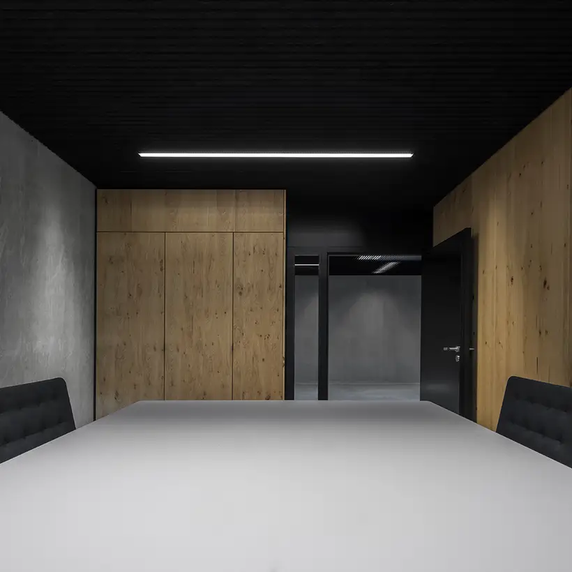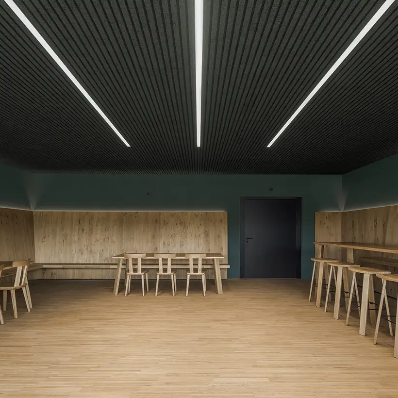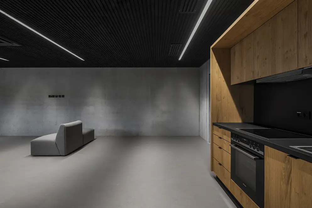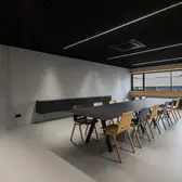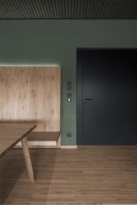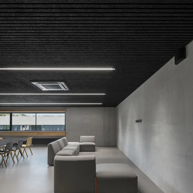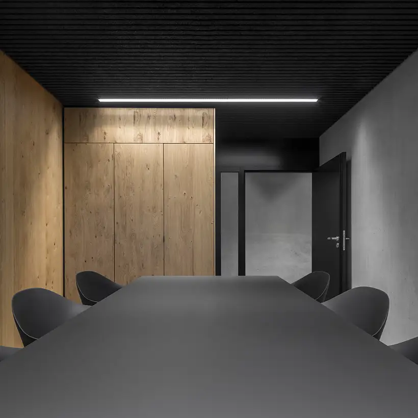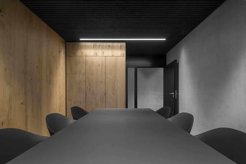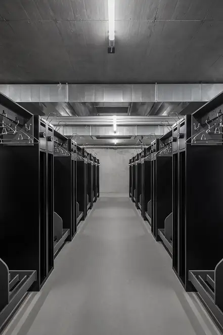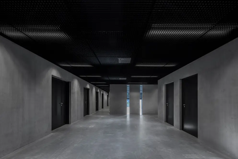 Im gesamten Gebäude wurden Elektrobedienelemente des Programms A 550 in Anthrazit matt von JUNG verwendet – direkt auf dem Sichtbeton platziert, wirkt die Unterputzvariante sehr elegant. Die Anordnung und das Design der Schalter gewinnen durch die allgemeine Reduktion der Elemente zusätzlich an Relevanz. Der Reiz der Gestaltung liegt in der auf die Spitze getriebenen Funktionalität: Nichts ist überflüssig, nichts ohne Zweck, jedes Element pragmatisch an dem Ort, wo es benötigt wird. Das Gebäude wurde von Kienle Beratende Ingenieure mit einer hochleistungsfähigen KNX Elektroinstallation smart ausgestattet. Das System integriert u.a. dimmbare LED-Leuchten, präsenzgesteuerte Beleuchtung, energieoptimierte Sonnenschutzsteuerung, Beschallungs- und Medientechnik sowie die Funktechnik. Selbstverständlich wurden auch sicherheitsrelevante Funktionen in das KNX System eingebunden, wie die Steuerung der Sicherheitsbeleuchtung, die Brandmeldeanlage oder die Zutrittskontrollanlage. Die Notstromversorgung erfolgt über eine Netzersatzanlage.
