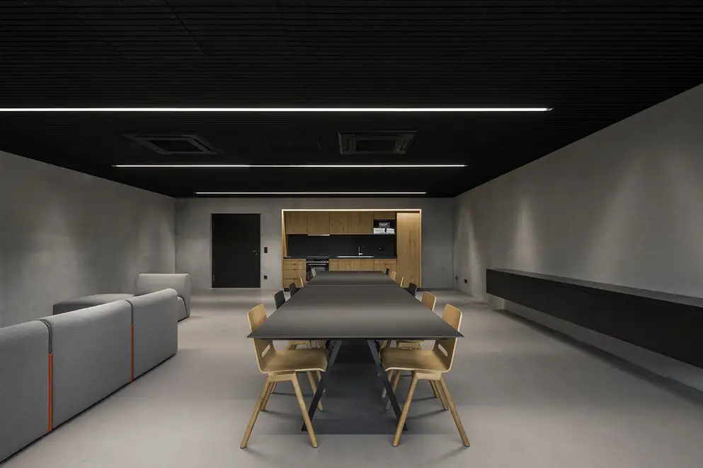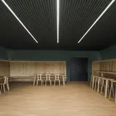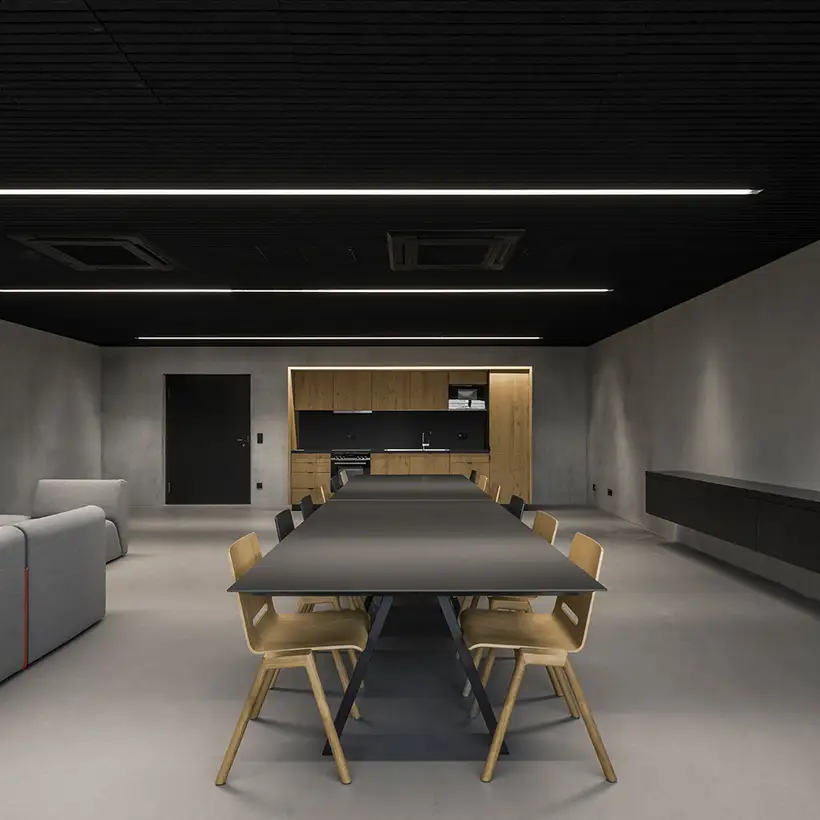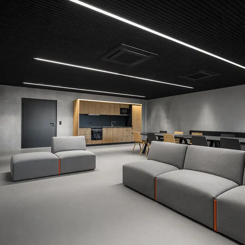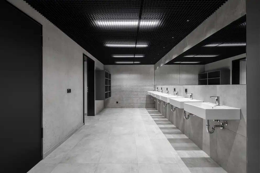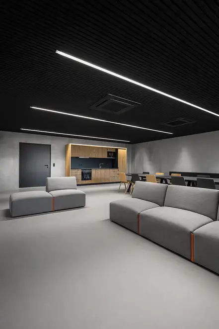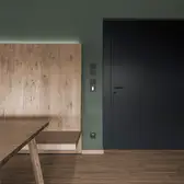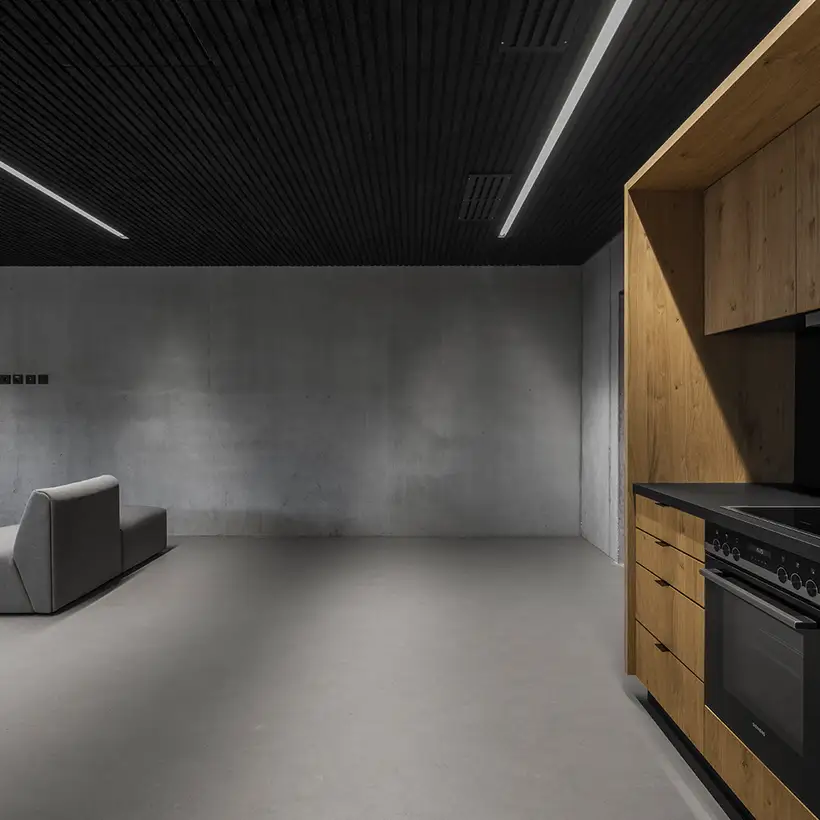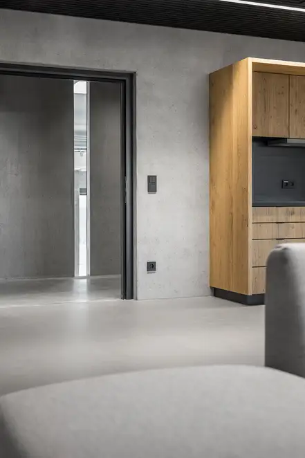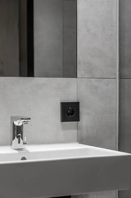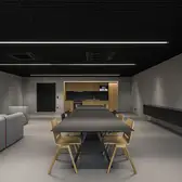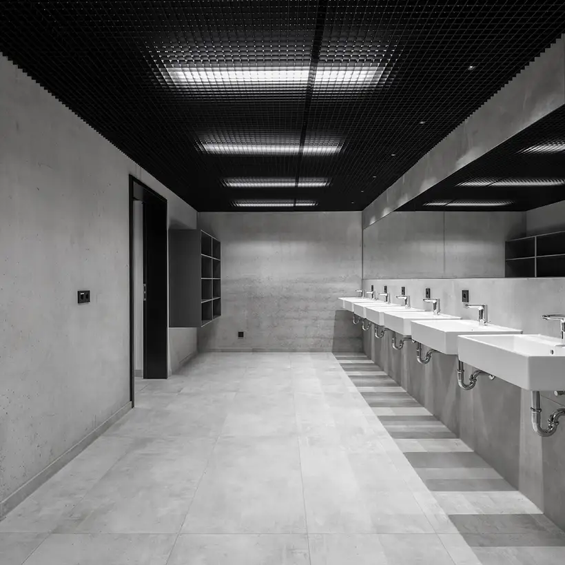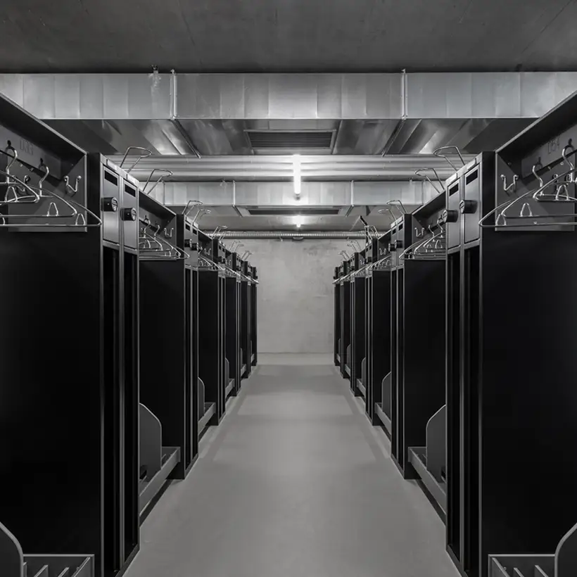 Im gesamten Gebäude wurden Elektrobedienelemente des Programms A 550 in Anthrazit matt von JUNG verwendet – direkt auf dem Sichtbeton platziert, wirkt die Unterputzvariante sehr elegant. Die Anordnung und das Design der Schalter gewinnen durch die allgemeine Reduktion der Elemente zusätzlich an Relevanz. Der Reiz der Gestaltung liegt in der auf die Spitze getriebenen Funktionalität: Nichts ist überflüssig, nichts ohne Zweck, jedes Element pragmatisch an dem Ort, wo es benötigt wird. Das Gebäude wurde von Kienle Beratende Ingenieure mit einer hochleistungsfähigen KNX Elektroinstallation smart ausgestattet. Das System integriert u.a. dimmbare LED-Leuchten, präsenzgesteuerte Beleuchtung, energieoptimierte Sonnenschutzsteuerung, Beschallungs- und Medientechnik sowie die Funktechnik. Selbstverständlich wurden auch sicherheitsrelevante Funktionen in das KNX System eingebunden, wie die Steuerung der Sicherheitsbeleuchtung, die Brandmeldeanlage oder die Zutrittskontrollanlage. Die Notstromversorgung erfolgt über eine Netzersatzanlage.