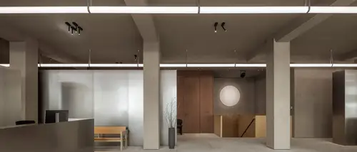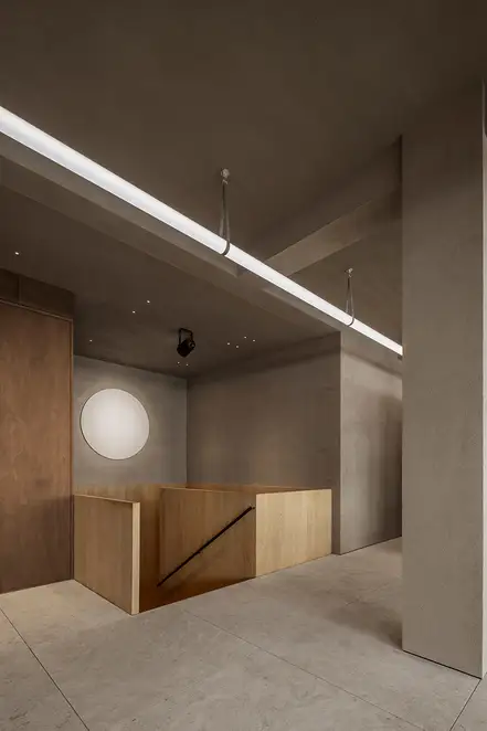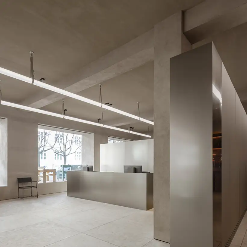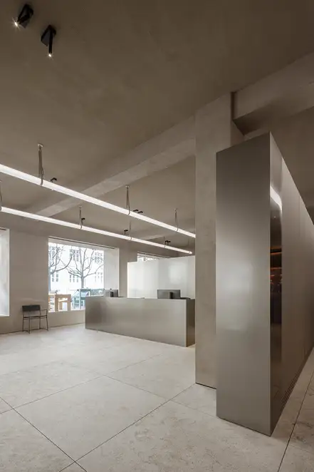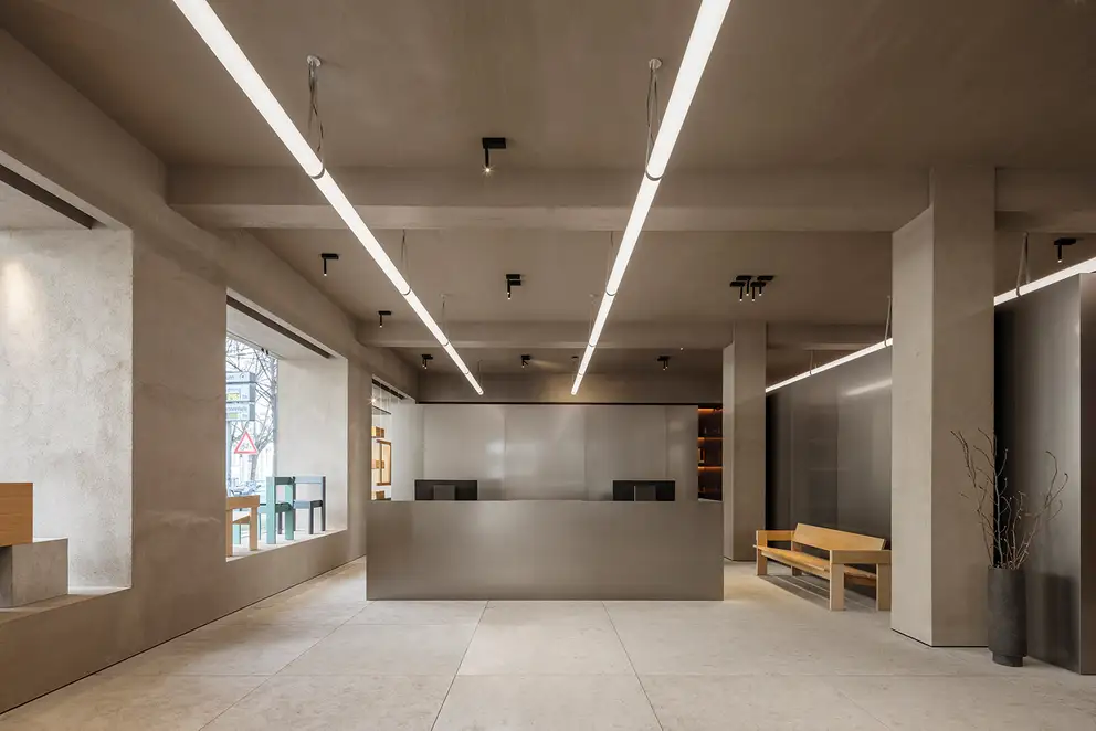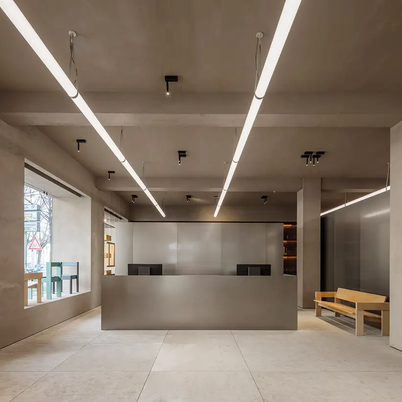 Die Essenz eines Materials in die Ästhetik einer individuellen Architektur zu übersetzen, sei die Motivation von Holzraum, erklärt Tobias Petri. Das Ergebnis sind minimalistische, zeitlose Räume und Möbel. So auch im Atelier in der Blumenstraße. Das bestehende Gebäude wurde bis auf den Rohbau entkernt, die tragende Konstruktion freigelegt. Es entstand ein großer offener Raum, dessen Rückgrat ein 28 Meter langes Regal aus dunkler Eiche bildet. Das Interior Design zeichnet sich durch hochwertige Holzverarbeitung, Reduktion und formale Strenge aus.