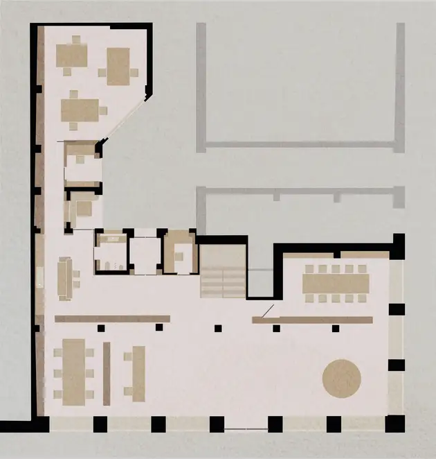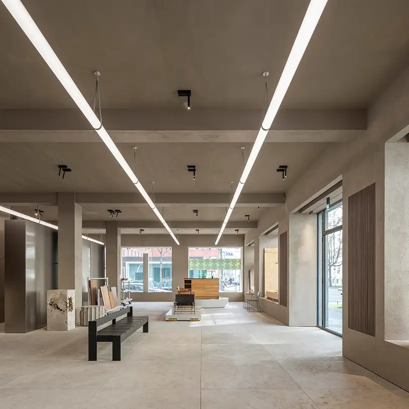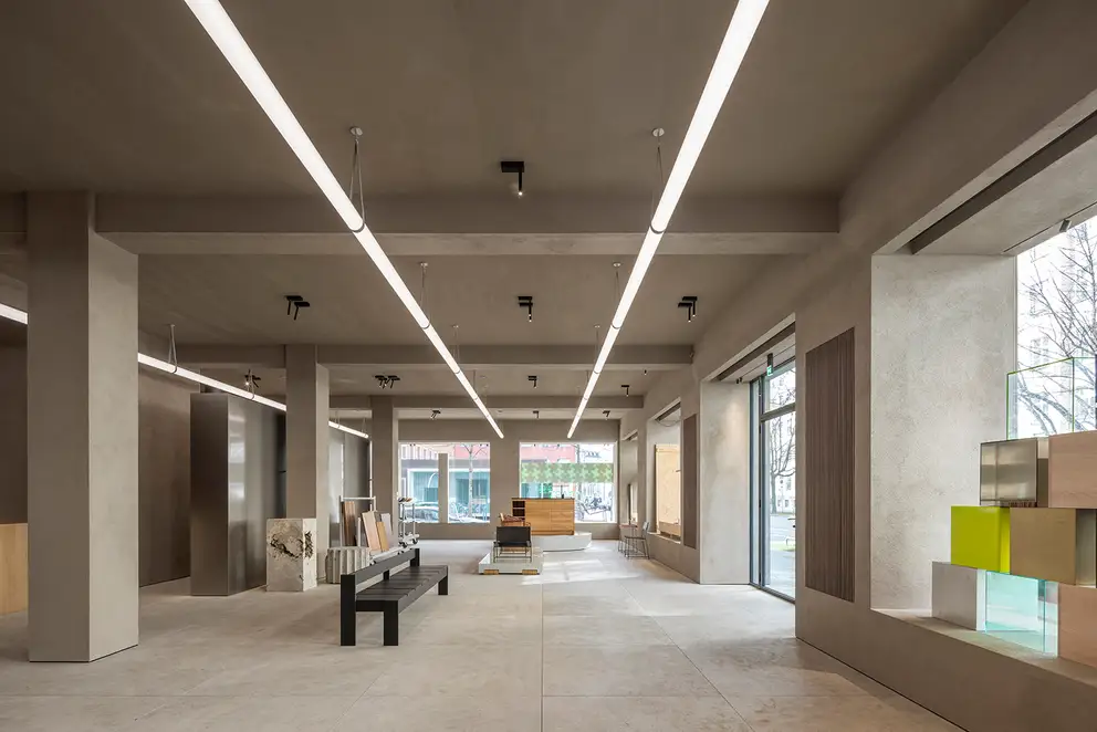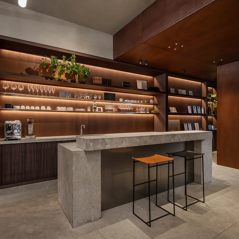 Das neue Interior Design Studio bietet nun Büroarbeitsplätze, Besprechungsräume und eine Kaffeebar – vor allem aber viel Freiraum als Showroom, für Veranstaltungen, als Kreativraum oder mit mobilen Arbeitstischen als Werkstatt. Im Untergeschoss hat auch das eigenständige Küchenlabel der Holzrausch-Geschäftsführer seinen Platz gefunden.