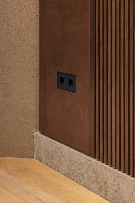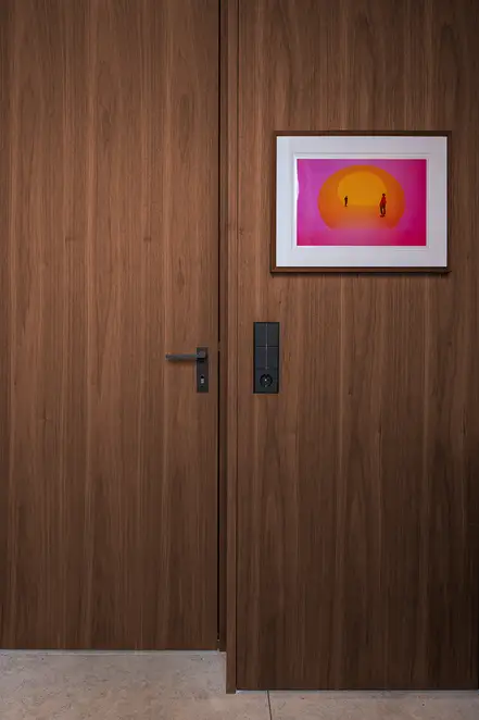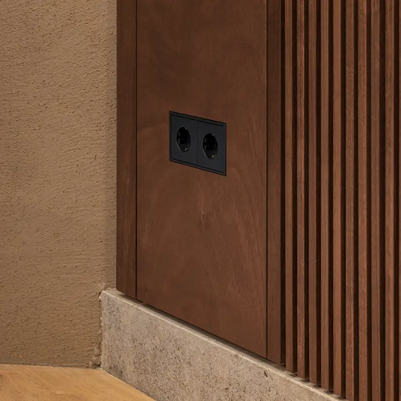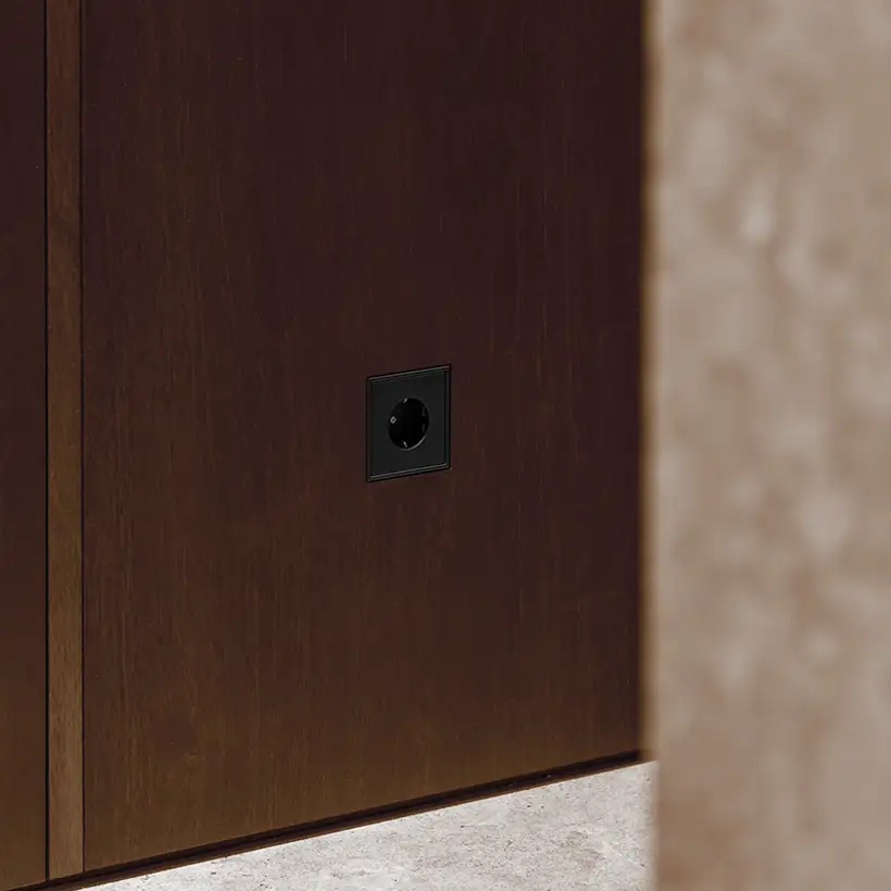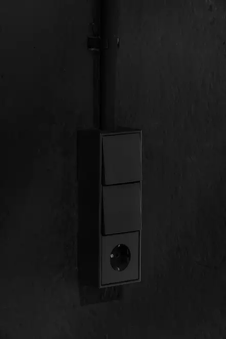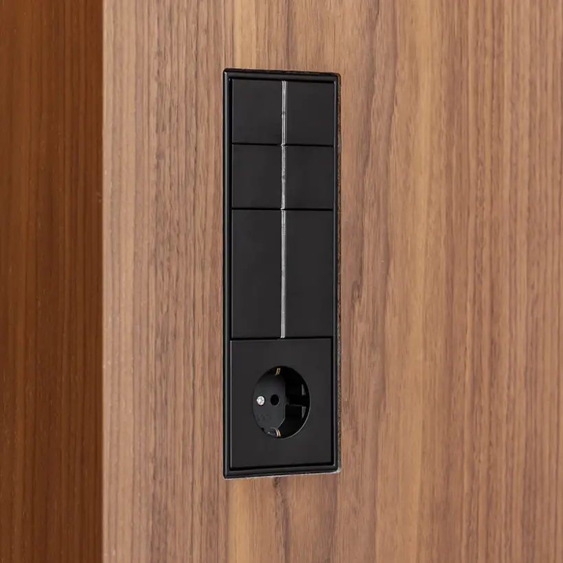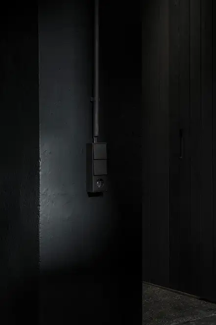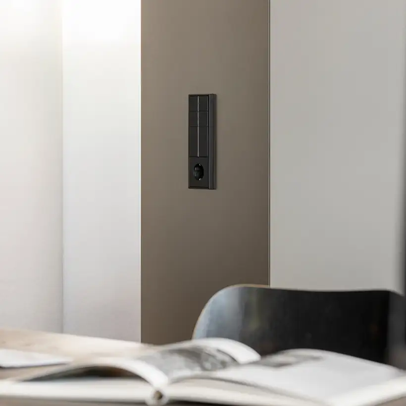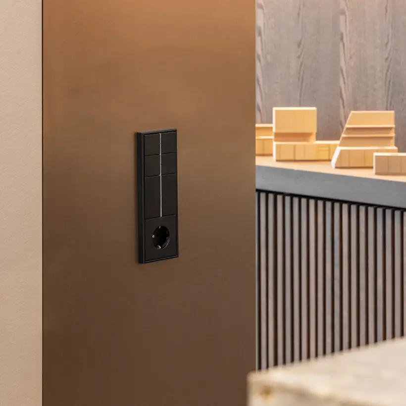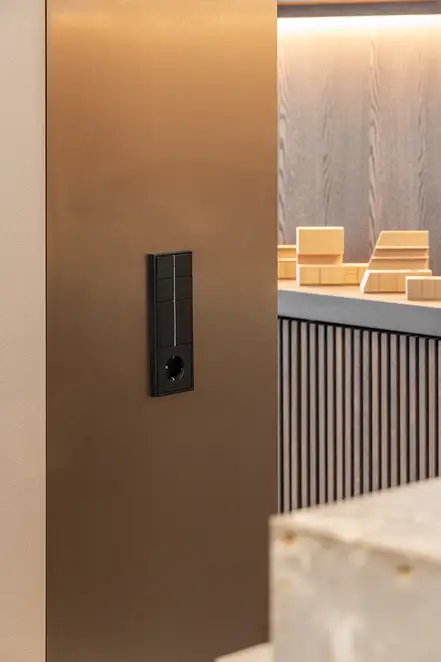 Der schlichte Schalter LS 990 von JUNG passt perfekt dazu und kommt in verschiedenen Varianten zum Einsatz: klassisch als Unterputzschalter LS 990, flächenbündig in der Holzvertäfelung als LS ZERO, mit smarten Funktionen als Tastsensor F 40 und im Untergeschoss als robuster Aufputzschalter LS CUBE – alle in der haptisch "weichen" Oberfläche Graphitschwarz matt. Der tiefschwarze Farbton harmoniert ideal sowohl mit verschiedenen Holzarten als auch mit metallischen Untergründen. Im dunkel gestalteten Untergeschoss fügt er sich ideal in das schwarz gestrichene Mauerwerk ein. Jede Situation verlangt nach einer anderen Lösung. Die Elektrotechnik wurde im innovativen KNX-Standard installiert und ist Teil der intelligenten Gebäudetechnik, die sich über das Smart Control 8 Touchdisplay von JUNG komfortabel steuern lässt.