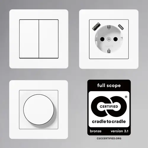 Die Rahmen des Programms A FLOW können mit allen Abdeckungen der JUNG Serie A kombiniert werden. Dazu zählen Lichtschalter, Steckdosen für internationale Systeme, Multimedia-Anschlüsse, LED Universal-Dimmer und KNX Taster.