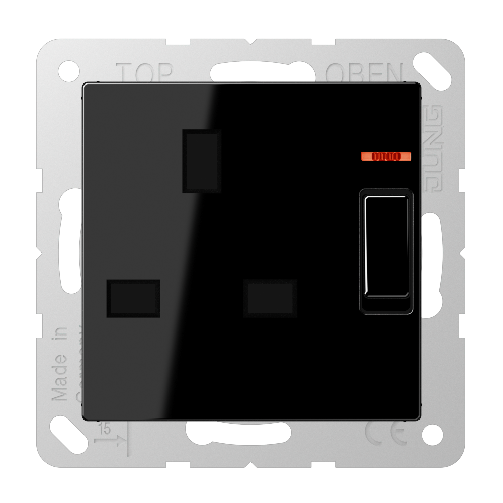 Switched socket with indicator light, British Standard, 13 A 250 V ~, with contact protection, screw terminals, A range, black