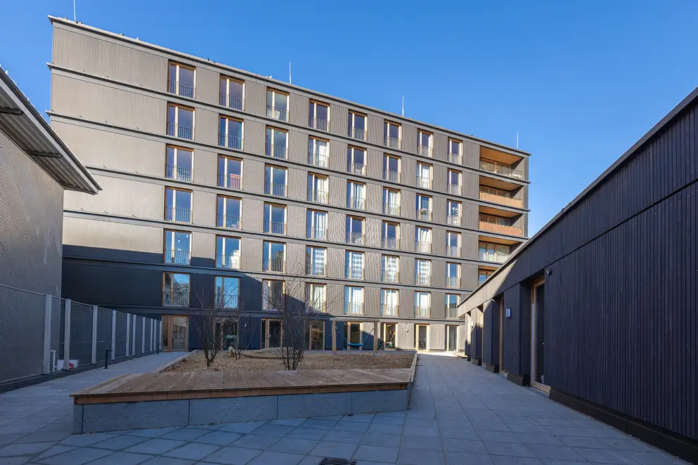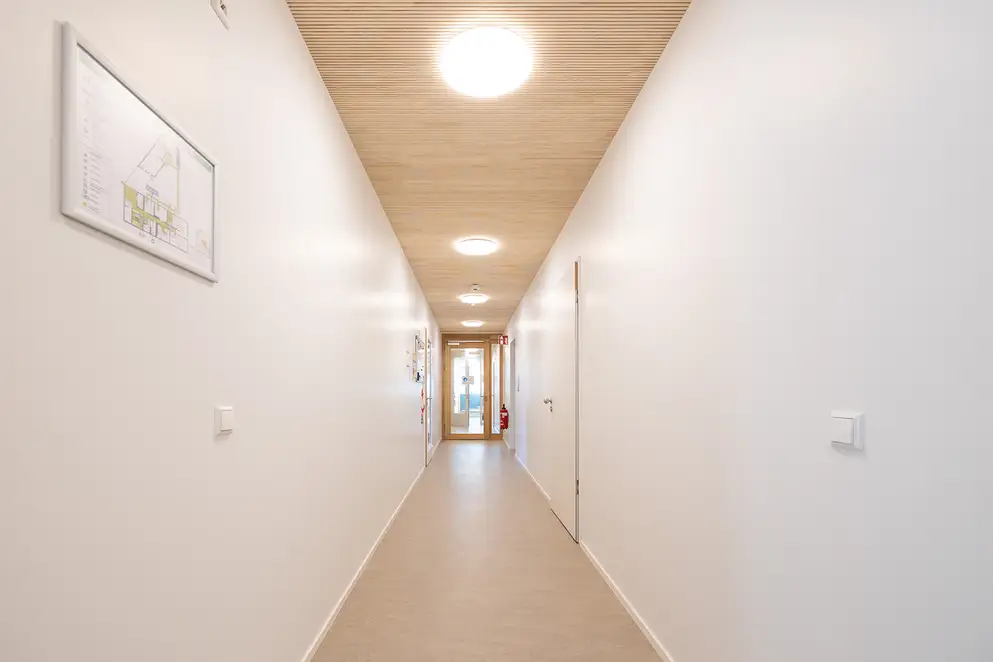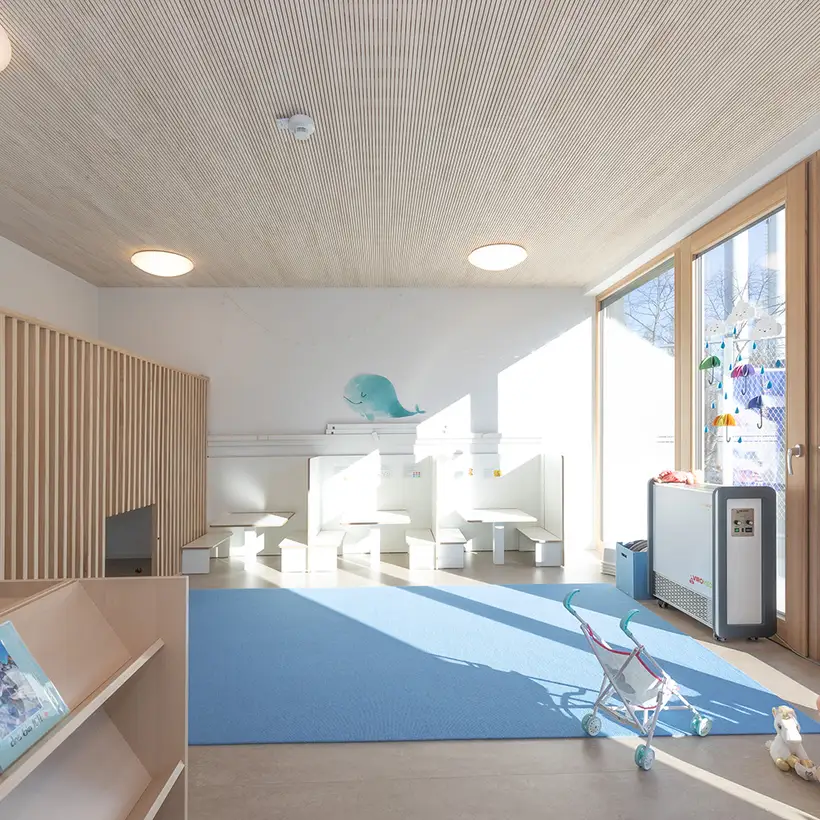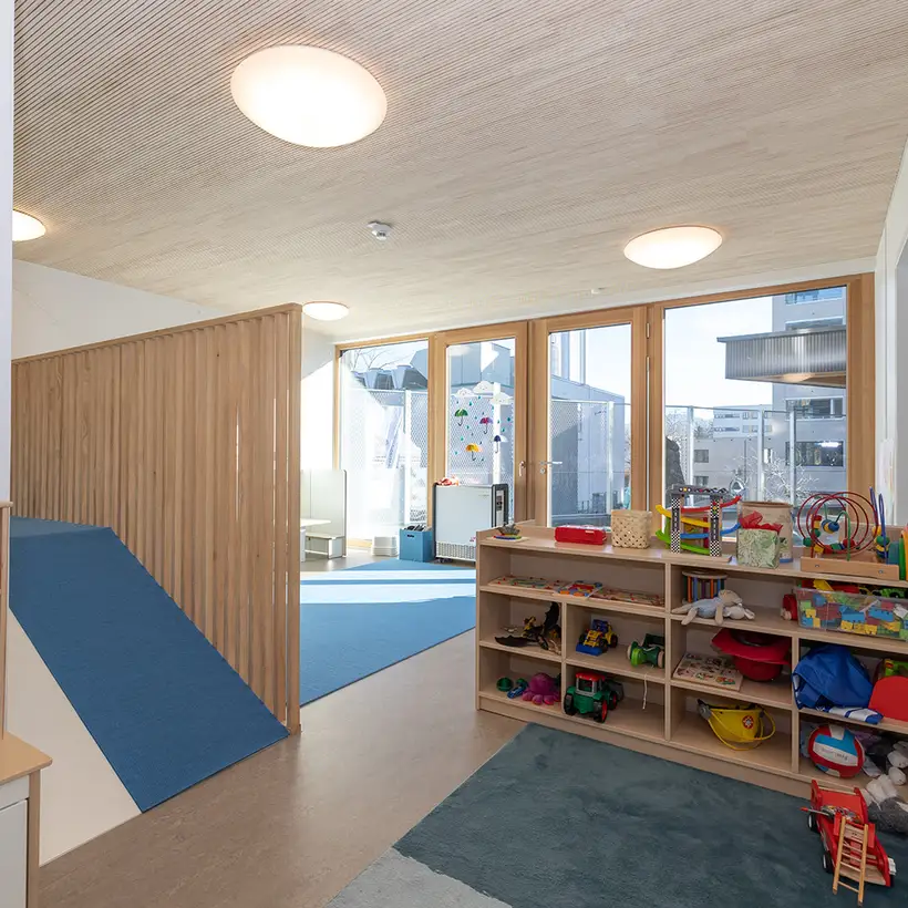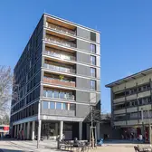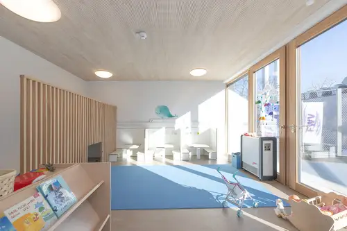 The new residential and business building on Bugginger Straße provides new sales areas for the supermarket in the base zone and also offers space for 30 apartments of differing sizes, including for people from the high-need register of the city of Freiburg and for assisted living groups. The flat roof of the supermarket also serves as a free area and play area for a children's day nursery on the first floor. Alongside the social importance for the city of Freiburg, Buggi 52 particularly stands out due to its resource-friendly building method. During the development, the project management company Sutter3 GmbH & Co. KG and Holzbau Bruno Kaiser GmbH were integrated in good time into the planning. The project was supported by the Wood Innovation Programme. A high degree of pre-fabrication with a fast building time, as well as the use of environmental materials and natural surfaces make the advantages of the consistent wooden building method clear.