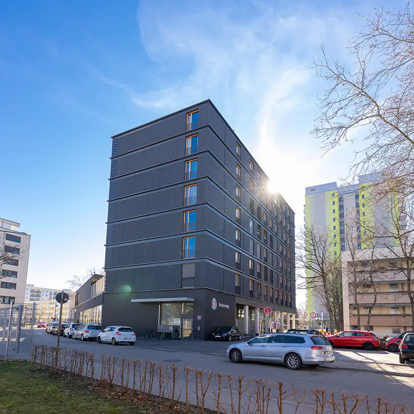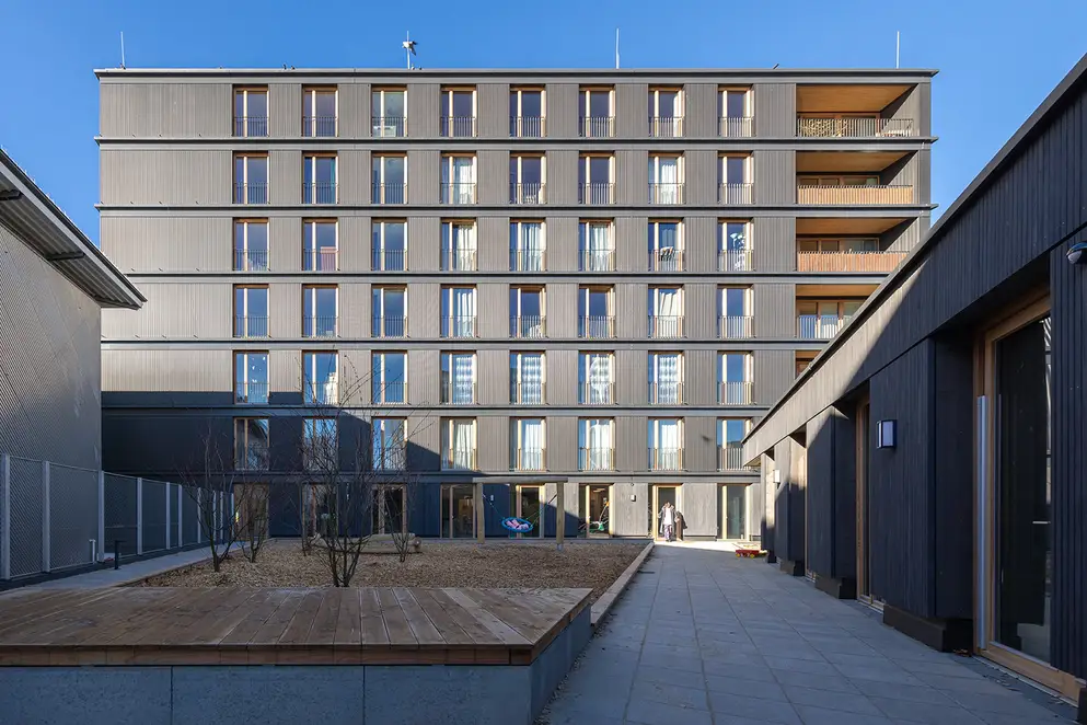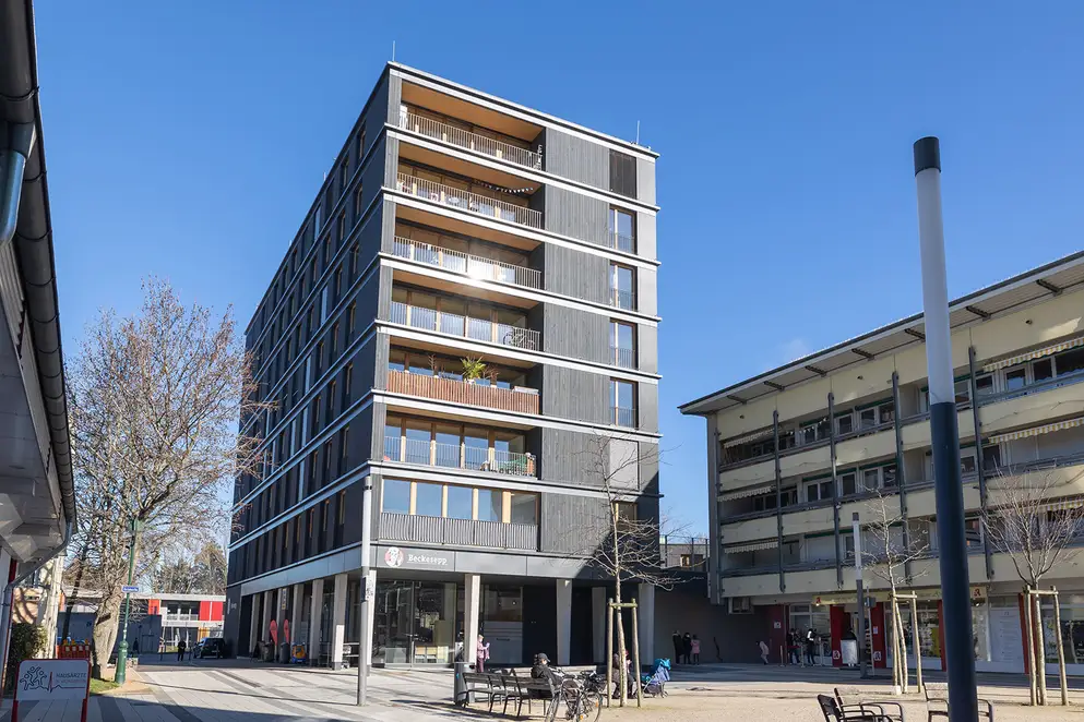 In 2021 in Freiburg, an 8-storey residential and business building with day nursery was built in a wooden design. The impressive structure, whose height of 21.98 metres is only slightly below the high-rise threshold, was built by Weissenrieder Architekten BDA in cooperation with the city of Freiburg for IG Klösterle GbR, the former owners of an old supermarket on the plot. The special thing about the almost tower-block is that above the 1st floor it is built as a purely wooden construction. Over seven floors, Holzbau Bruno Kaiser GmbH combined solid wooden construction, wood frame construction and a wooden facade with wood fibre insulating board in the wall structure. Even the lift shaft and the stairwell are made of wood. In order to still be able to keep the material use low, the load-bearing structures were produced in the economical panel construction method. In addition, the wood frame construction was combined with an optimised cross-laminated timber, rib-element construction. The wood largely originates from the region. Buggi 52 meets the energy efficiency house standard KFW 55 and is the first FSC-certified building in Germany.