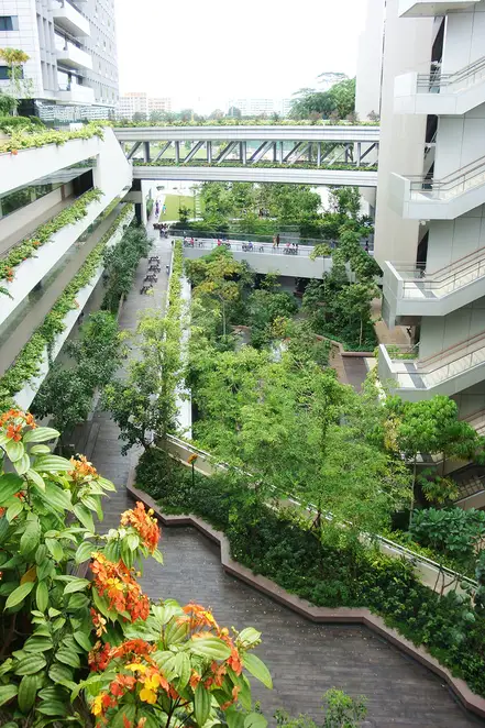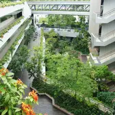 The Khoo Teck Puat Hospital (KTPH) provides general and emergency care for around 550,000 residents from the north of Singapore and has almost 800 beds. As well as its high medical standards, the KTPH focuses on a healing environment. This is based on a biophilic design that harnesses and extends the natural advantages of its location. The idea was to create a “garden hospital”. This was realised through green garden scenery, terraces and vertical greenery on the buildings as well as a harmonious water landscape. The Yishun Pond is the central element of the grounds, with paths and small pavilions bordering its banks. The green elements of the KTPH generate relaxation and well-being for patients and personnel. At the same time they ensure an improved air quality for the whole area.