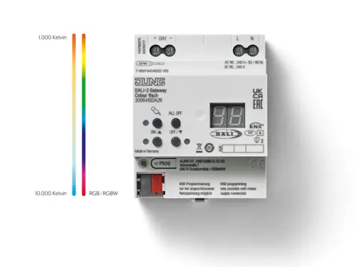 Using the KNX DALI-2 gateway Colour, the colour temperature and brightness of LED luminaires can be set independently of each other or combined as desired. In this way, for example, the behaviour of an incandescent lamp can be adjusted by changing the colour temperature to the warmer range when dimming and changing to the cooler range when making brighter.