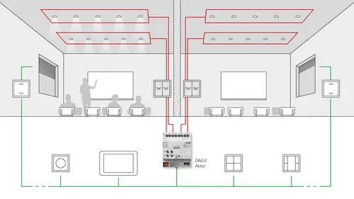 The KNX DALI actuator is ideal for repetitive rooms such as classrooms or hotel rooms. The four connections of the DALI actuator can be used, for example, to combine two classrooms with per two individually controllable light fields. The individual control in the classroom is retained. Central control then takes place with the other functions via KNX. For example, the caretaker can use a corresponding visualisation on a tablet to switch the light on centrally before the start of lessons and switch it off again at the end. Errors or faults are also transmitted to KNX via the DALI bus and indicated on the displays so that a fault can be rectified quickly and efficiently.