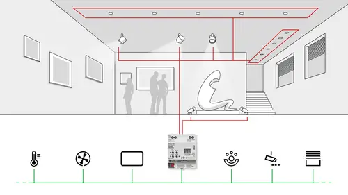 The KNX DALI gateway is the ideal solution for a lighting installation with a high degree of customisation. It offers great flexibility, especially in exhibition rooms or museums: basic lighting can be controlled via a group, while individual exhibits can be specifically illuminated with different light colours or brightness levels. This allows certain areas to be emphasised, moods to be created and light to be used in a targeted manner to optimally support the effect of the exhibits.