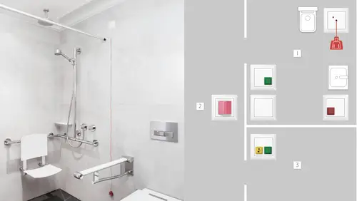 Operating the pull cord push-button or call button (1), e.g. in an accessible bathroom, triggers the call. This is signalled visually and, if required, also acoustically by the emergency signal (2). In addition, pull cord push-buttons and call buttons indicate the call with a red reassurance light. The call remains active until the care staff reset it using the reset button on site. In addition, a service unit (3) can be installed in a staff room or reception area. In large applications, a service terminal serves to centrally report emergency calls. Up to 20 incoming emergency calls are displayed visually and acoustically using the integrated display.