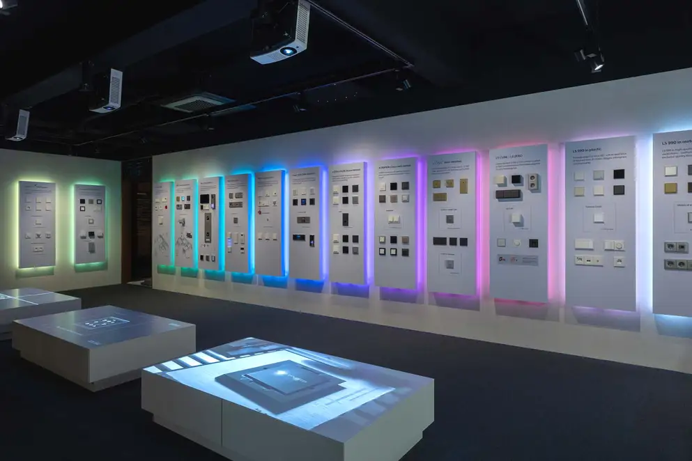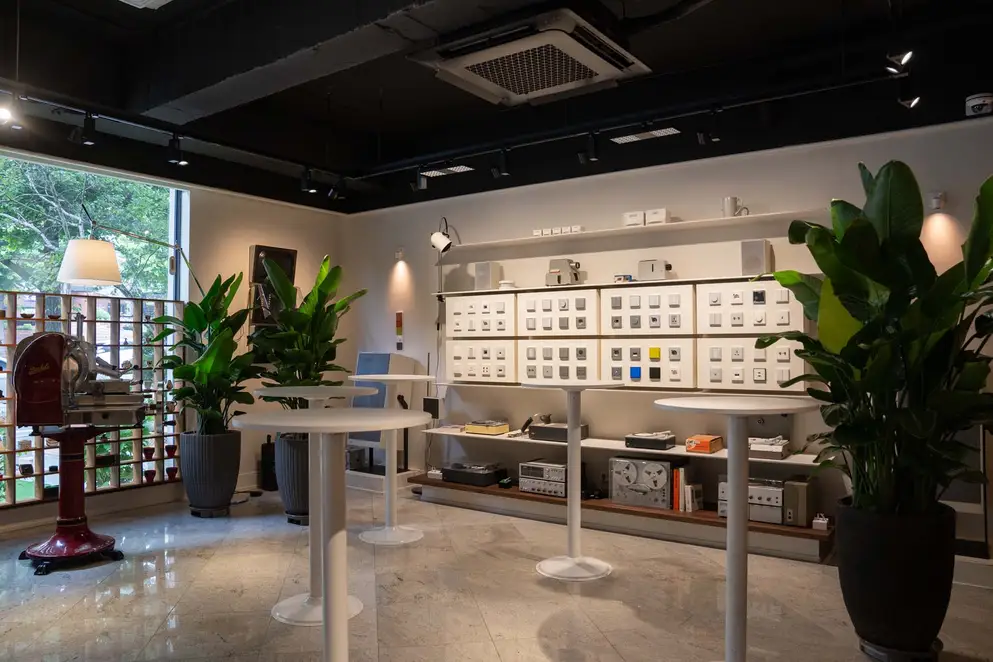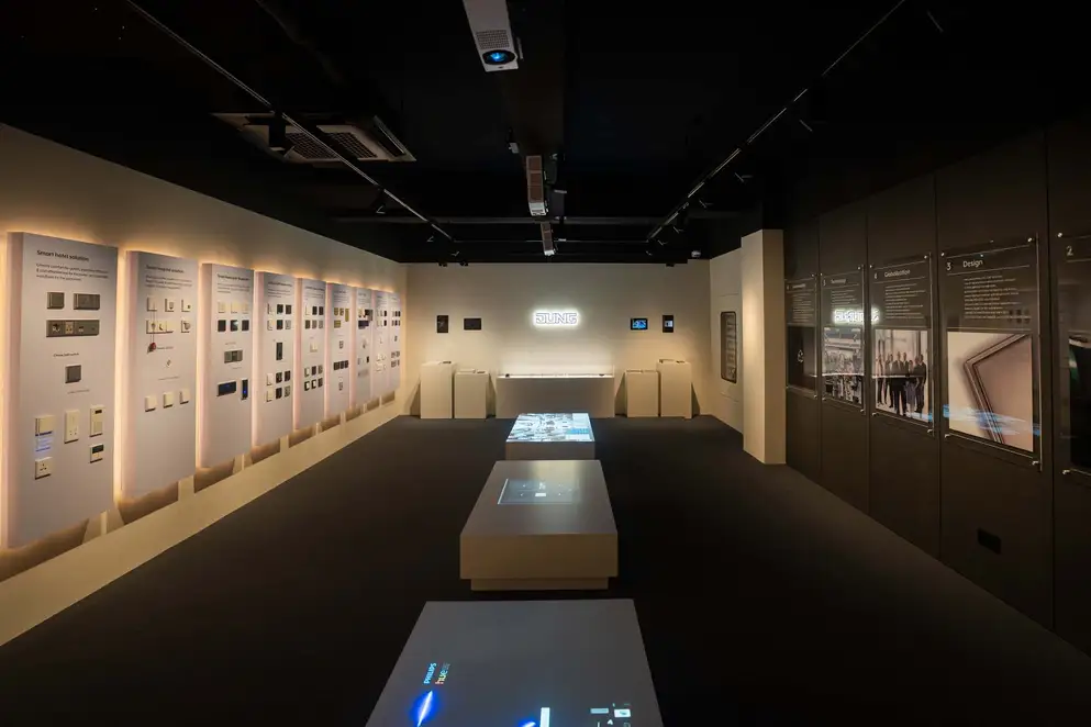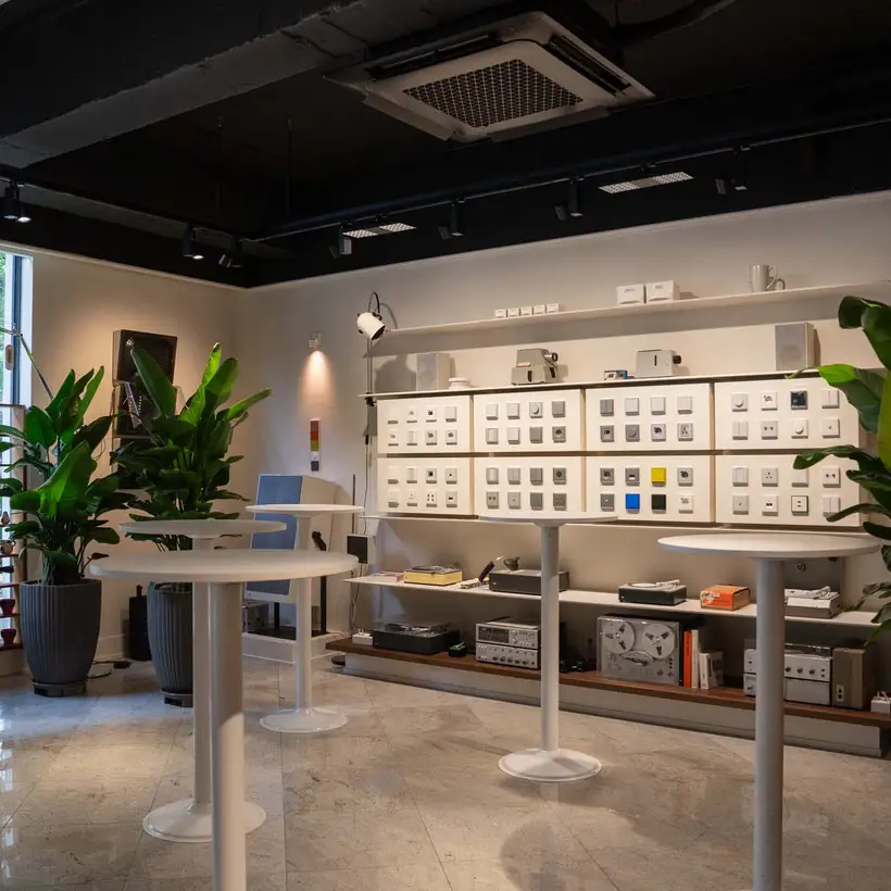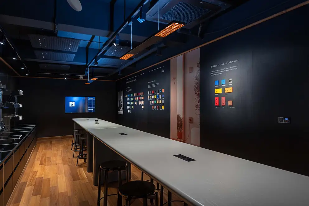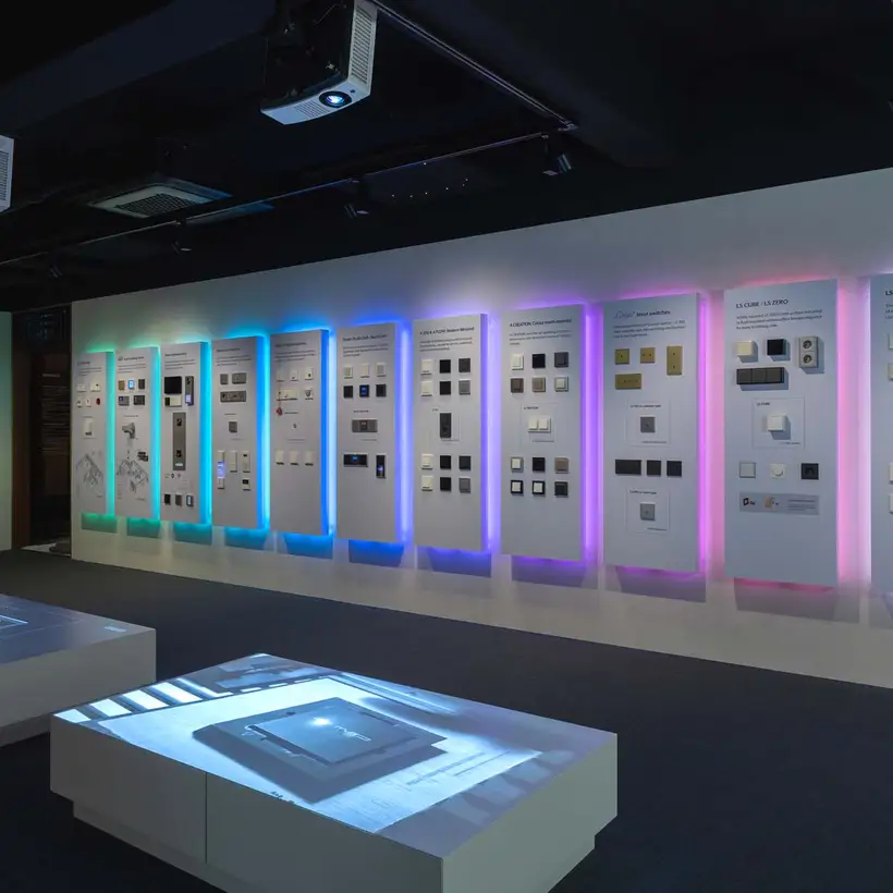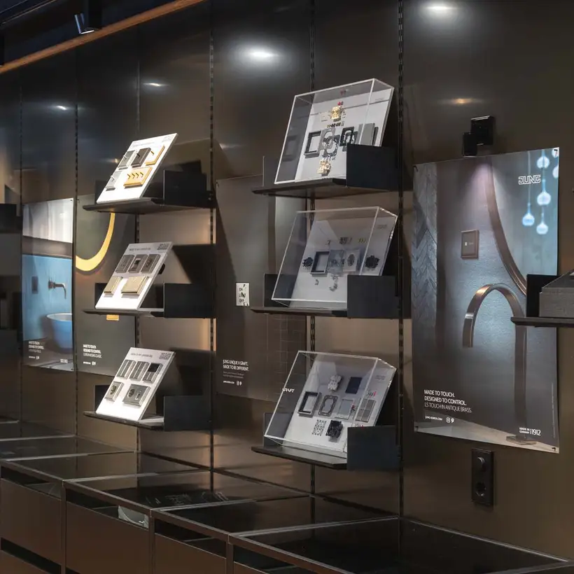 Spread across two levels, the showroom is divided into three thematic areas: “Culture & Community”, “Brand Museum” and “Smart Architecture”. The atmosphere evokes that of a design museum: in numerous display cases, iconic switch designs and historical milestones from the JUNG brand are presented and staged alongside other historic objects and everyday items. Professional visitors and interested guests are invited to linger at the JUNG Café, designed by Jung-yeop Lee of Design Soyu, and to engage in informal conversation in a relaxed setting.