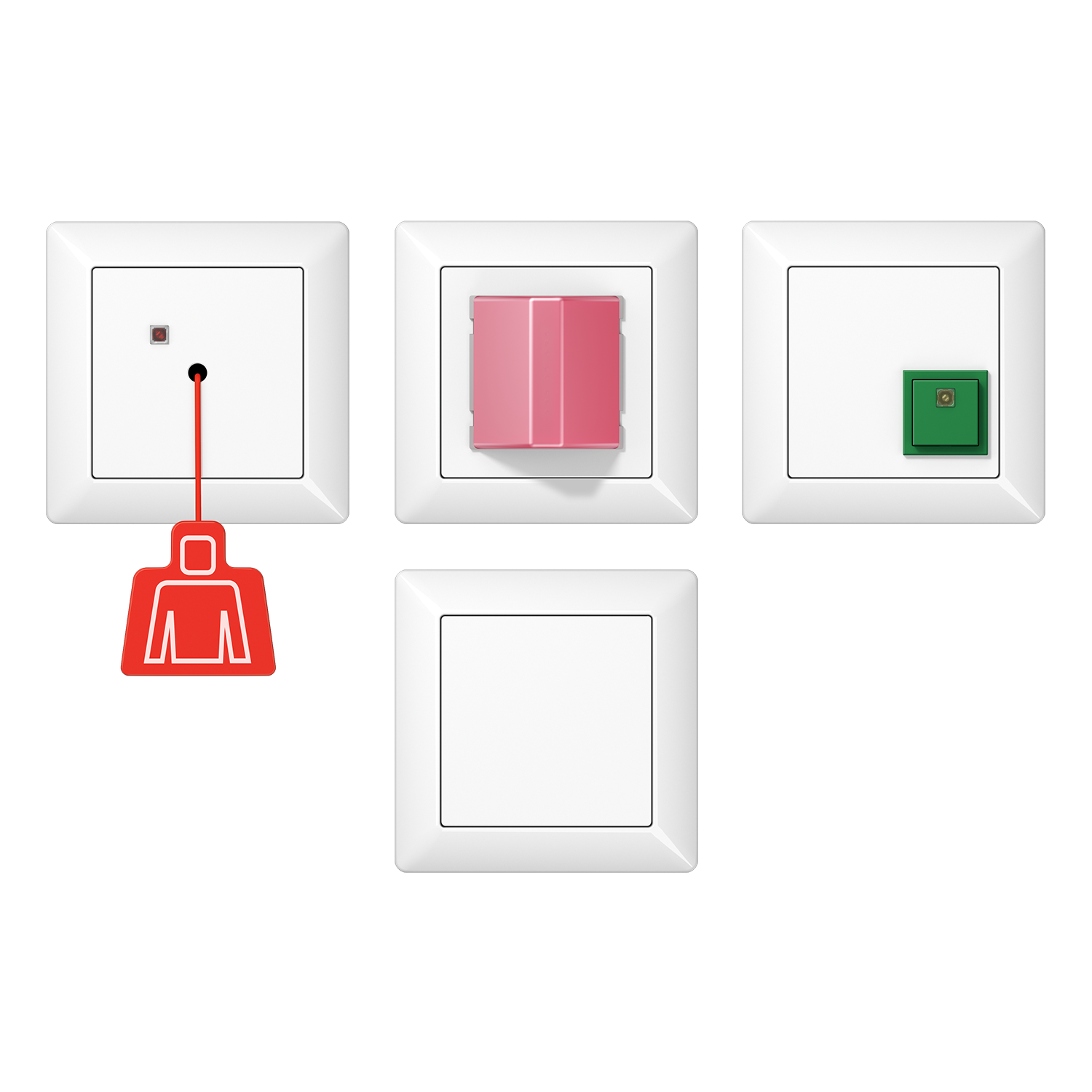 An emergency call can be triggered in the bathroom/WC via an easily accessible pull cord. The pull cord push-button can also be installed in the middle of the room on the ceiling so that it is easily accessible for people in need of help. A red lamp on the switch signals that the emergency call has been triggered successfully.