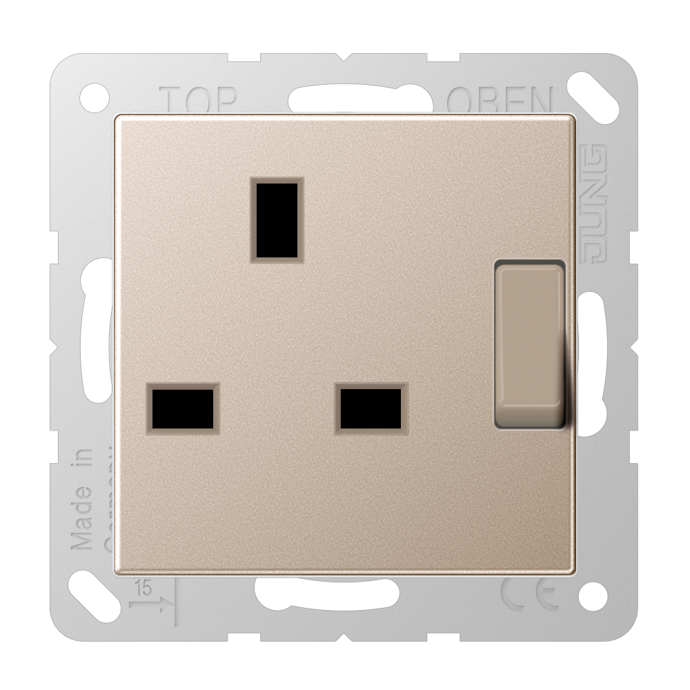 Switched socket, British Standard, 13 A 250 V ~, with contact protection, screw terminals, A range, champagne