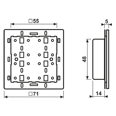 - Mounting on flush box with dimensions according to DIN 49073, screw fixing on walls or adhesive fixing on smooth, even surfaces (glass)
