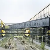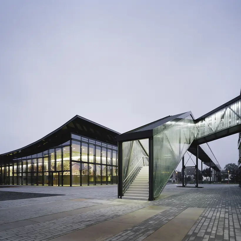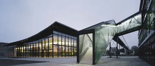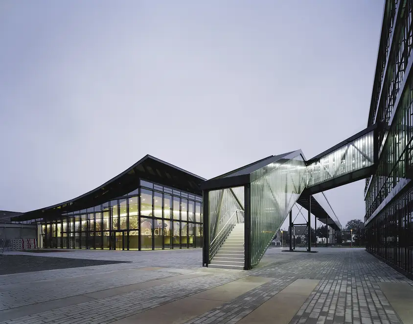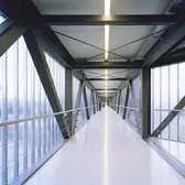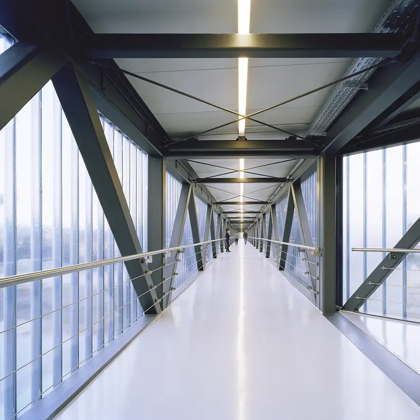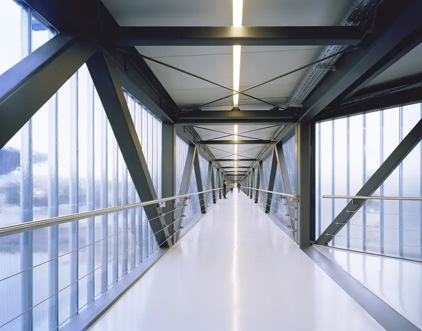 A large lattice truss serves as the footbridge connecting the new complex with the original company facilities. The truss is covered with industrial glass to protect it from the elements.