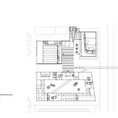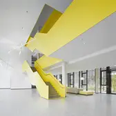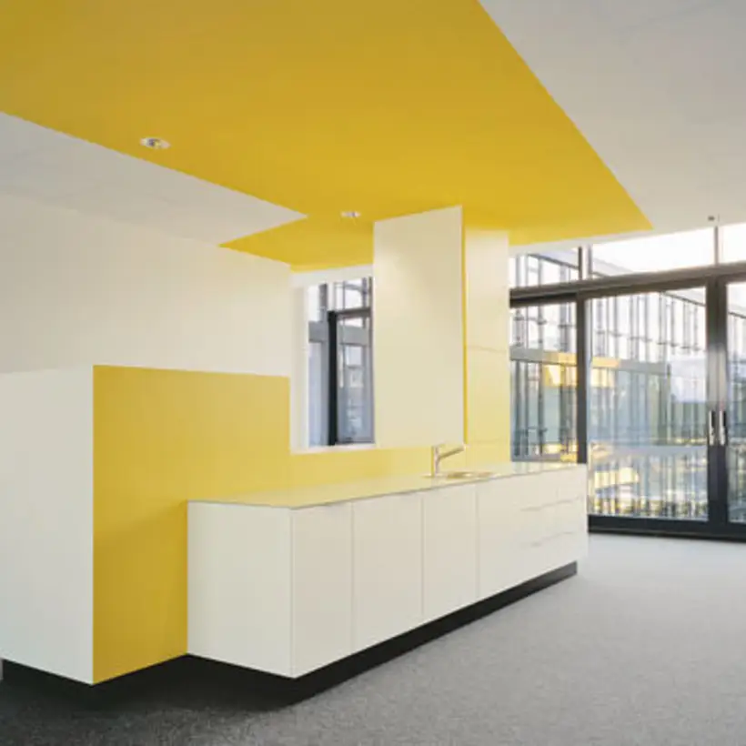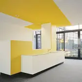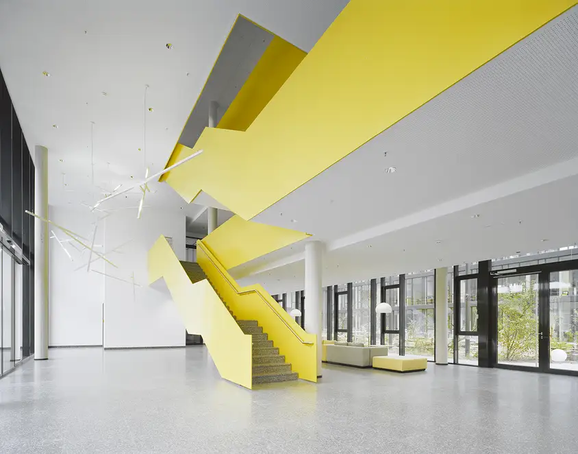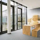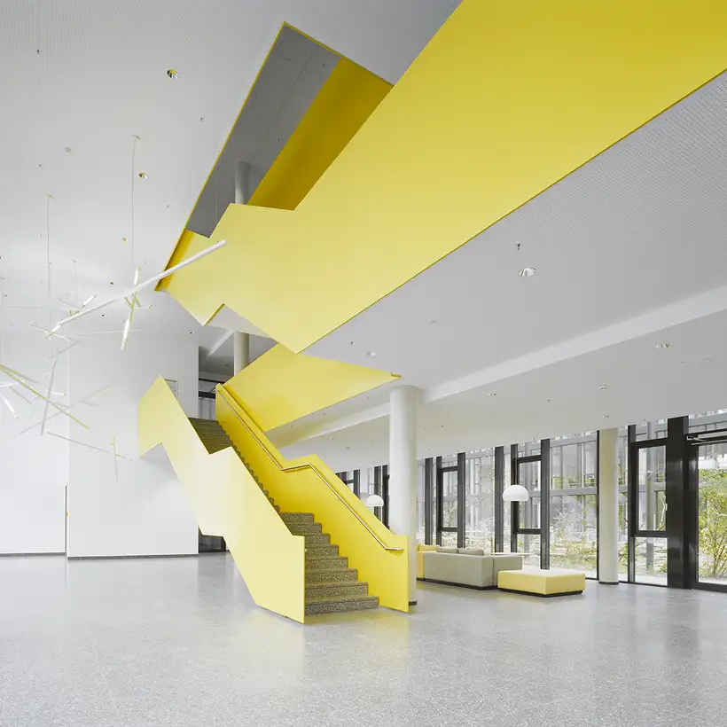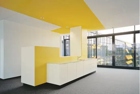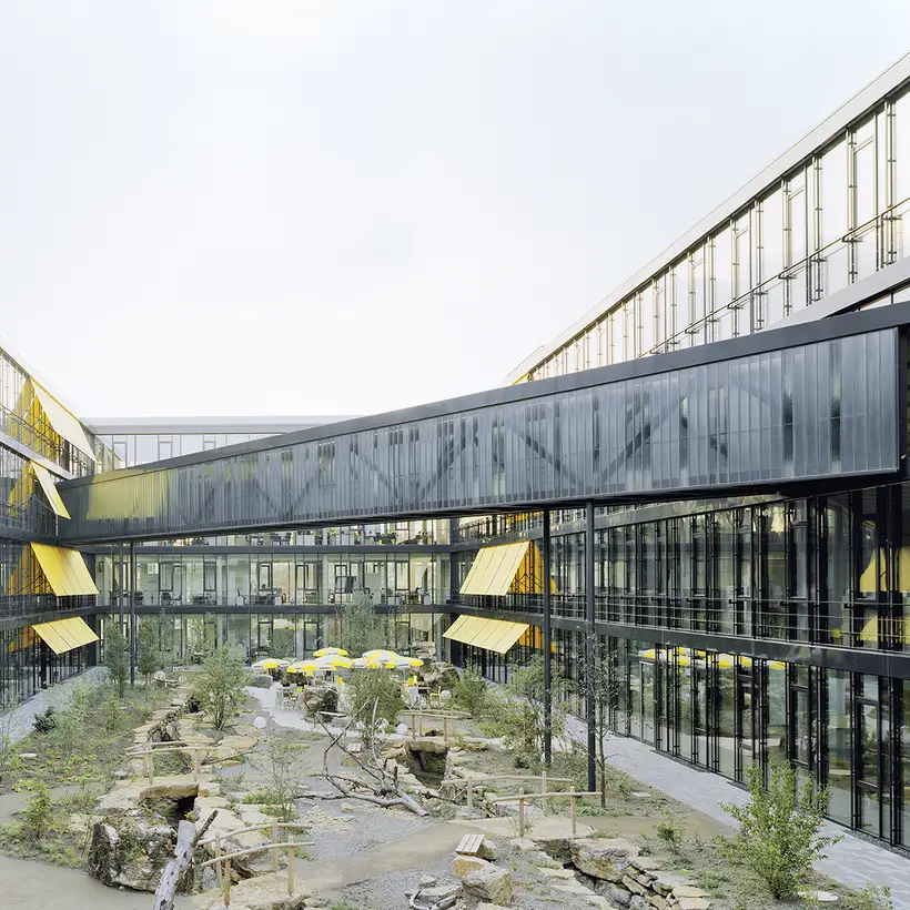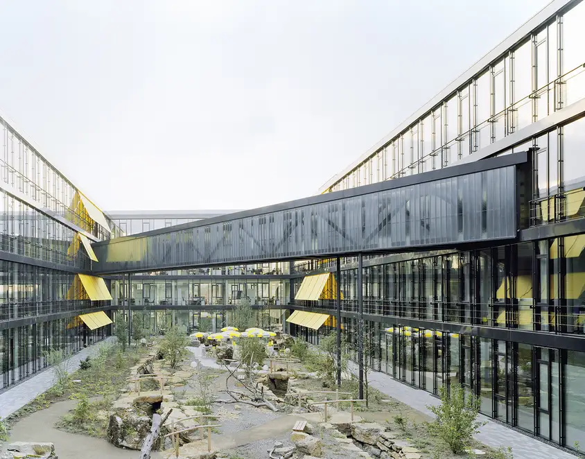 The newly constructed footbridge joins the existing Kärcher facilities with the plaza and the new office building. Next to the other buildings, the transparent façade appears somewhat reserved. Inside, however, lighting elements in the company colour of yellow light the way. Office space for the staff has been laid out in rings around the inner courtyard, which allows natural lighting and ventilation of the rooms. Some 700 work stations have been created over the four floors of the new office building. Office space in the rectangular building has been arranged in a ring around a green courtyard. The building’s depth of just 13.5 metres facilitates uniform natural lighting and ventilation as well as the highly flexible usage of the building’s floor space. A cafeteria on the ground floor opens to the courtyard. Placing benches and tables under the warm glow of pendant lights has created a welcoming atmosphere and a place where employees can meet casually or join each other for lunch. A small foyer on the second floor serves as the entrance to the footbridge to the older facilities. By spanning the inner courtyard, the overhead crossing provides employees with a direct connection.