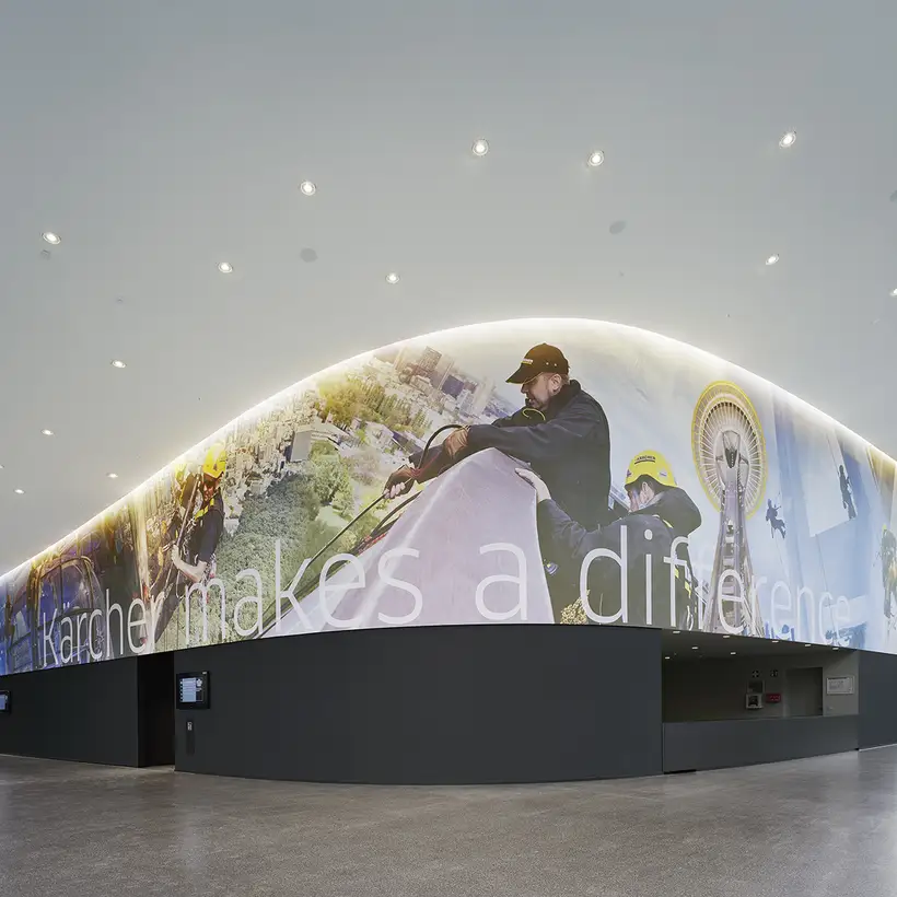 With its overhanging roof, the new auditorium can host events for up to 800 people in its foyer alone. The space can also be divided by movable partitions to create two or three smaller rooms. The spacious hall opens to the plaza and provides ample space for events. The upper part of the curved wall of the auditorium is decorated with a 50-metre long Kärcher motif, illuminated by a recessed lighting channel in the ceiling along its entirety. This motif endows the entire complex with a unifying company identity. The ceiling structure is covered by folds of sailcloth of different widths, which, besides improving acoustics, cool and heat the auditorium. Lighting and sound elements are arranged linearly within the gaps between the folds. The curved wall is also lined with elements for improving acoustics in the hall.