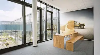 The exhibition and seminar rooms are situated in the new constructed visitor and customer centre. With its façade of exposed brickwork, it harkens back to the historical brickyard, and offers a clear contrast to the fully glazed office and event buildings. Visitors enter building through an L-shaped glass passage running along the plaza. On the north side of the plaza, staff can visit a two-storey café, where they can exchange the latest news with colleagues or meet with customers. To the west, a foyer leads to the presentation and exhibition area, while the floor above – supported by a lightweight steel construction that seemingly floats above the walls – accommodates a display area for prizes and awards won by the company. The central exhibition space is accessed directly from the foyer. With 800 square metres of space and 8-metre high ceilings, the hall is also used for trade shows. A sheltered area just outside the hall is used to present products such as power sweepers. The conference and seminar rooms are situated to the north side of the hall.