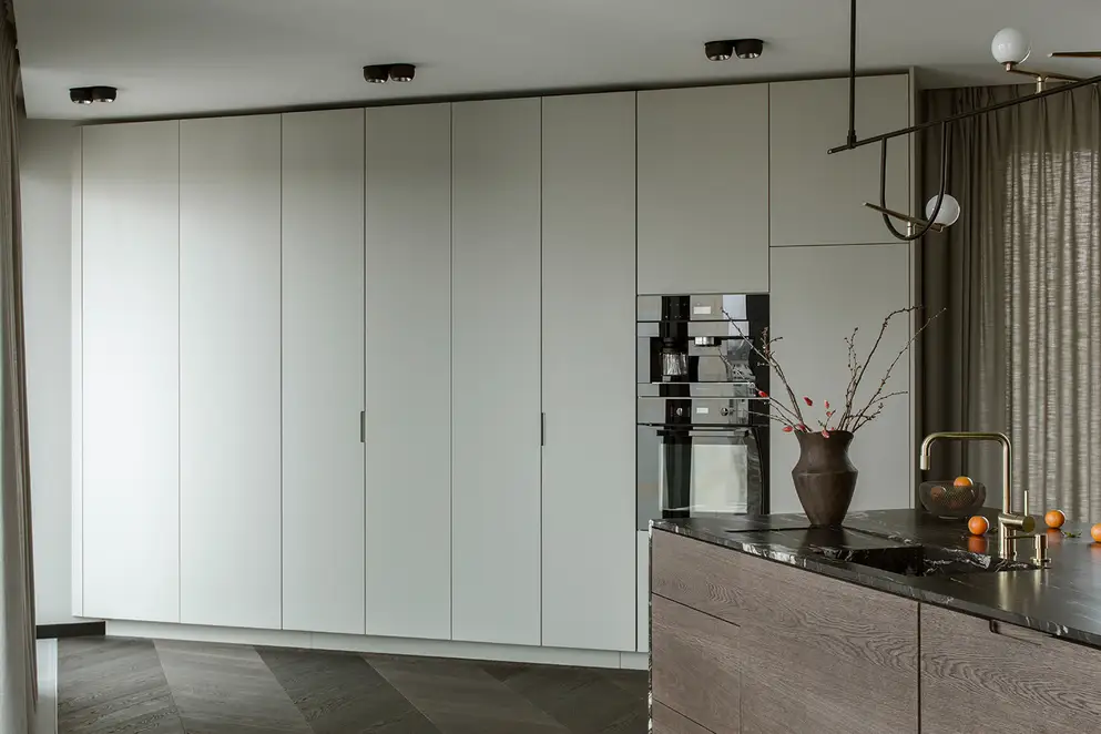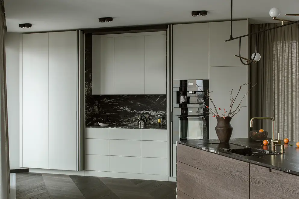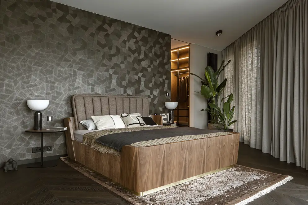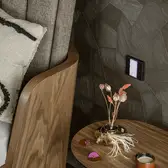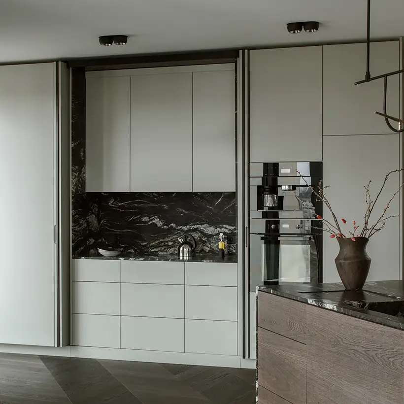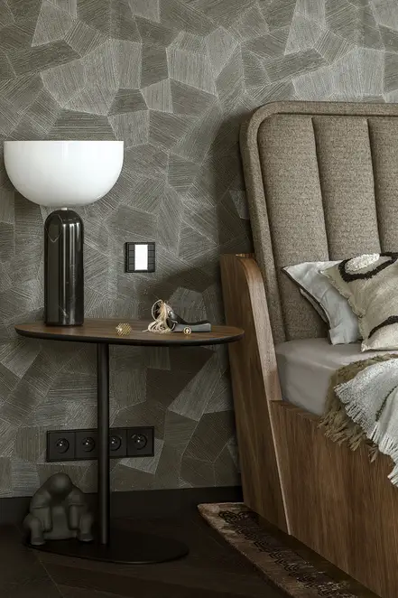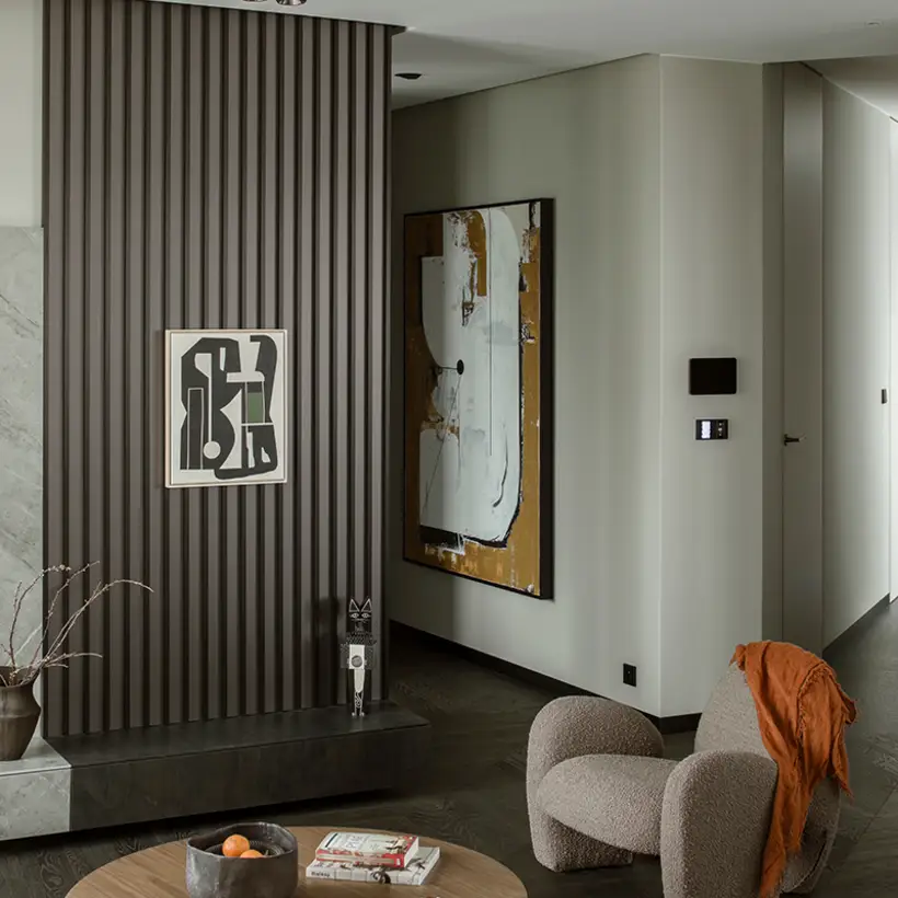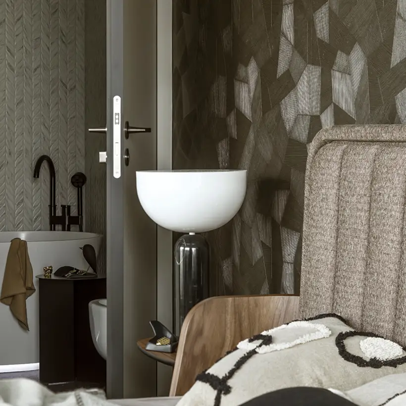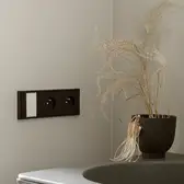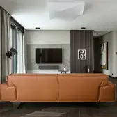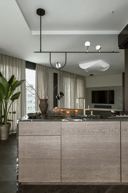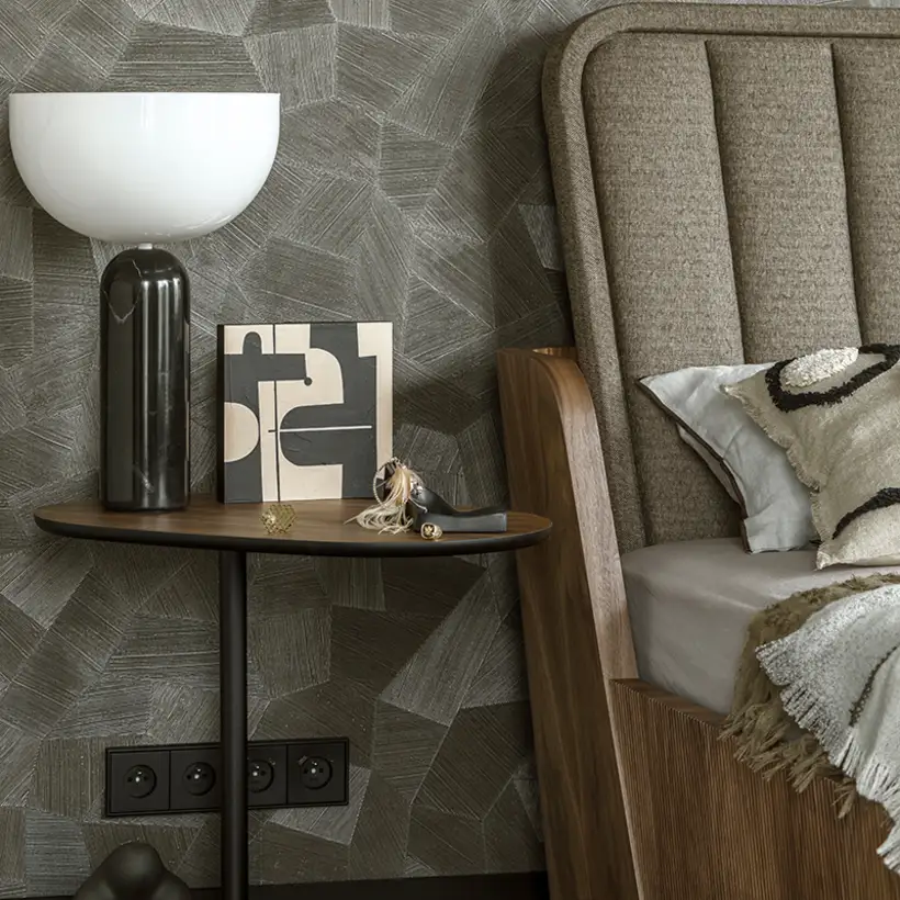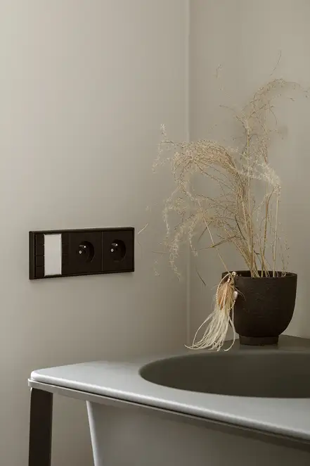 The sophisticate simplicity of the shapes is enriched with unobtrusive colours, delicate patterns and also with various textures: including patterned granite on the kitchen island, wood in a fishbone pattern on the floor and silk rugs. The furnishing consists of design classics, furniture from Polish artists and works of art. The details play the greatest role in this interior. Earth colours, beige and brown tones are complemented here by the black accents. In this connection, the switches, KNX push-buttons and sockets from the JUNG LS 990 range in matt graphite black are particularly striking. The matt colour fits perfectly into the room design and inserts itself harmoniously into the atmosphere. The KNX control with the F50 push-buttons from JUNG provides the highest level of operating convenience for the residents and had an absolute priority in this project.