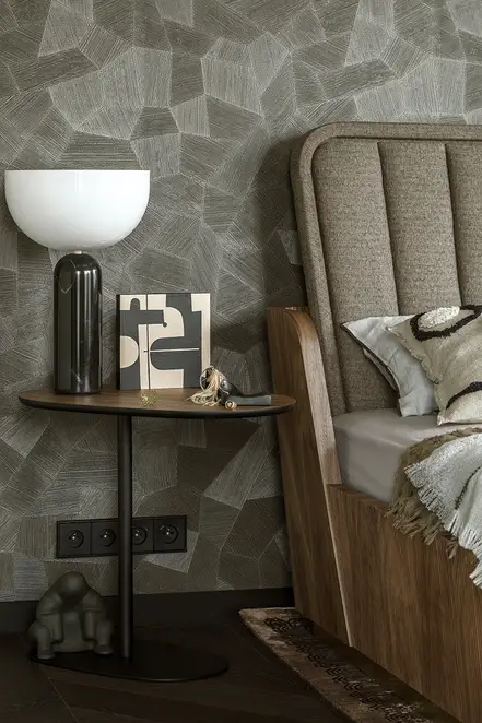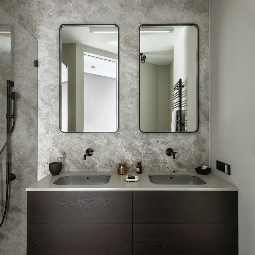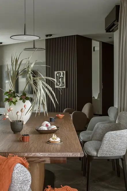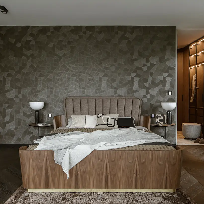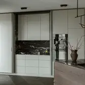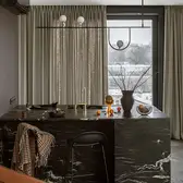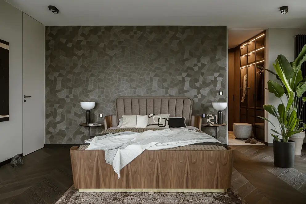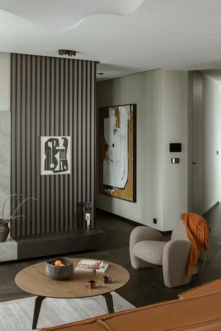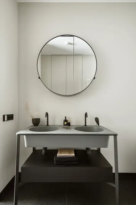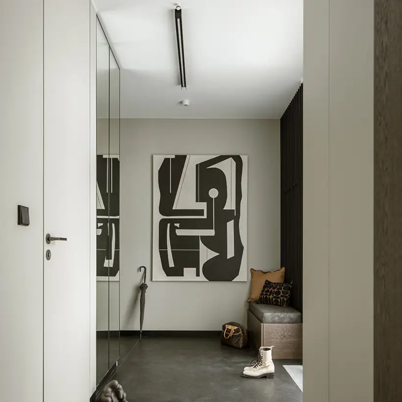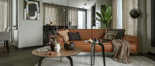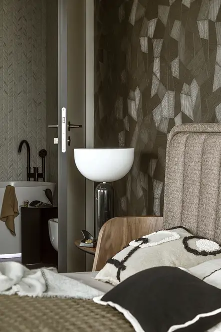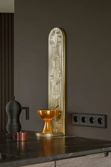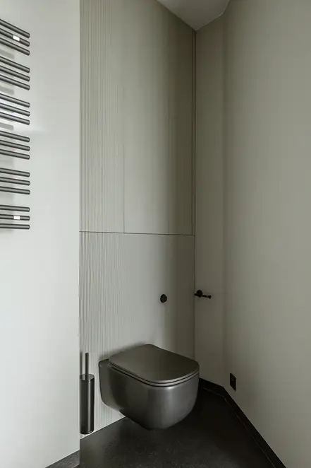 The sophisticate simplicity of the shapes is enriched with unobtrusive colours, delicate patterns and also with various textures: including patterned granite on the kitchen island, wood in a fishbone pattern on the floor and silk rugs. The furnishing consists of design classics, furniture from Polish artists and works of art. The details play the greatest role in this interior. Earth colours, beige and brown tones are complemented here by the black accents. In this connection, the switches, KNX push-buttons and sockets from the JUNG LS 990 range in matt graphite black are particularly striking. The matt colour fits perfectly into the room design and inserts itself harmoniously into the atmosphere. The KNX control with the F50 push-buttons from JUNG provides the highest level of operating convenience for the residents and had an absolute priority in this project.