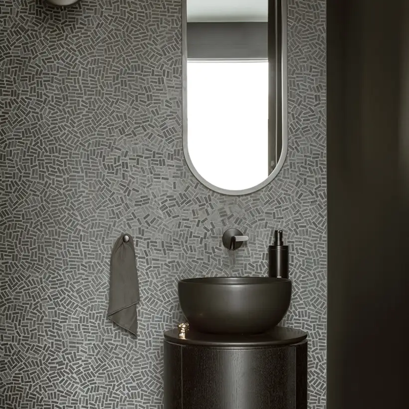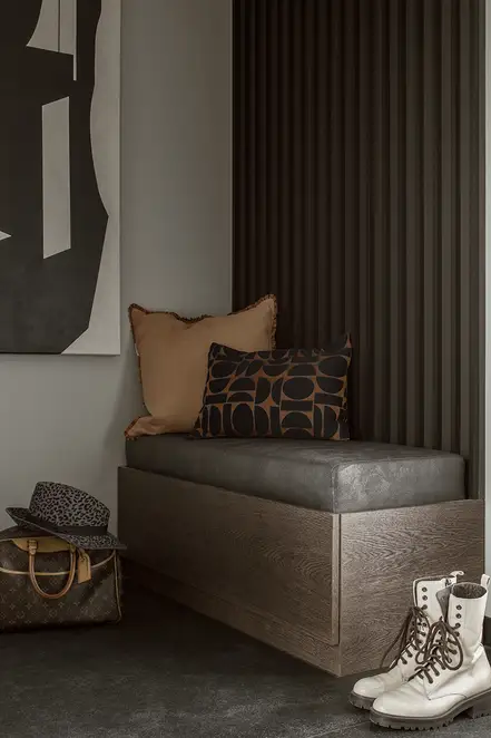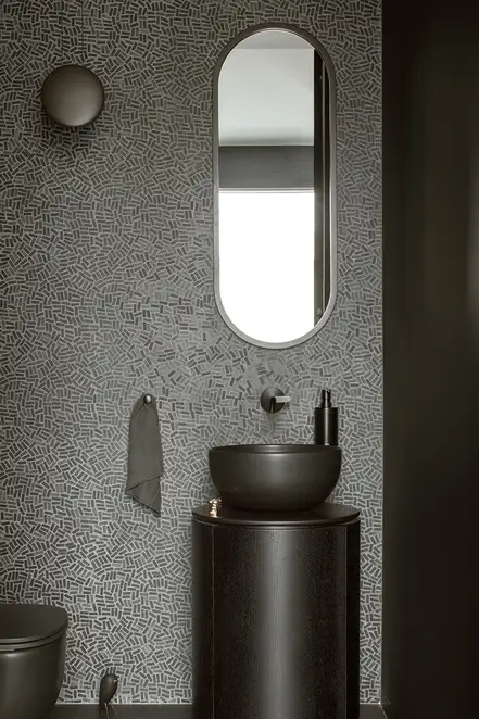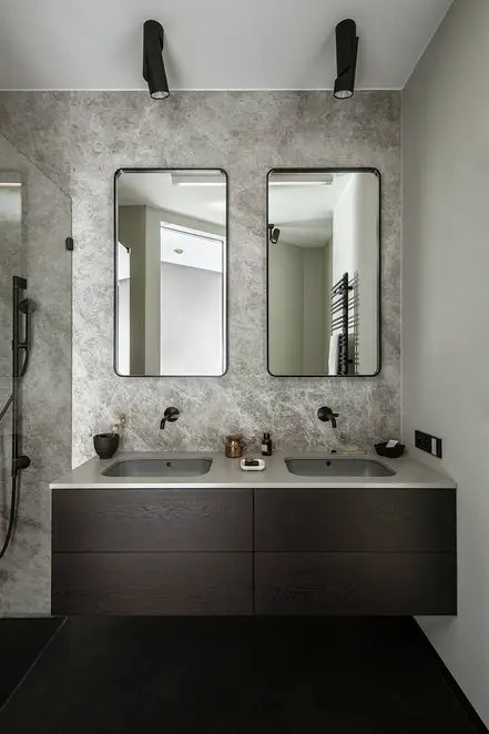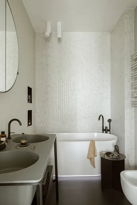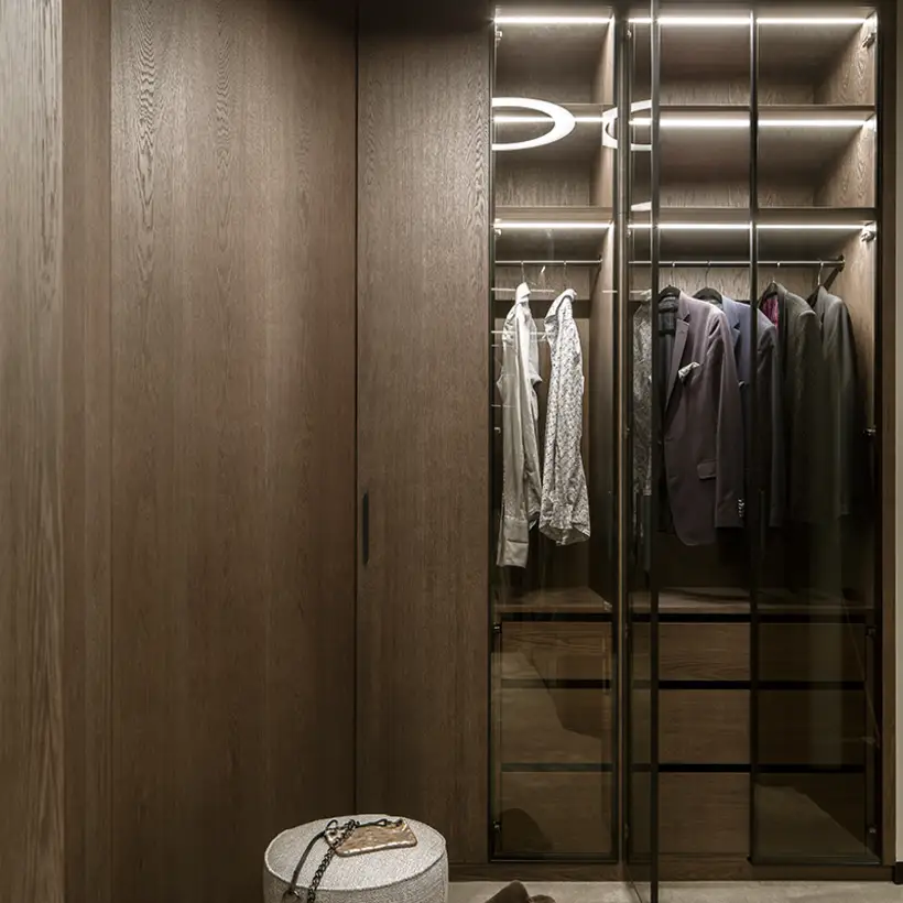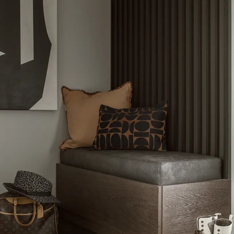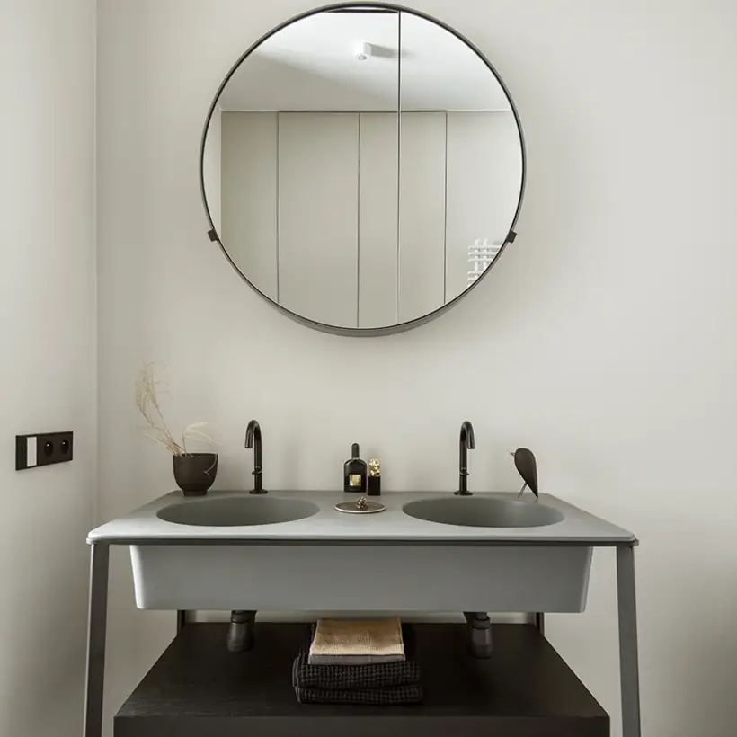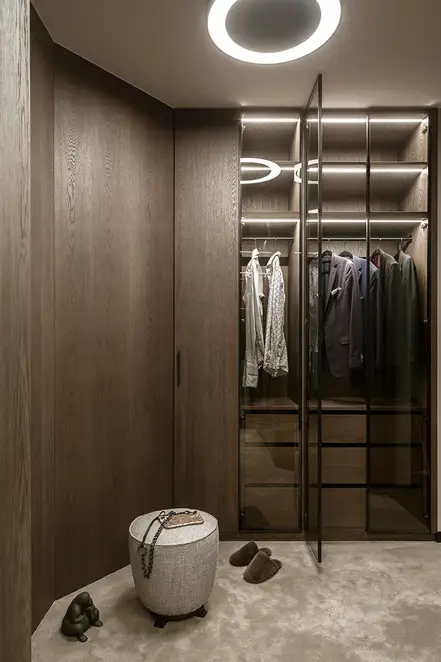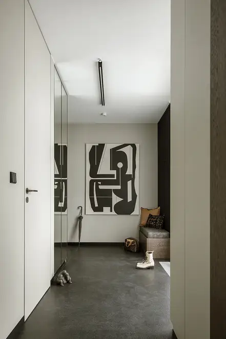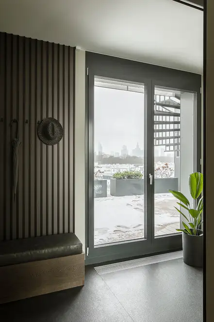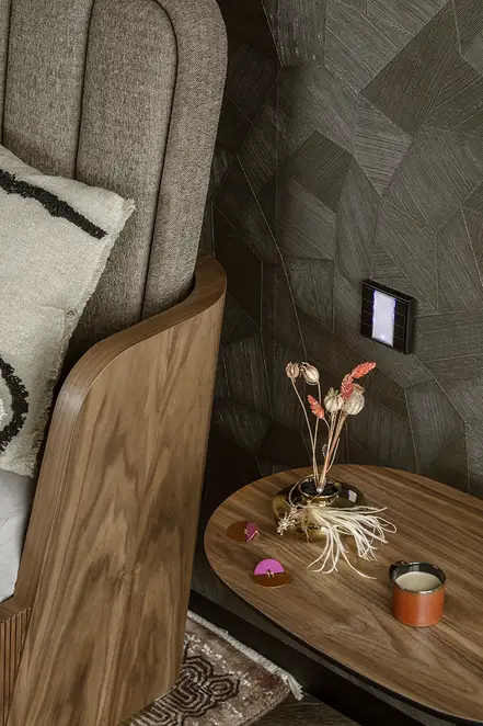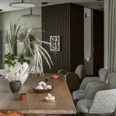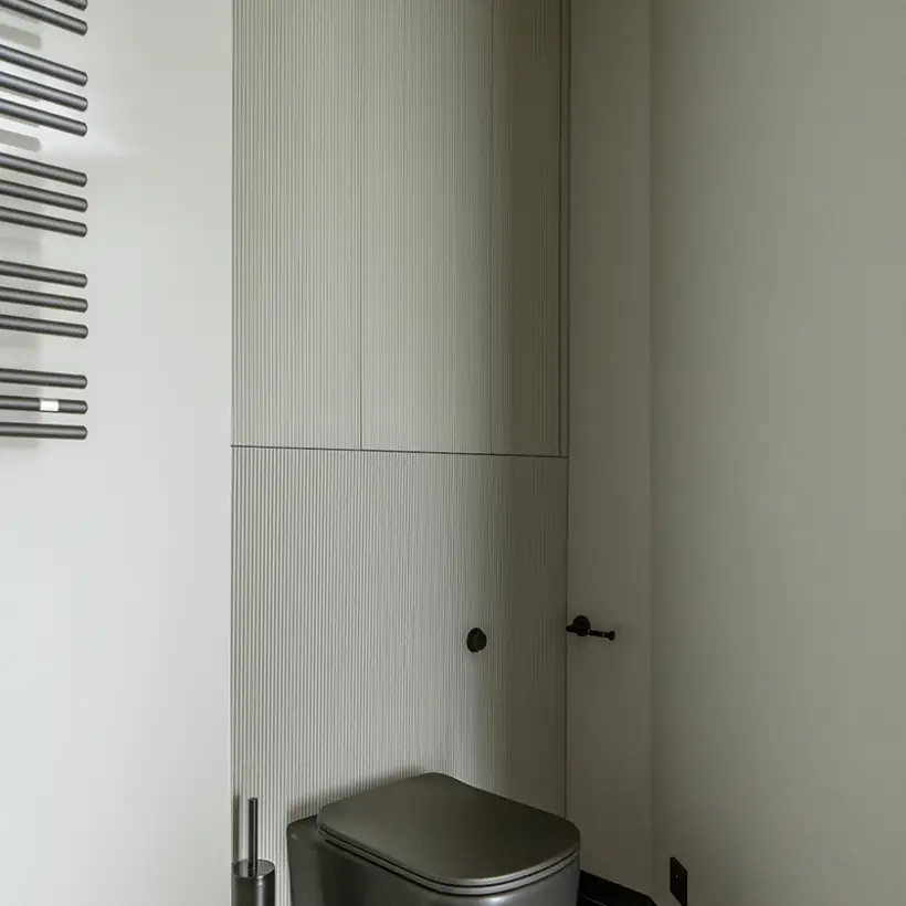 The sophisticate simplicity of the shapes is enriched with unobtrusive colours, delicate patterns and also with various textures: including patterned granite on the kitchen island, wood in a fishbone pattern on the floor and silk rugs. The furnishing consists of design classics, furniture from Polish artists and works of art. The details play the greatest role in this interior. Earth colours, beige and brown tones are complemented here by the black accents. In this connection, the switches, KNX push-buttons and sockets from the JUNG LS 990 range in matt graphite black are particularly striking. The matt colour fits perfectly into the room design and inserts itself harmoniously into the atmosphere. The KNX control with the F50 push-buttons from JUNG provides the highest level of operating convenience for the residents and had an absolute priority in this project.