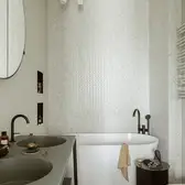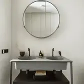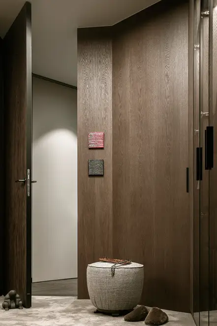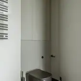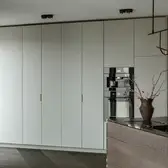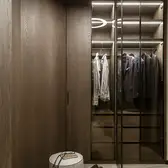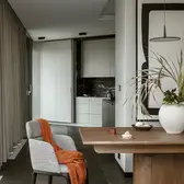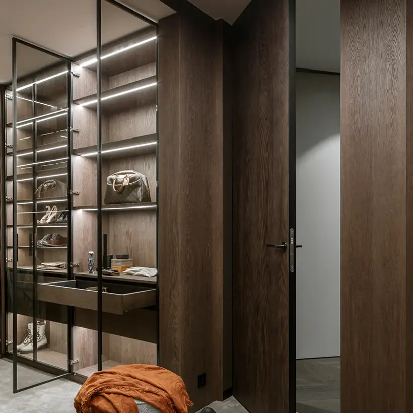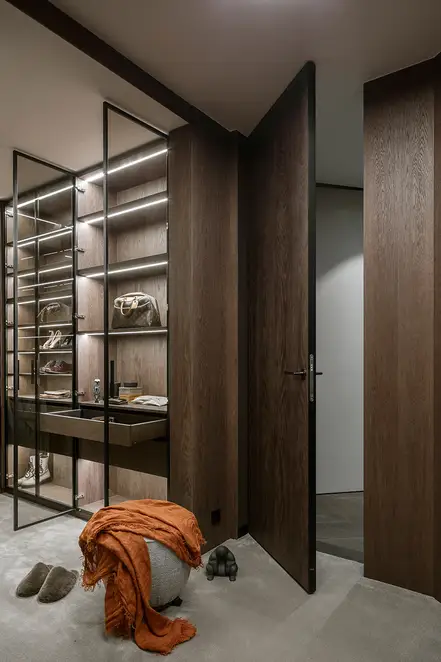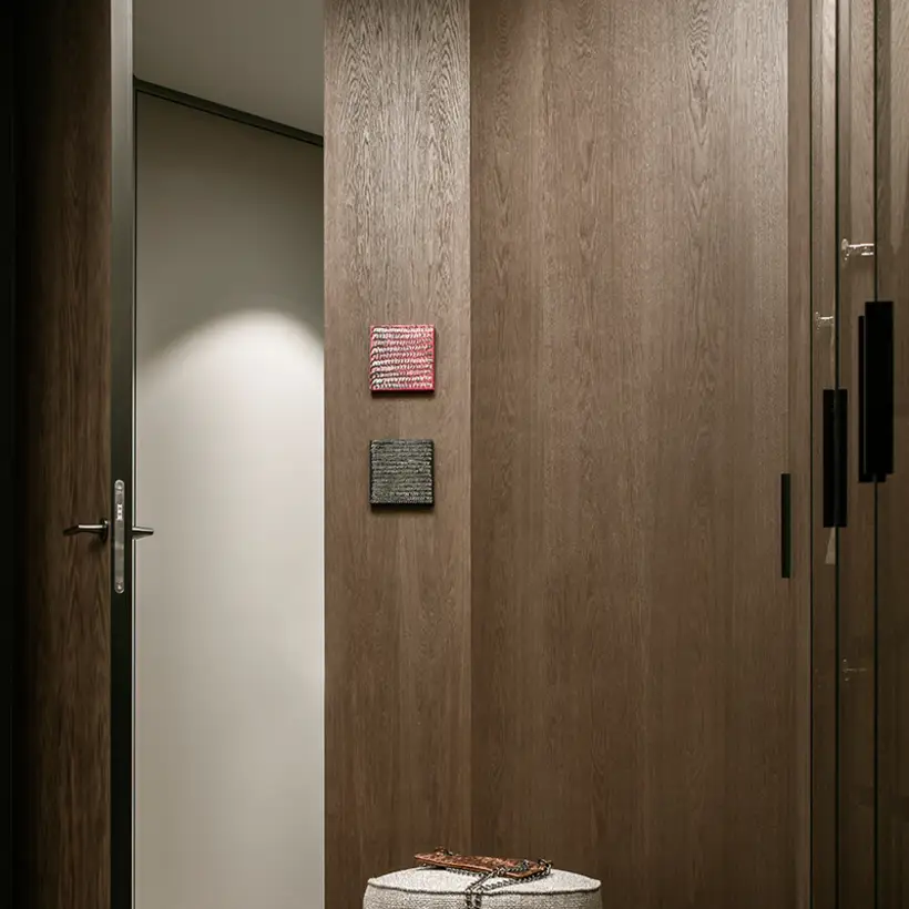 The interior plays with the height, which creates a feeling of release from daily life, and strengthens this with sight axes and the selection of colours and materials. The existing triangular ground plan with a high proportion of window areas posed a challenge for the allocation of the functions and rooms. Thanks to the sophisticated layout of the residential uses, there was space for a large living room with dining area and kitchen, a master bedroom area (bedroom with bathroom, changing room and access to a small terrace), a guest room, a large bathroom, a toilet and a utility room. The room height also presented a challenge. In order to raise this visually and increase the interior spaces visually, special measures were taken. This includes ceiling-high doors, suspended ceilings only where this is technically necessary, alongside wall panels with vertical slats and illuminated curtains, which disappear into niches above in the ceiling.