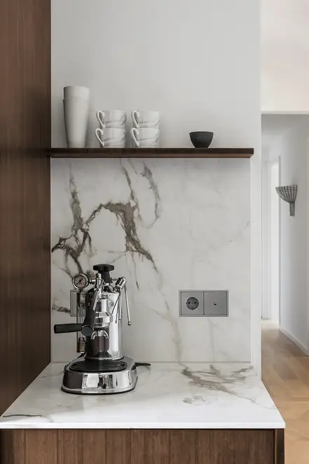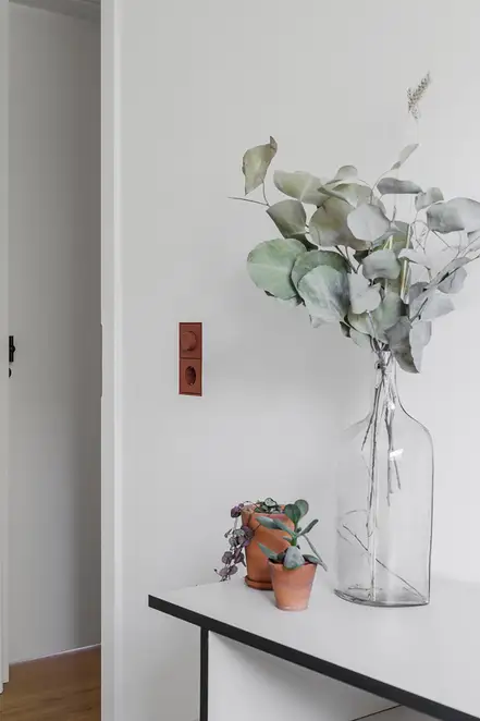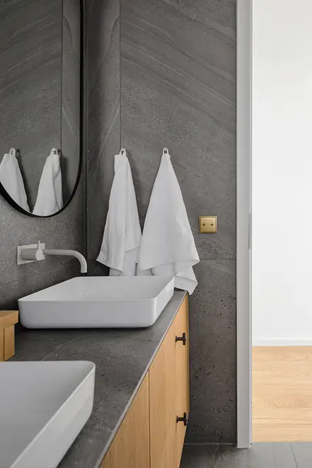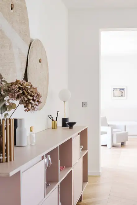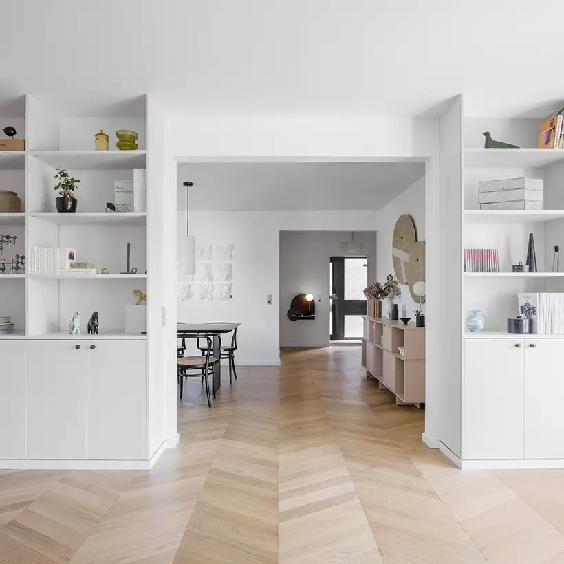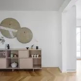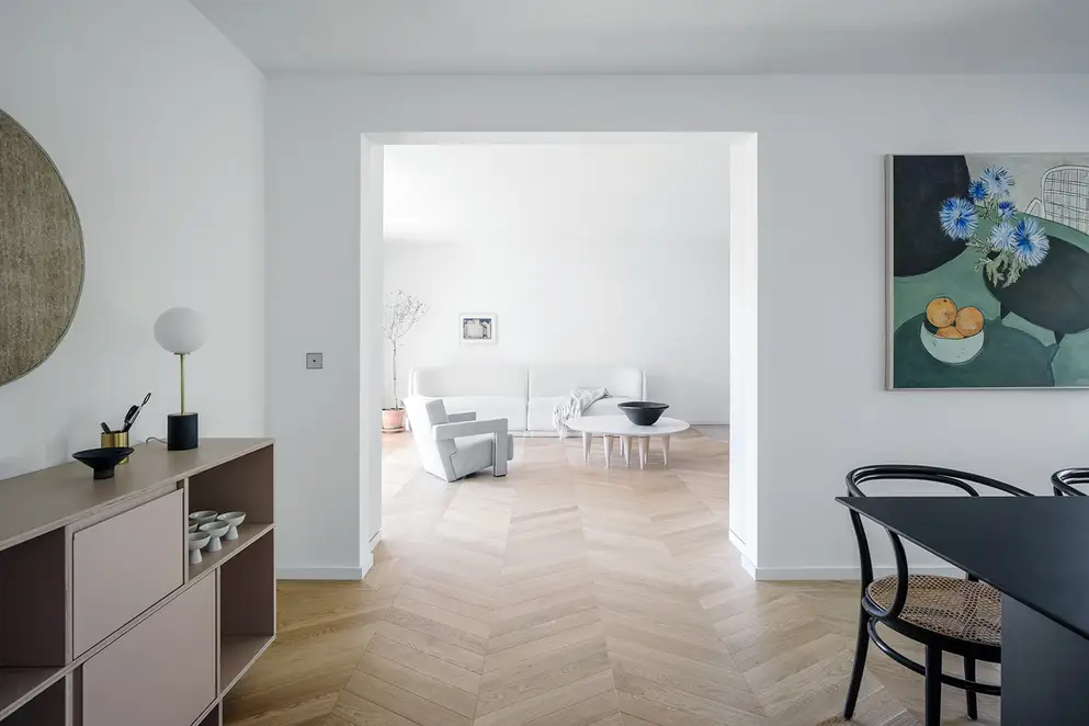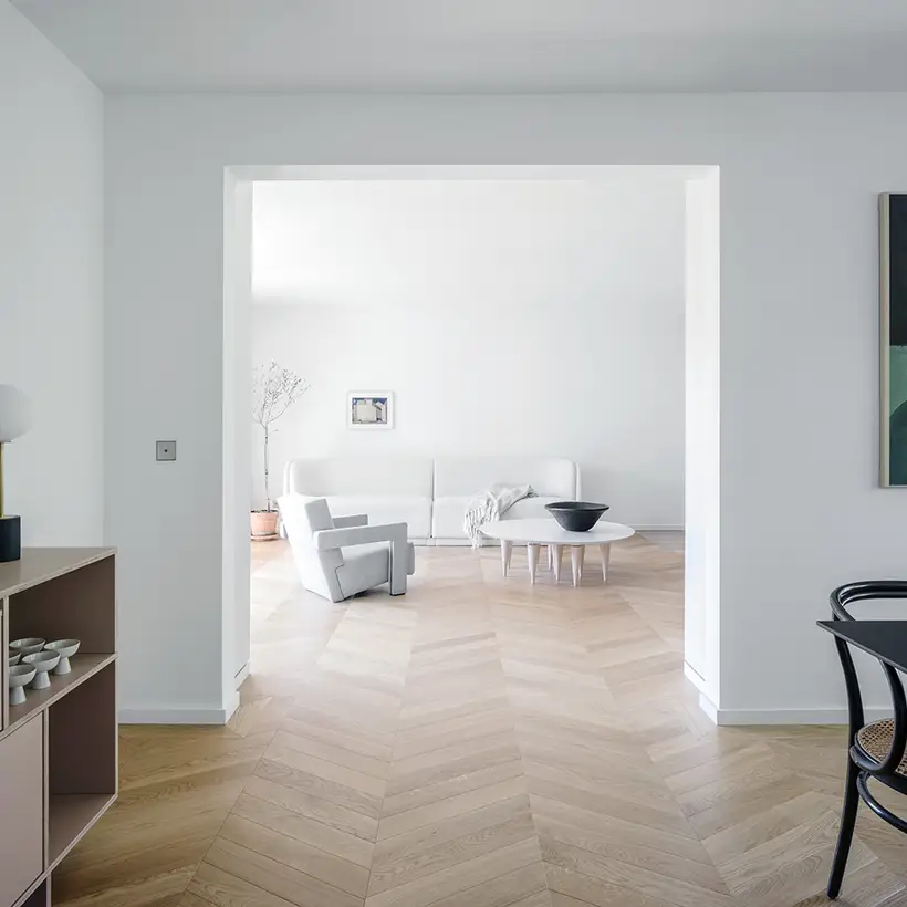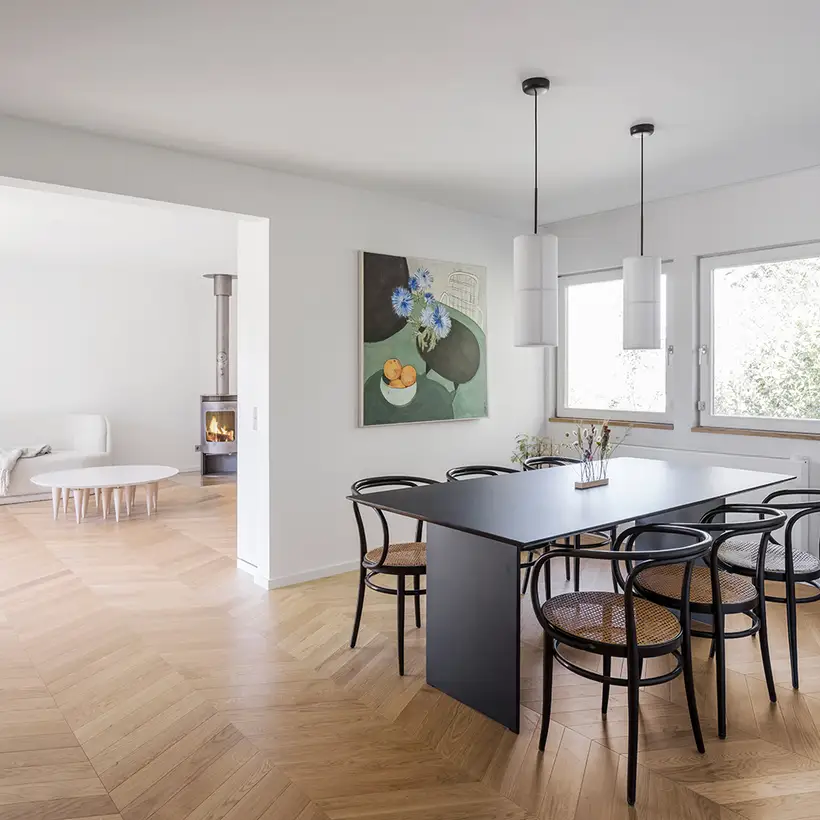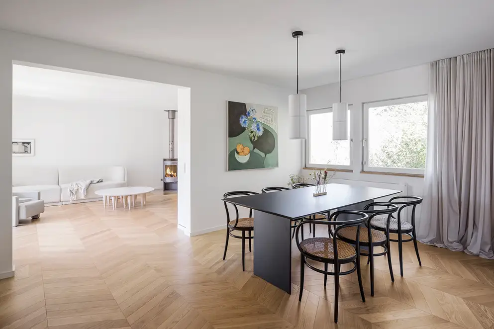 Before moving in, there was, however, a bit to do. Walls had to be taken out or moved, new doors were necessary, the old floors were worn out and needed replacing. To add to this were new electrics, new heating pipes and new sanitary ware. But the efforts have been worth it! In all parts of the building, the new interior now breathes with an elegance of the zeitgeist and a modern attitude towards life. The living room is connected to the dining room with a wide opening, the kitchen adjoins this, a corridor connects two children’s rooms, the parent’s bedroom and the large bathroom. The furnishings are composed stylishly of enduring classics and new design pieces. Elegant wall colours form the background. The kitchen and bathroom have become highlights: The kitchenette is finished in quality wood, the wet room in dark, natural stone.