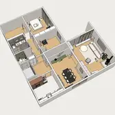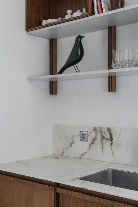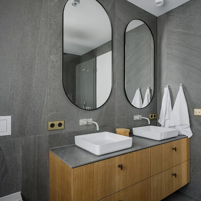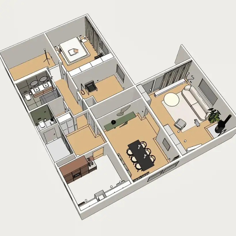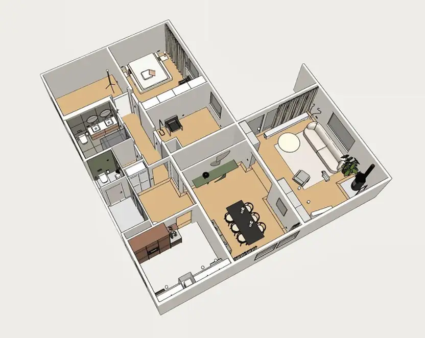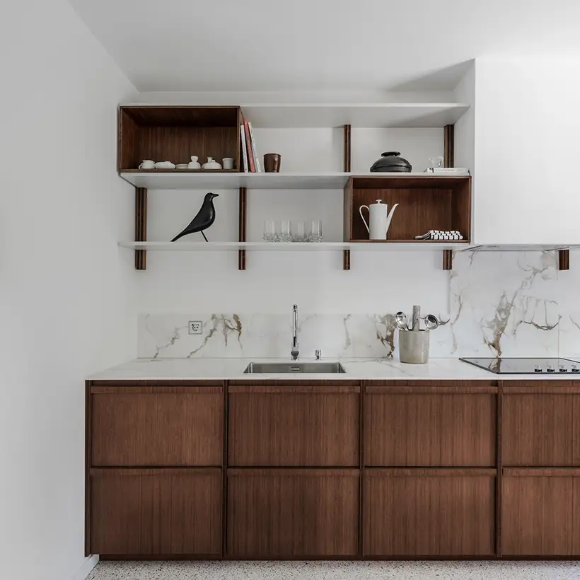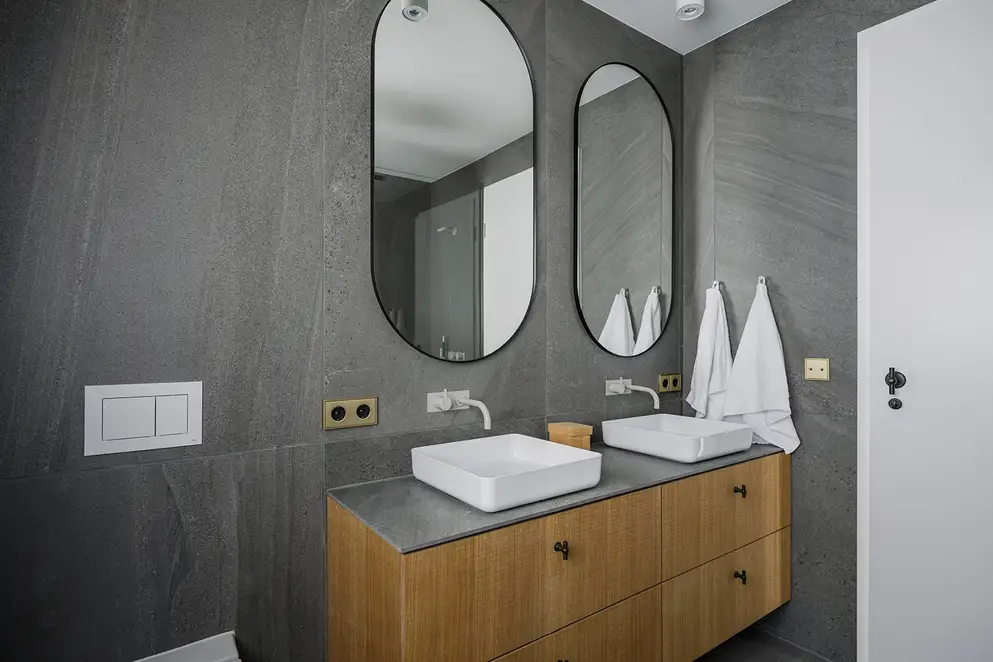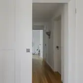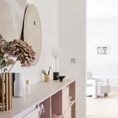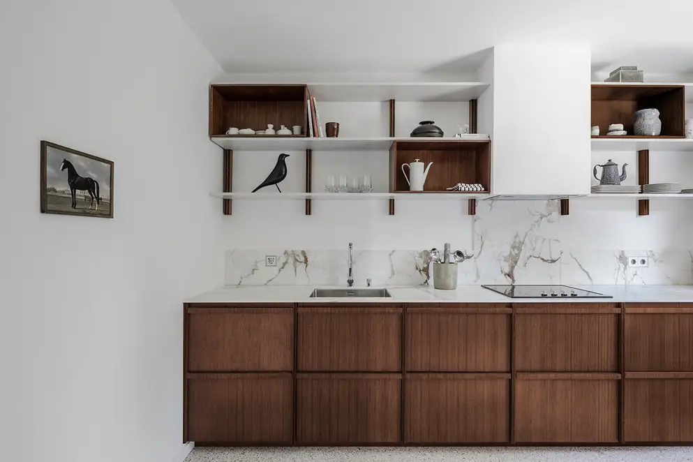 Before moving in, there was, however, a bit to do. Walls had to be taken out or moved, new doors were necessary, the old floors were worn out and needed replacing. To add to this were new electrics, new heating pipes and new sanitary ware. But the efforts have been worth it! In all parts of the building, the new interior now breathes with an elegance of the zeitgeist and a modern attitude towards life. The living room is connected to the dining room with a wide opening, the kitchen adjoins this, a corridor connects two children’s rooms, the parent’s bedroom and the large bathroom. The furnishings are composed stylishly of enduring classics and new design pieces. Elegant wall colours form the background. The kitchen and bathroom have become highlights: The kitchenette is finished in quality wood, the wet room in dark, natural stone.