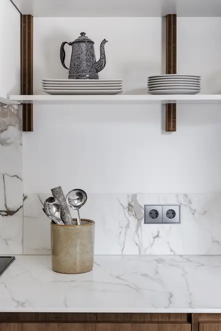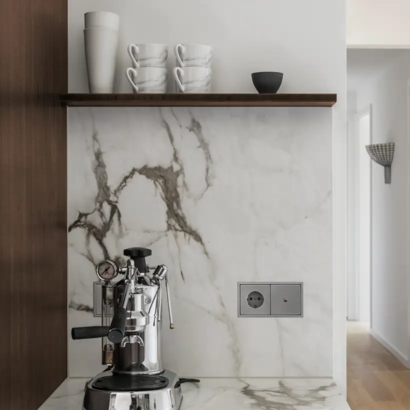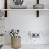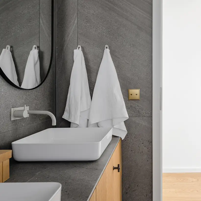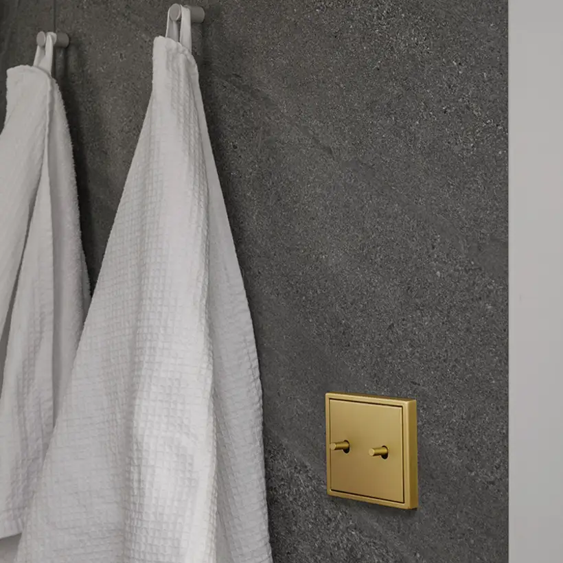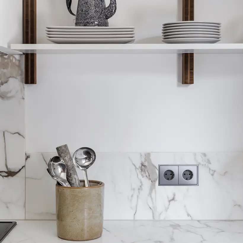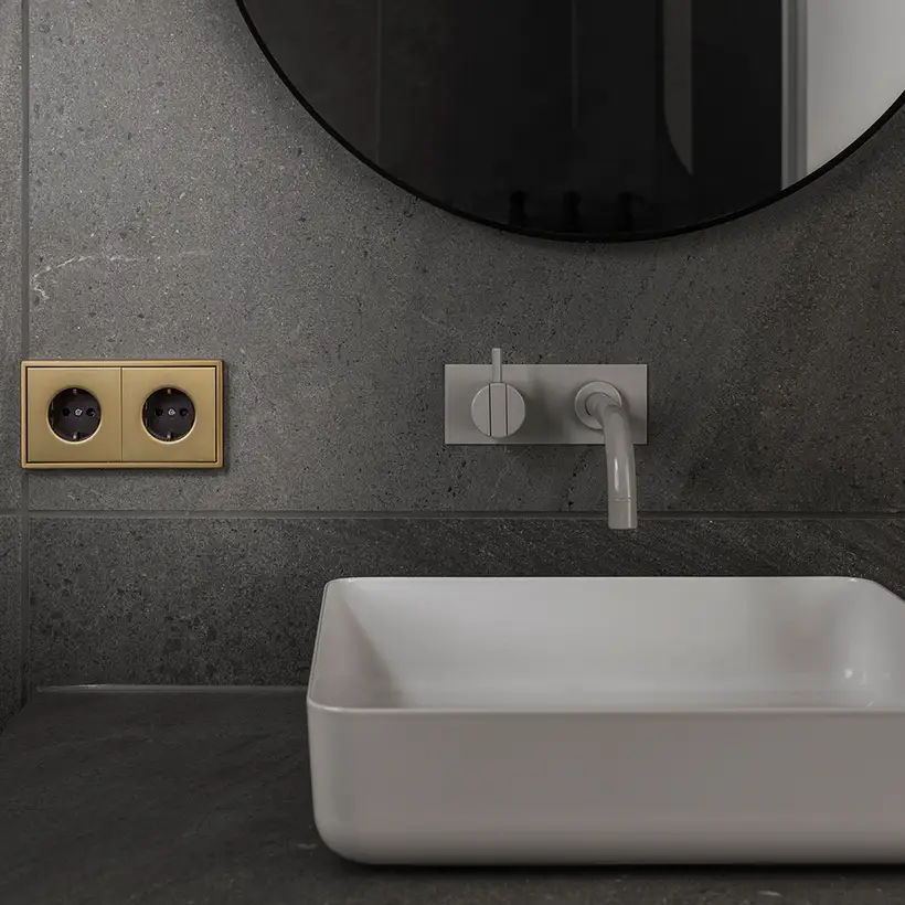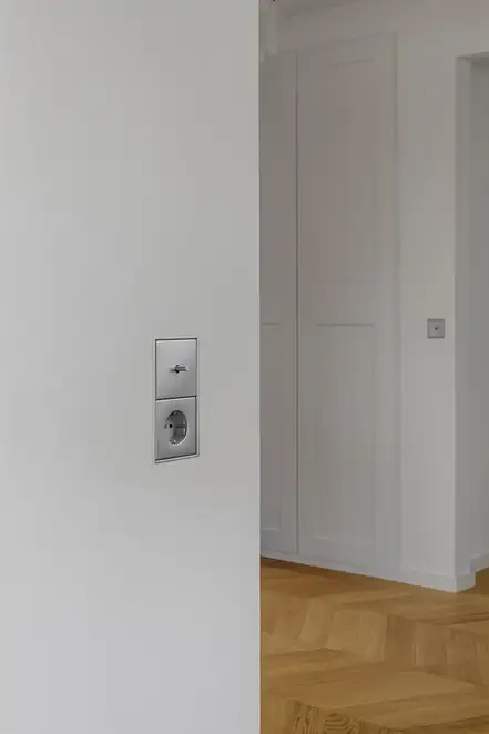 Based on the JUNG switch of the early years, the LS 1912 rocker switch turns the switching mechanics into a new experience. The switch mechanism is designed so that the cover closes flush with the frame. Only the rocker lever rises out of the unit as style element. JUNG transfers the many years of experience in metalworking into an elegant selection of materials – from aluminium, via stainless steel and brass to chrome.