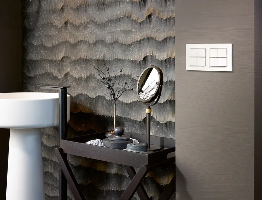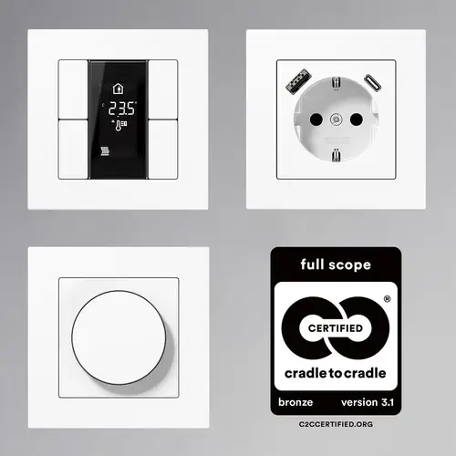 Puristici in thermoplast extralucido nei colori bianco alpino e nero, champagne e moca, nelle tonalità opache bianco alpino, nero grafite e antracite o in look alluminio: gli interruttori e le prese del programma A 550 convincono per il loro carattere e la loro funzione.
