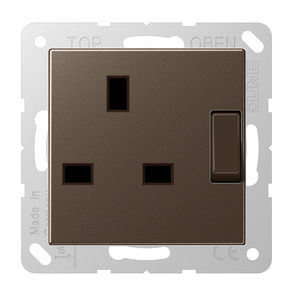 Switched socket, British Standard, 13 A 250 V ~, with contact protection, screw terminals, A range, mocha