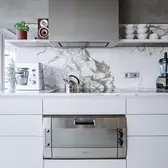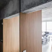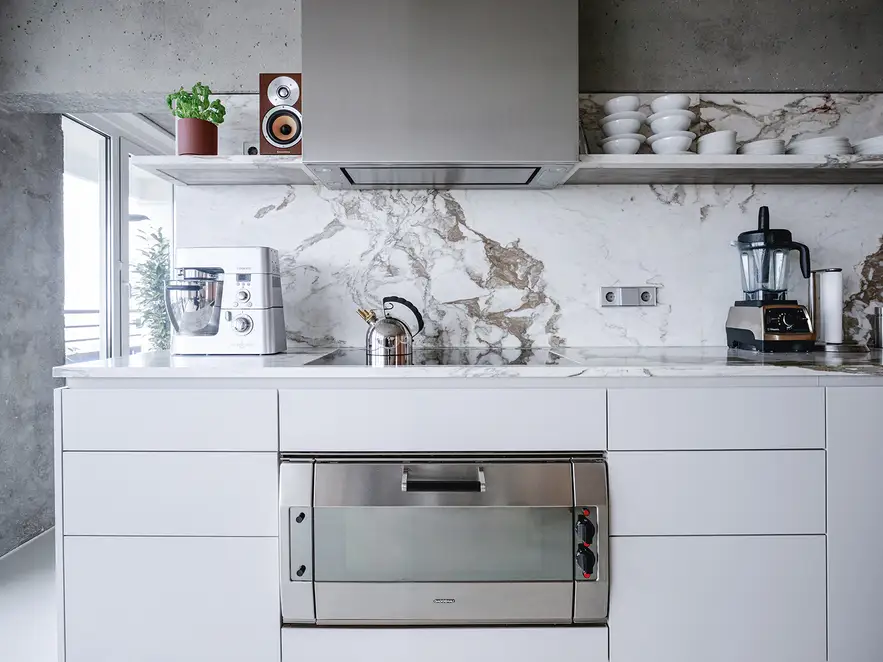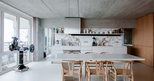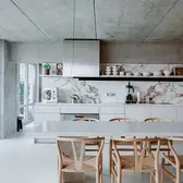 The architect has skilfully paired his neo-brutalism with select materials, however, and high-quality details. The worktop and back wall of the kitchen units are of white marble, while the warm, bright oak fixtures form a sensitive contrast to the other exposed concrete surfaces. Last but not least, the switches and sockets from the JUNG LS 990 range provide visual and tactile features in aluminium. Where no flush-mounted installations were possible, or the nature of the furnishings did not allow this – on the exposed concrete walls, for example –Sitzler opted for the corresponding surface-mounted LS Cube model. This has resulted in a totally contemporary, urban interior that is wholly suited to the lifestyle of this home builder and architect.