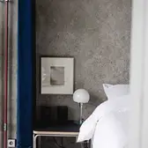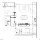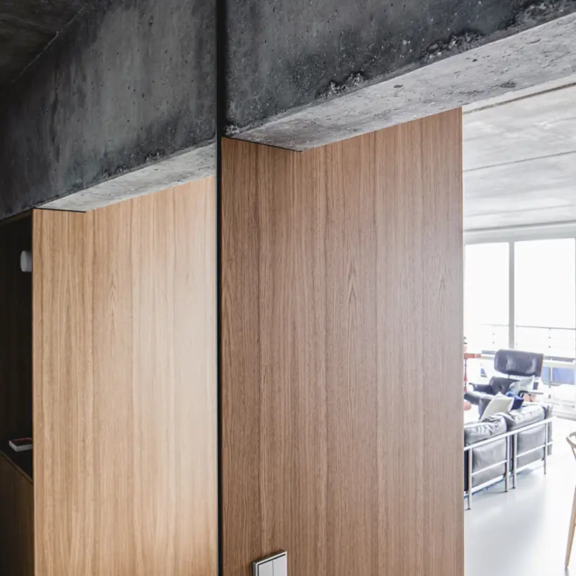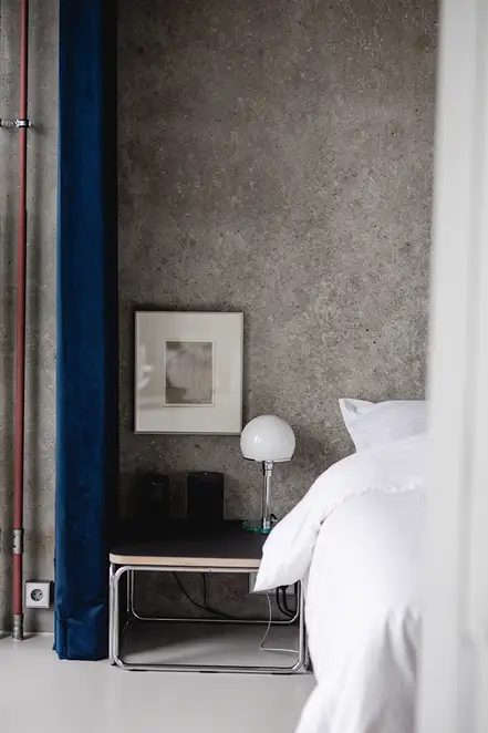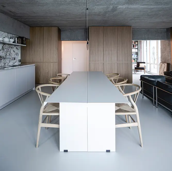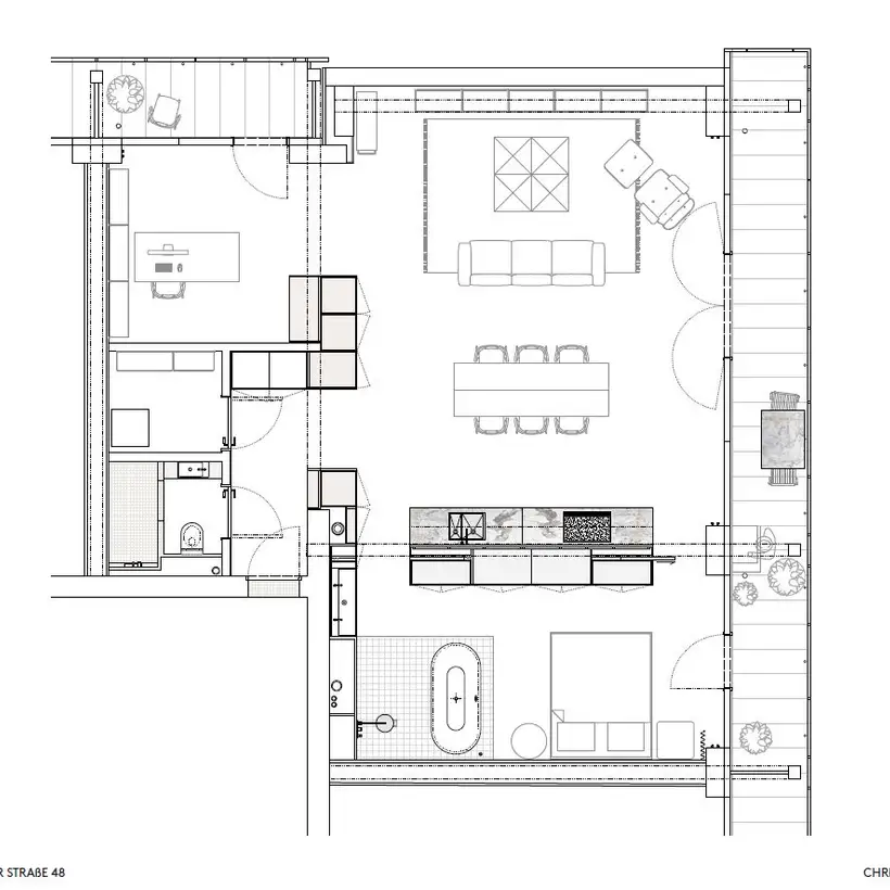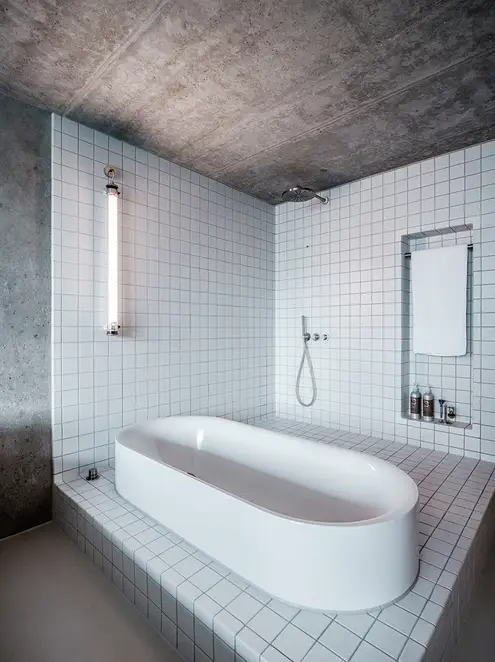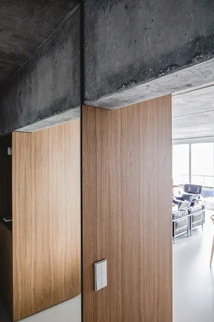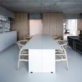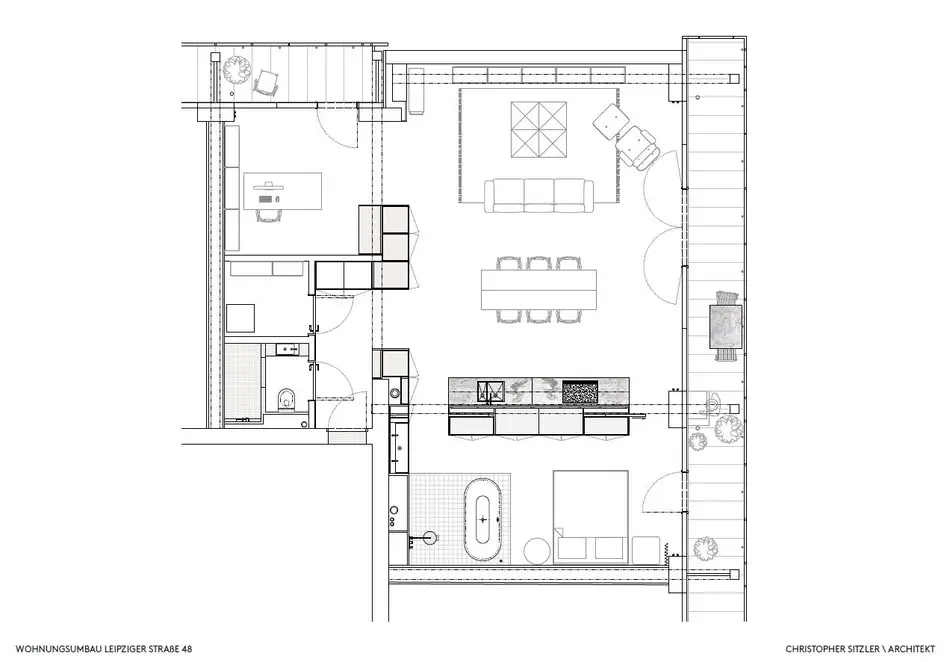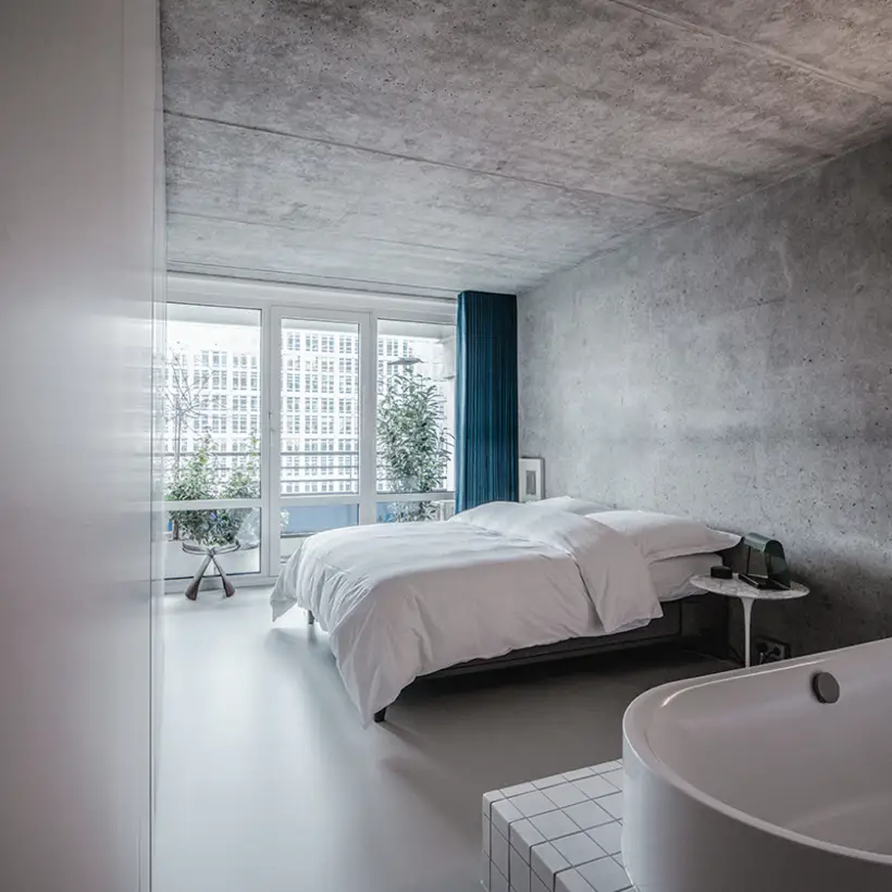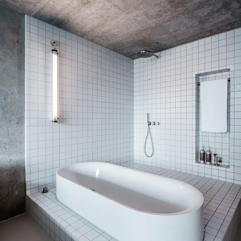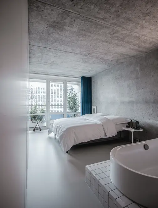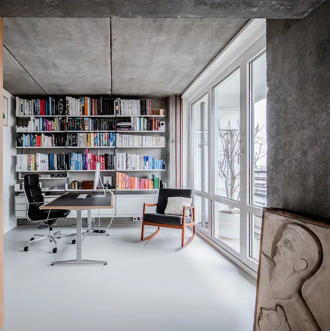 There is nothing left of the original layout and spatial design of this apartment. Sitzler has radically stripped the flat down to its supporting structure. Some mighty concrete beams have come to light in the process. They now follow the new floor plan lines, supported by a few wall fixtures and space-creating cupboard elements. In the entrance area a storage room has been created along with a small bathroom with WC. The most space in the floor plan is taken up with the living and eating area with its open-plan kitchen. It extends seamlessly round the corner into the workroom. The movable furniture on the other hand is almost entirely made up of classic pieces by Dieter Rams, Hans Wegner, Le Corbusier and Fritz Haller. The architect’s private retreat – a combined bedroom and bathroom – is separated by two sliding doors. As well as the bed, the bathtub and shower is set out on a platform with square, white, swimming-pool tiles. Sitzler has successfully made a real statement with this. The open wet area consistently carries forward the stern and minimalist design of the apartment.