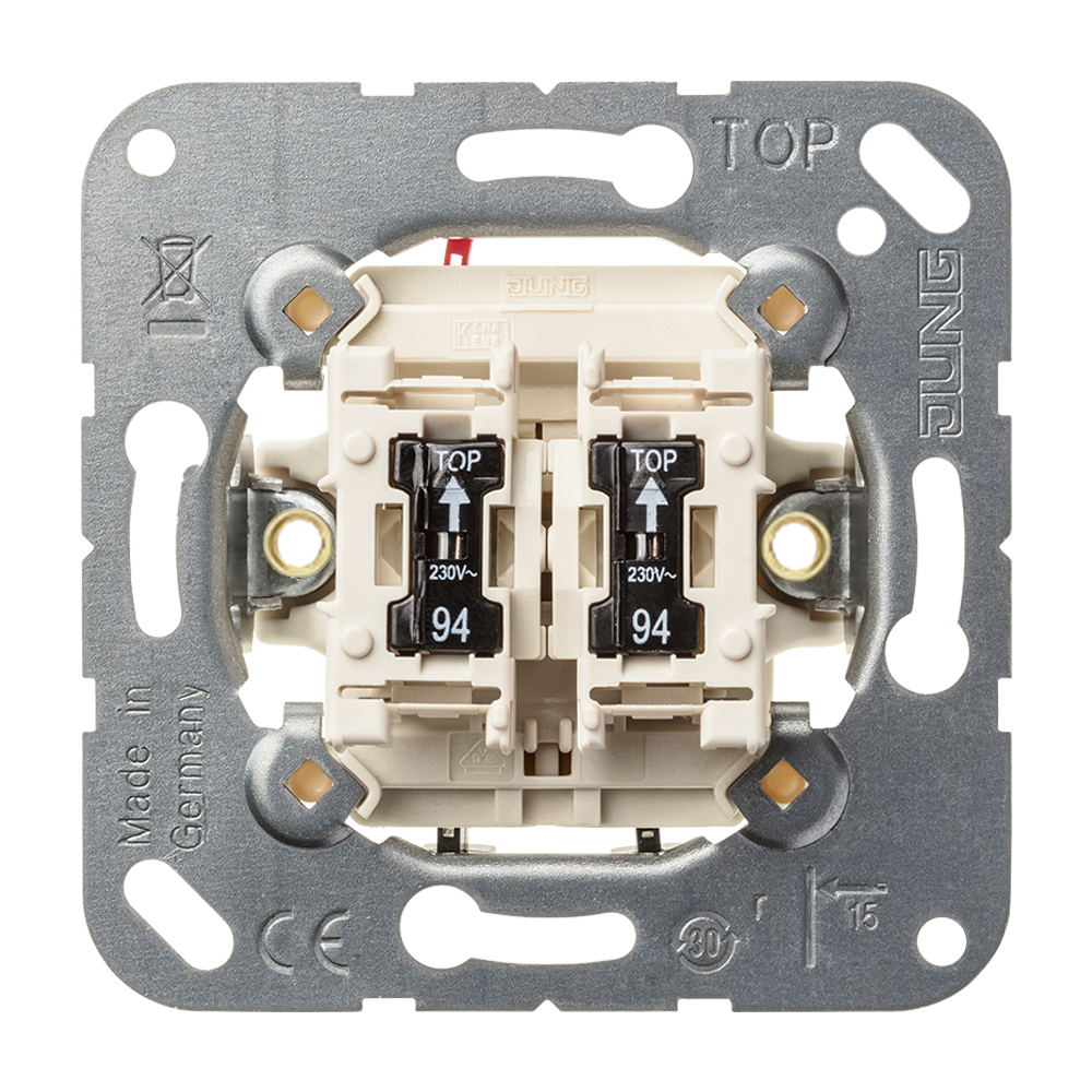 Impulsdrukker 2-voudig, 2 maakcontacten inclusief 2 glimlampjes art.nr. 94, zonder bevestigingsklauwen, 10 A 250 V ~