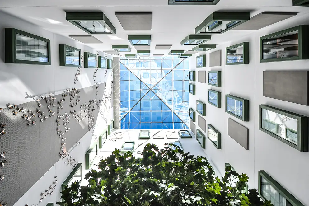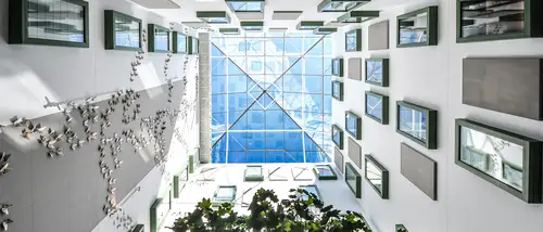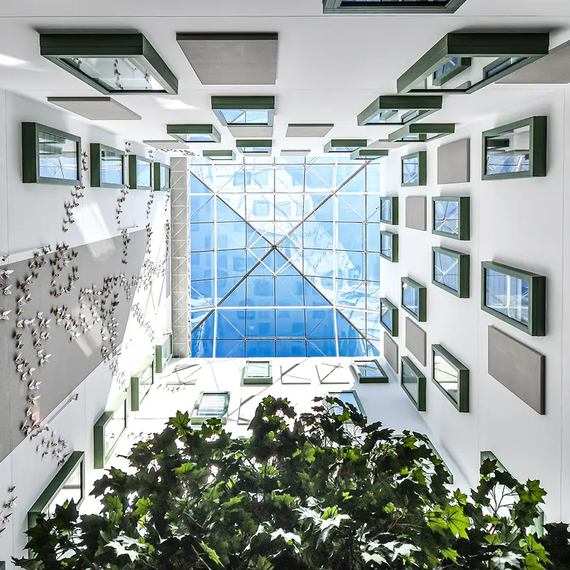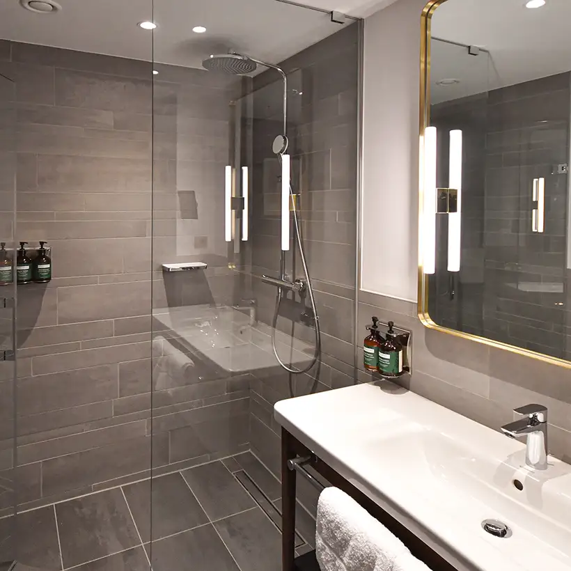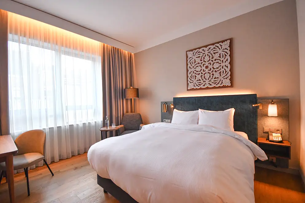 Een transformatie van statig bankgebouw naar lifestyle hotel is geen gemakkelijke opgave. Bovendien is een hotel pas rendabel als de gasten komen, een korte bouwtijd is altijd het streven. Verantwoordelijk voor de technische installaties was het Haagse bedrijf Steegman Installatietechniek B.V., dat al vele jaren ervaring heeft in de hotelsector. Hoe groter het hotel, en hoe meer kamers, des te belangrijker het is om een strakke planning aan te houden. Het voordeel bij veel kamers, die qua voorzieningen en elektra dezelfde structuur hebben, is de kracht van de herhaling. Om de vaart erin te houden koos Steegman voor al het schakelmateriaal in de kamers voor JUNG Stekerbaar (plug+go) in A 550, waar nodig uitgevoerd met brandwerende inbouwdozen. Voor dit grote project heeft JUNG de A 550 ramen speciaal gelakt in de kleur champagne.