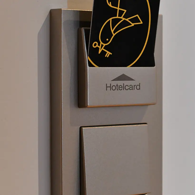 De hotelcardschakelaar, ook in het design van A 550, zorgt voor automatische energiebesparing. Als de gasten de kamer binnenkomen, geven zij de stroom voor de kamer vrij door hun hotelcard in de schakelaar te steken. Daarna kunnen zij alle verlichting naar wens in- of uitschakelen. En zo gaat de verlichting ook vanzelf weer uit als de gasten de kamer verlaten.