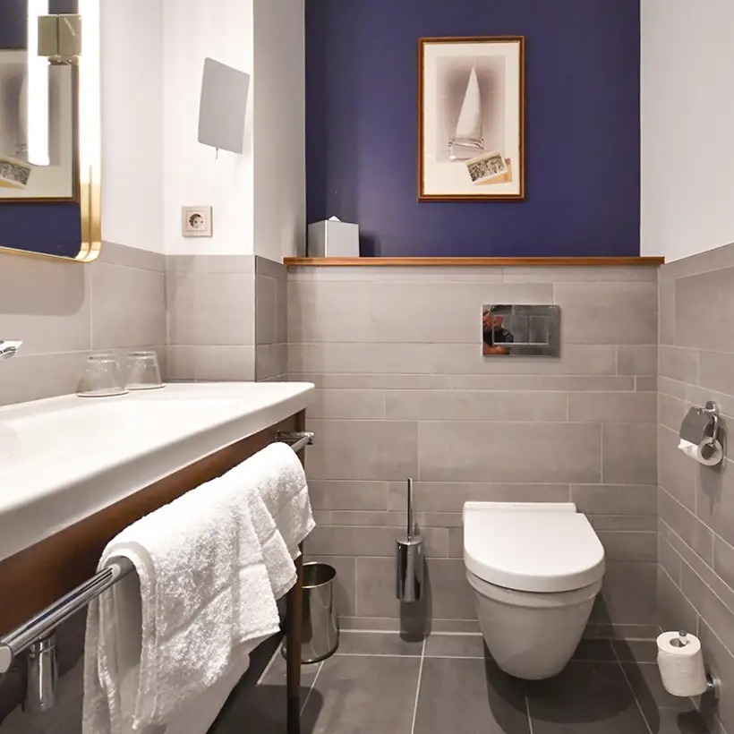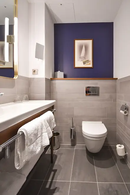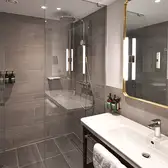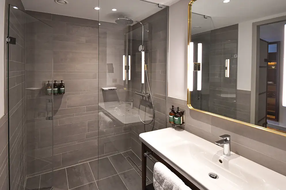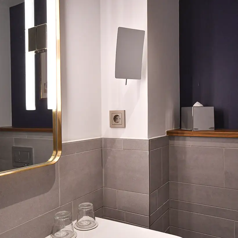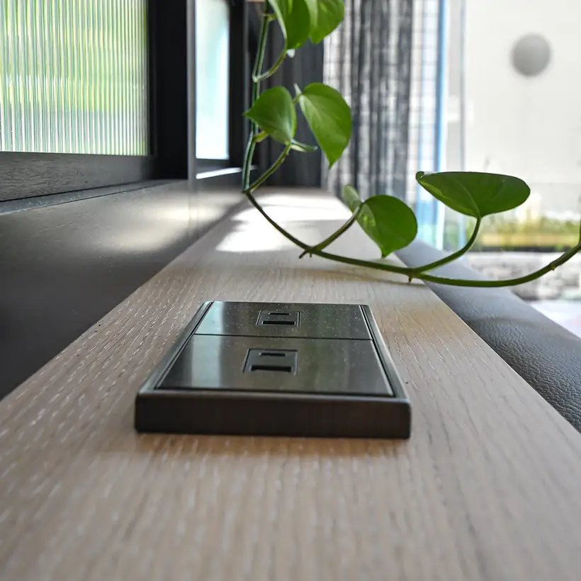 Om de luxe van de hotelkamers extra jeu te geven is het JUNG programma A 550 toegepast in de kleur ‘champagne’, waarbij de ramen speciaal voor voco™ hotel geproduceerd zijn. Het bijzondere van deze champagne tint is dat de kleur zich lijkt aan te passen aan de achtergrond en de verlichting in de omgeving. Zoals ook te zien is op de foto’s oogt het schakelmateriaal warmer bij donkere achtergrond en koeler bij een heldere omgeving.