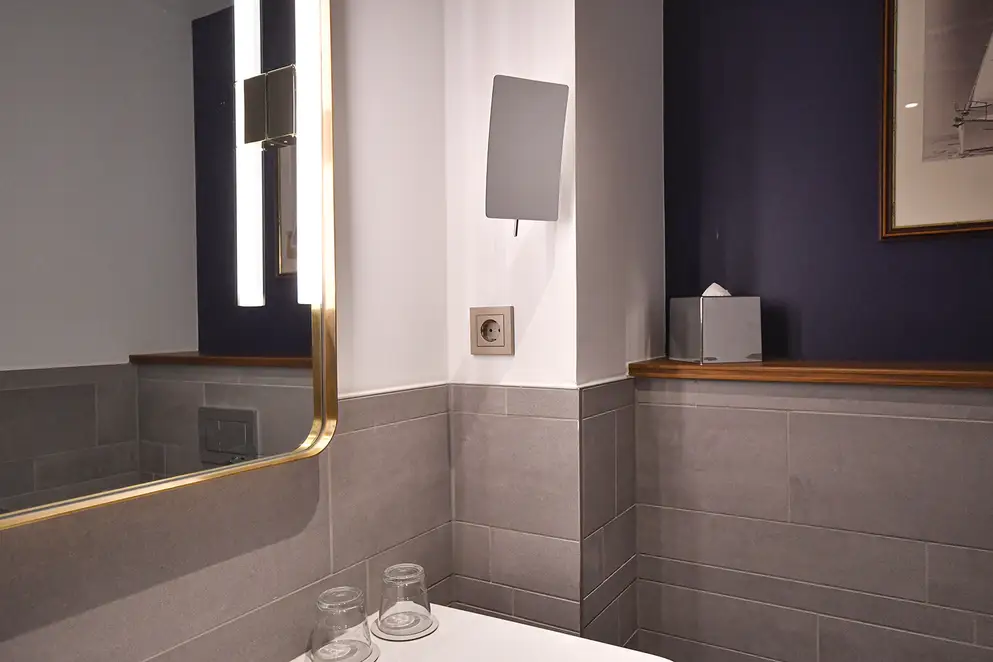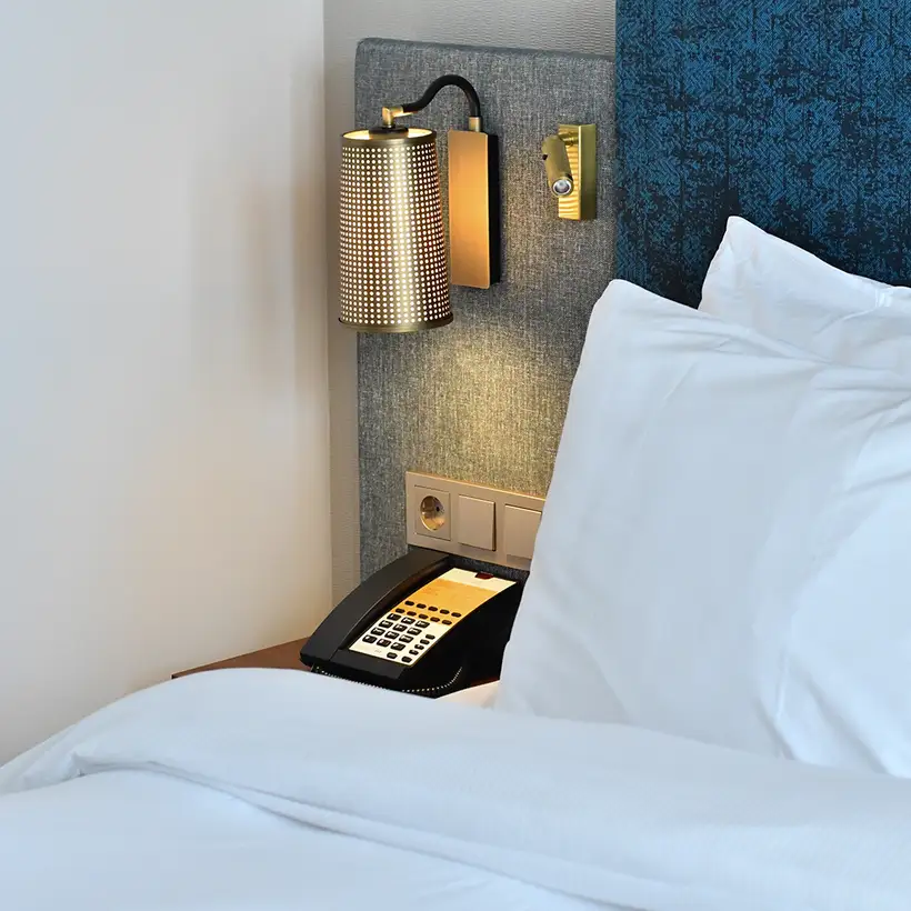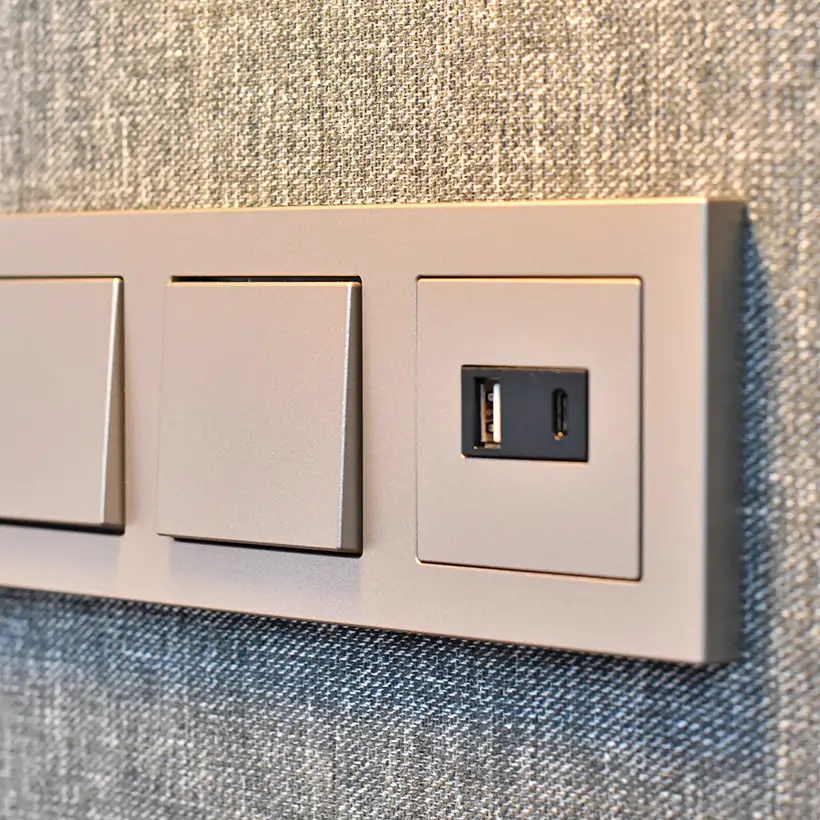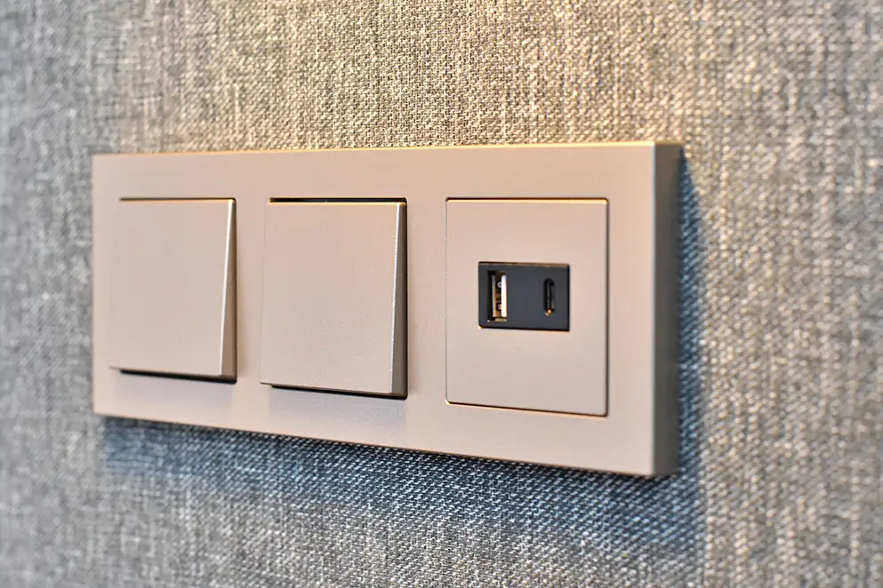 JUNG heeft voor alle 204 kamers schakelmateriaal geleverd, inclusief inbouwdozen, aansluitsnoeren en stekkeraansluitingen. Juist omdat de units in alle kamers gelijk zijn, aan de ene kant van het bed twee schakelaars voor de verlichting en een laadcontactdoos voor mobiele apparaten met USB A en USB C, en aan de andere kant van het bed twee schakelaars en een contactdoos, kon er razendsnel afgemonteerd worden. Daarna diverse (laad)contactdozen, een aansluiting voor de tv en natuurlijk de onmisbare Hotelcardschakelaar. Hierna konden de wanden dicht, en zo ging Steegman stapsgewijs alle 204 kamers af.