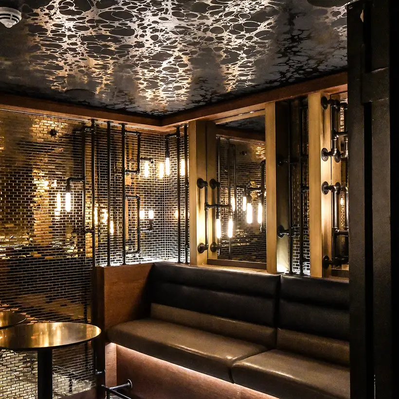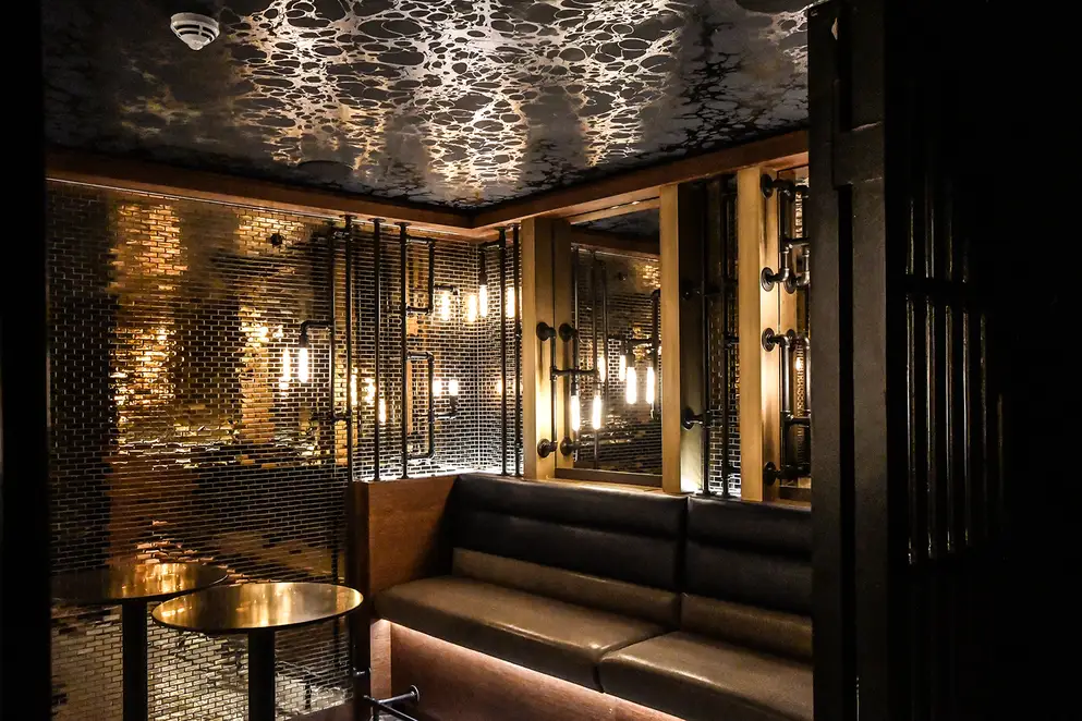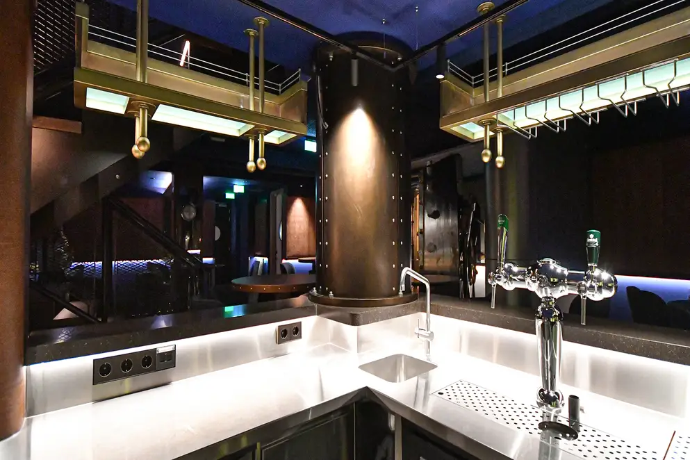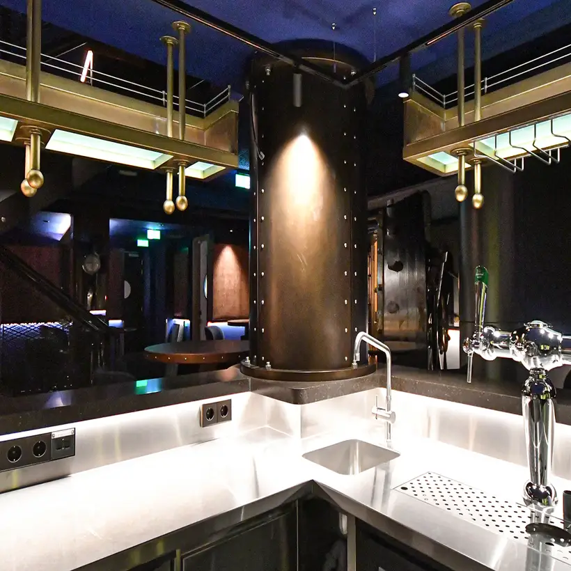 Voor de cocktailbar is uitsluitend de warme tint Messing klassiek gebruikt, die naadloos aansluit bij de donkere maritieme sfeer van de Ultramarijn Wonderbar.
