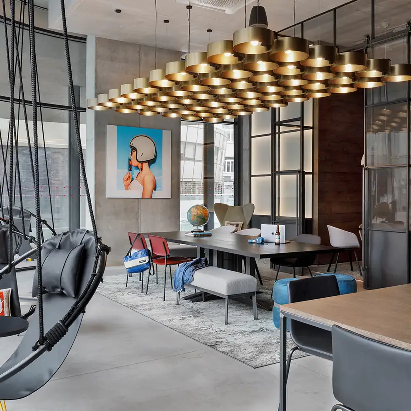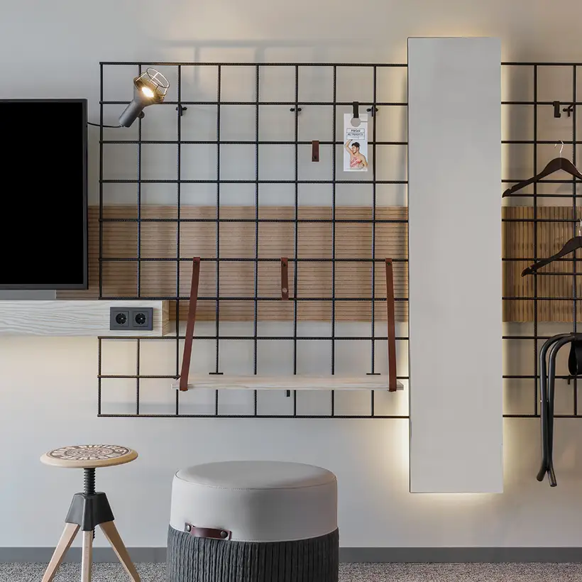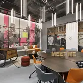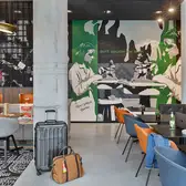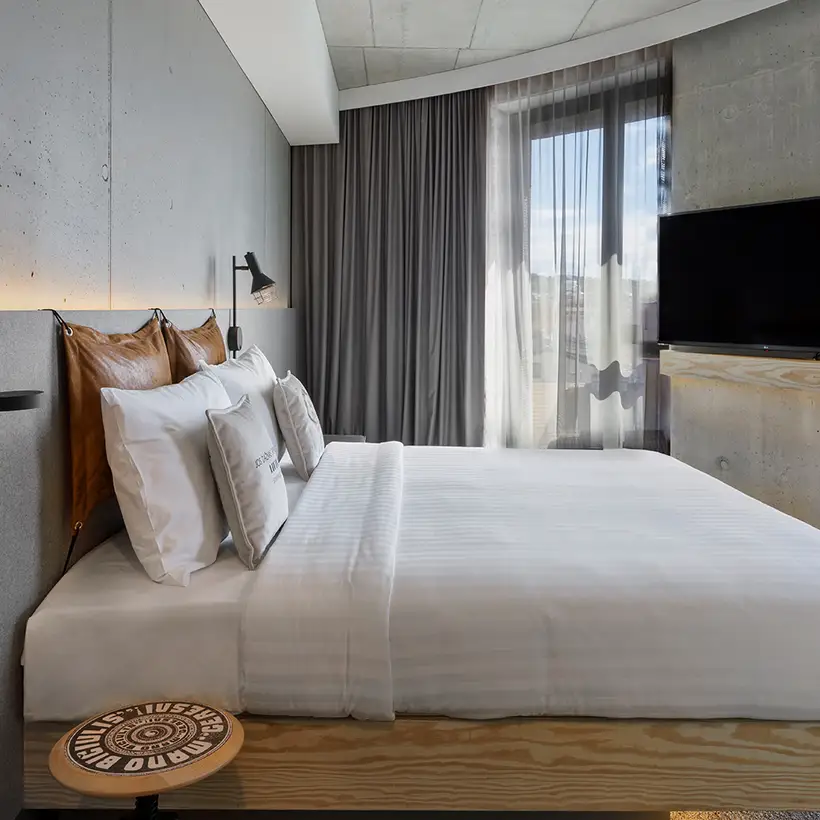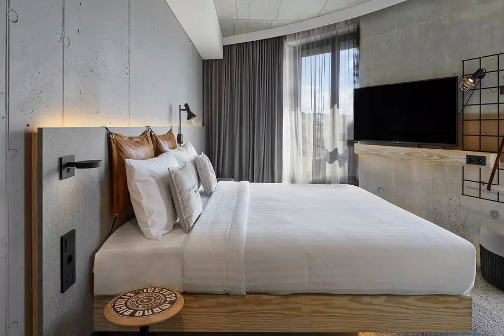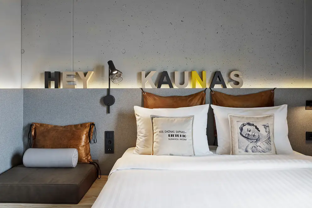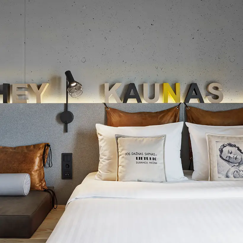 The interior of the hotel is characterised by lively and contemporary furnishings. A large lobby flooded with light, which also serves as the lounge with a large bar in the middle, serves as the central and convenient meeting place. Spacious common areas with graffiti, drawings and photos, minimalist furniture, industrial-style lighting and colourful details convey the impression of a young, urban hotel in contemporary style. The first storey, designed with an industrial look, reveals more about Kaunas itself: visitors are greeted with pictures on the wall that show various details of the Lithuanian city.