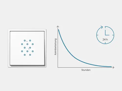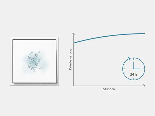 Onde muitas pessoas se juntam, o risco de infeção por bactérias, vírus ou outros germes também é elevado. A tecnologia de materiais SILVERPLUS® da JUNG ajuda a reduzir esse risco.